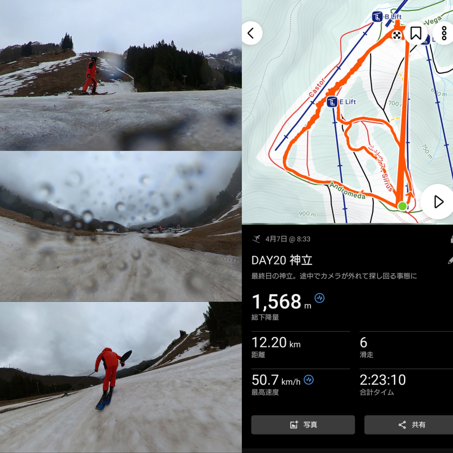 2026/4/7(火) 2025-26シーズンやっとDAY20th。 12月1日から使用開始の湯沢町民パスも今日で終わり。4ヶ月のお役目終了で、この後はガーラの一般か、かぐらの町民パス用優待券となります! そして神立も今日で終わり。なんだかんだと雪が保った気がします。午前中、中抜けってことで、スキー場へ。 駅前もガラガラ。かぐら田代行きバスも、神立シャトルも余裕で座れますが、週末のかぐらは混むんでしょうね。 神立最終日。もうAリフト下は滑れず、下山はリフトです。まあ、雪面は汚れ汚れですが、4月なのですから物好きしか滑りに来ません。 さて、ゆるりと滑りますか。 最終日ですが、昼から雨予報です。さっさと滑ろうとペガサスからのペルセウス、そしてプロキオンからのポルックス。 ペガサスはさすがのストップ雪で妖怪板掴みが大出現していますが、プロキオンからのポルックスは、凍っているところが所々。そこは走ります。 ポルックスを滑っていたらカメラが雪面にあたって外れて行った。すぐ止まって戻ったものの見つからず。 リフトで戻ってトレースしても見つからず。もう一本行ったら、ぶな塊の皆さんがコブを滑っていて、...