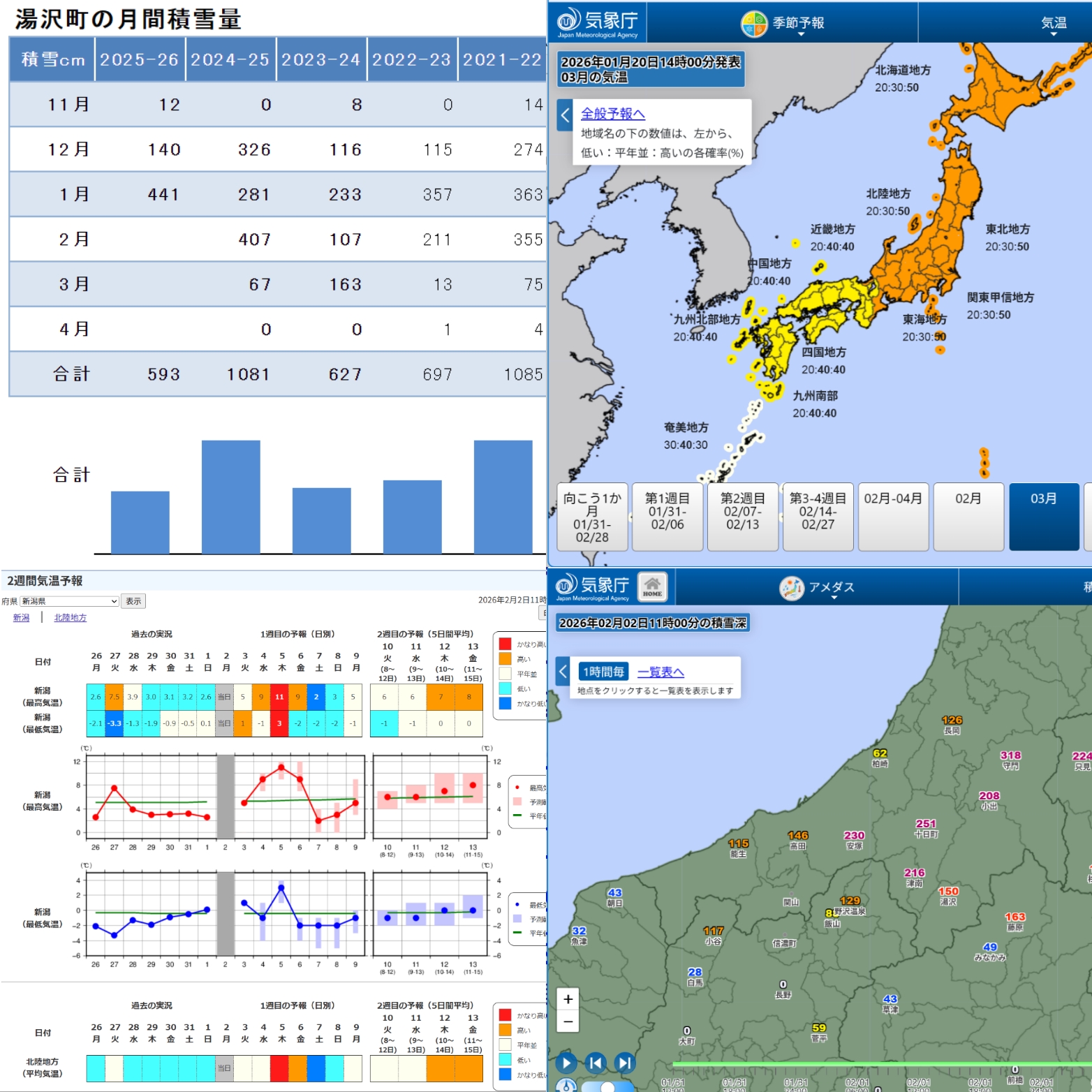 2月に入りました。秋頃、軽いラニーニャ傾向が春まで続くので、平年並みの冬だろうと投稿してましたが、12月が一昨年より多いものの、平年に比べると少なく小雪かとビビッてましたが、1月の積雪が締まってほぼ平年並みに。さすがに一昨年の年間積雪量には二日分足りませんでしたが。。1月が441㎝も降ったので、3年振りに年10mを超えた昨年の607cmに迫る581cm。2月は平年並み、3月は平年より暖かい予報が出ています。湯沢の平年値1,06cm、昨年値1,081cmに肉薄してくれるかも知れません。https://ift.tt/B0zPkXV Uploaded by 鷲津 数聖 2026-02-02T07:20:29.000Zvia Facebook https://ift.tt/UkT1s7r