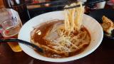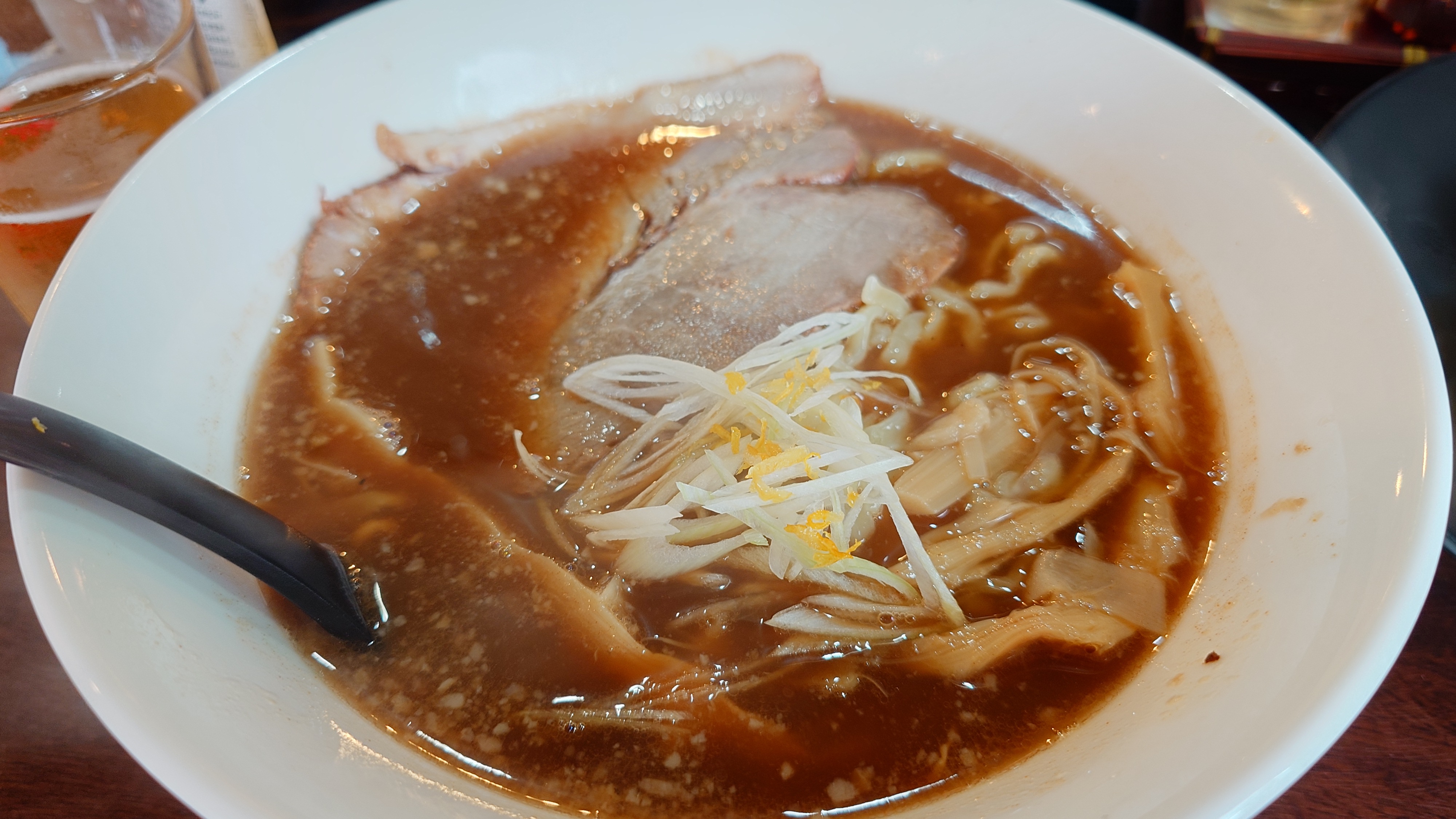そして、煮干しラーメン着丼。ザラつき無い濃厚煮干しスープで西巻流っぽい醤油味。麺は細麺と平打ちが選べ、平打ちにして相性ヨシ。大きなチャーシューに穂先メンマで満足感アップです。