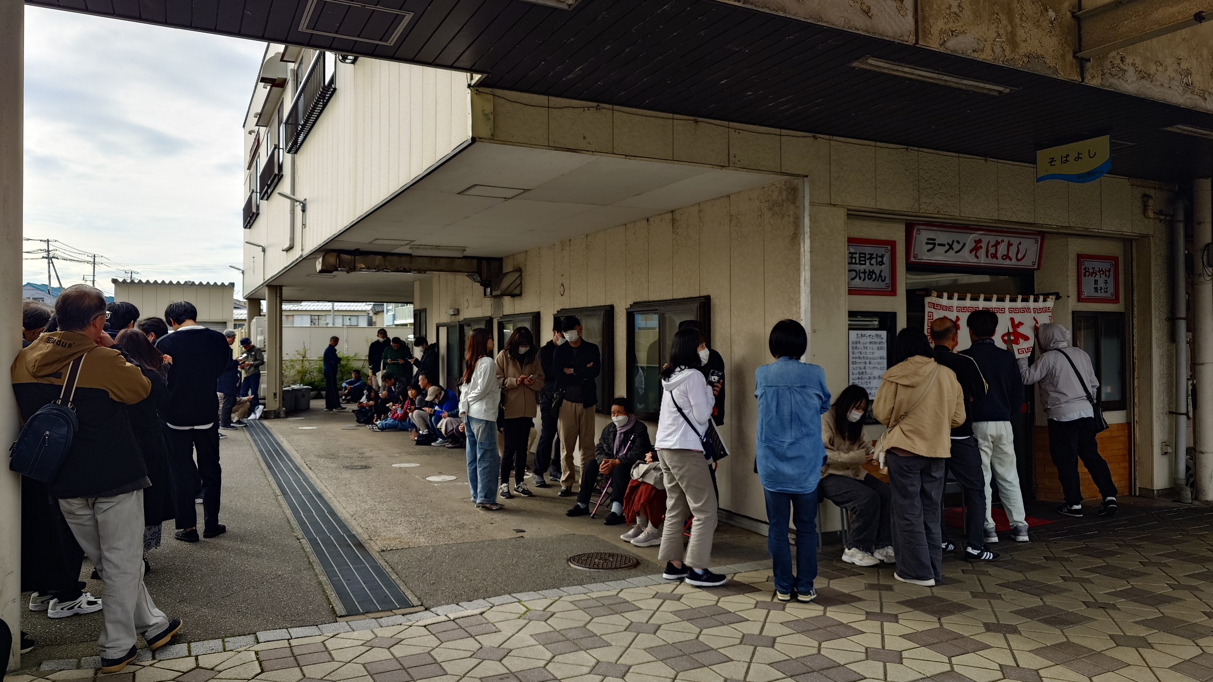 そして、柏崎駅前に来ると長蛇の列。花びらチャーシュー麺で人気なラーメンそばよし。これまでも通る度に列んでましたが、長蛇。この11月3日で50年の歴史を終えるそうで、ソウルフードの食べ納めか4時間に待ってでも食べたい人達だそうです。閻魔市の時だか1度だけ食べました。