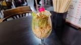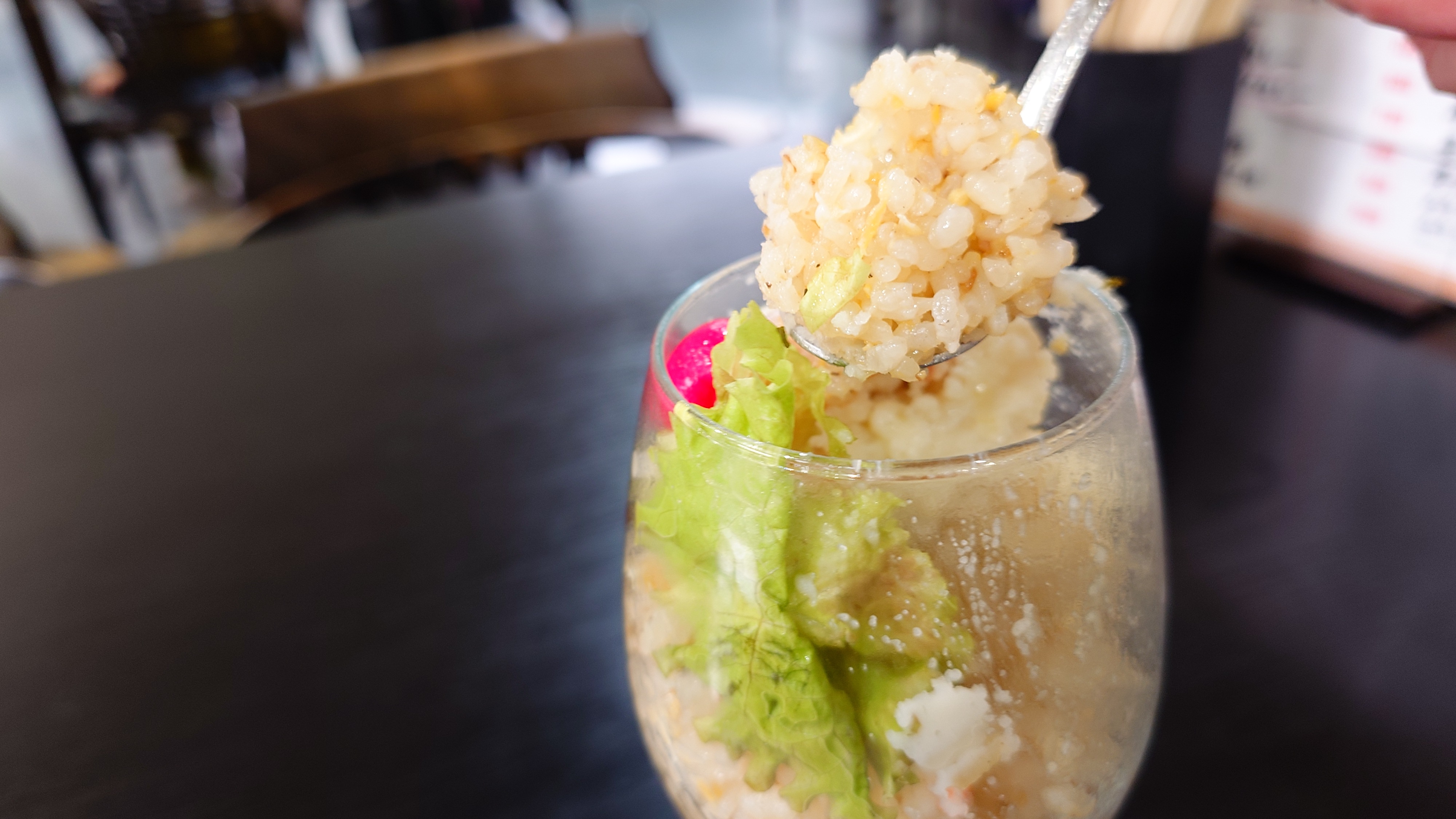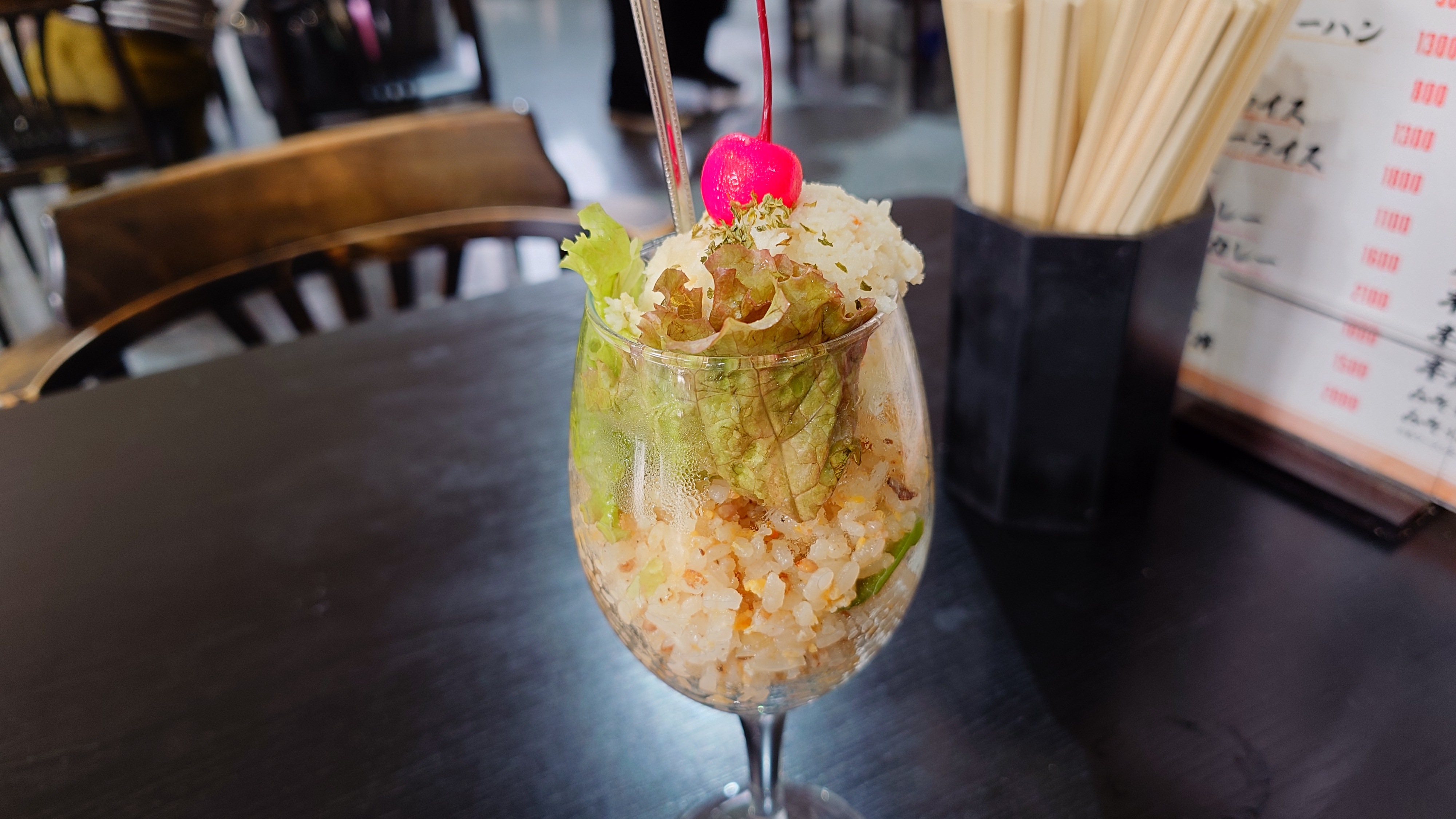 先にパフェチャーハンが到着。ポテサラが乗って、さくらんぼまで。なかなか食べづらいですが、ちゃんと美味しいチャーハンです。