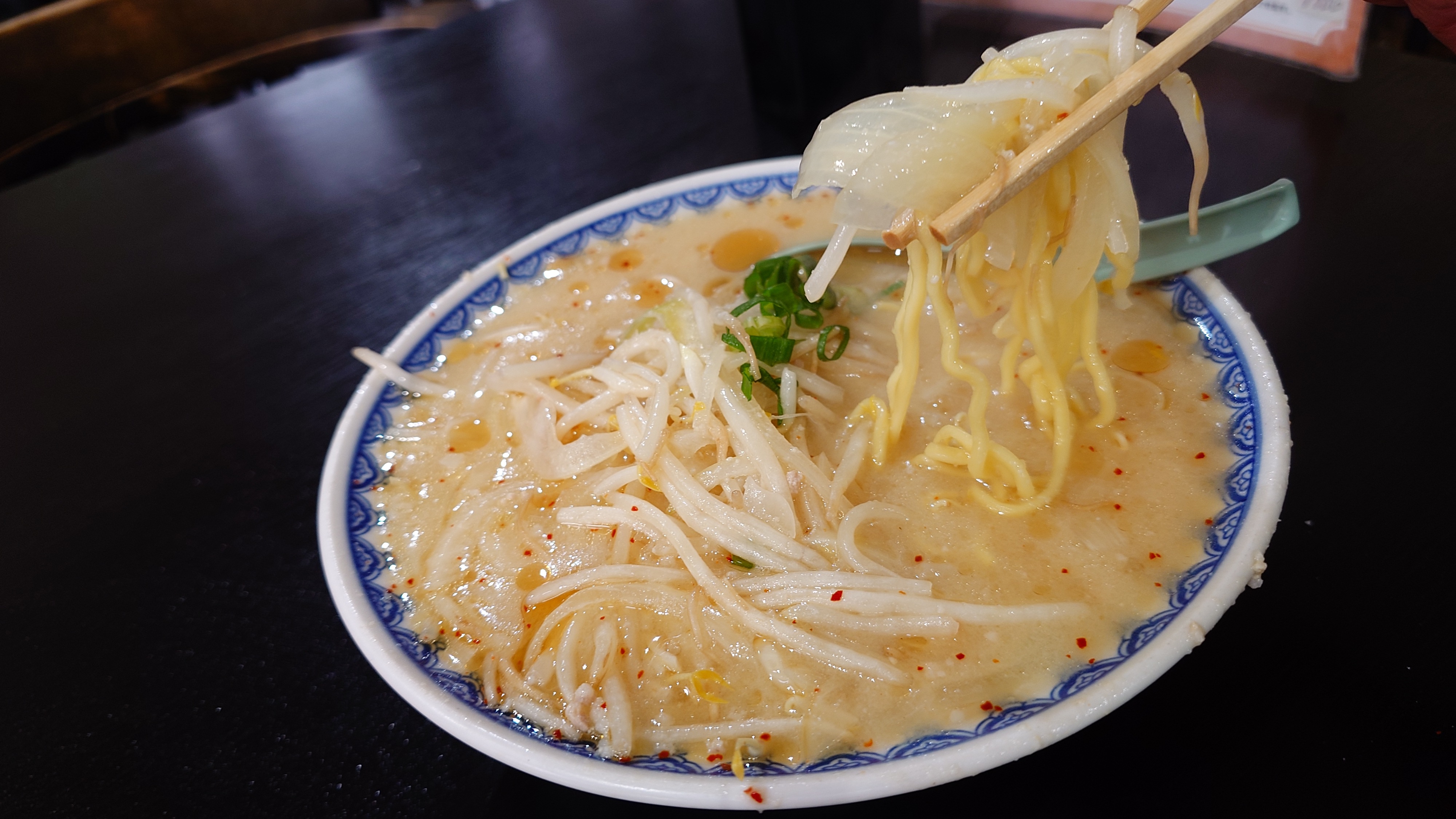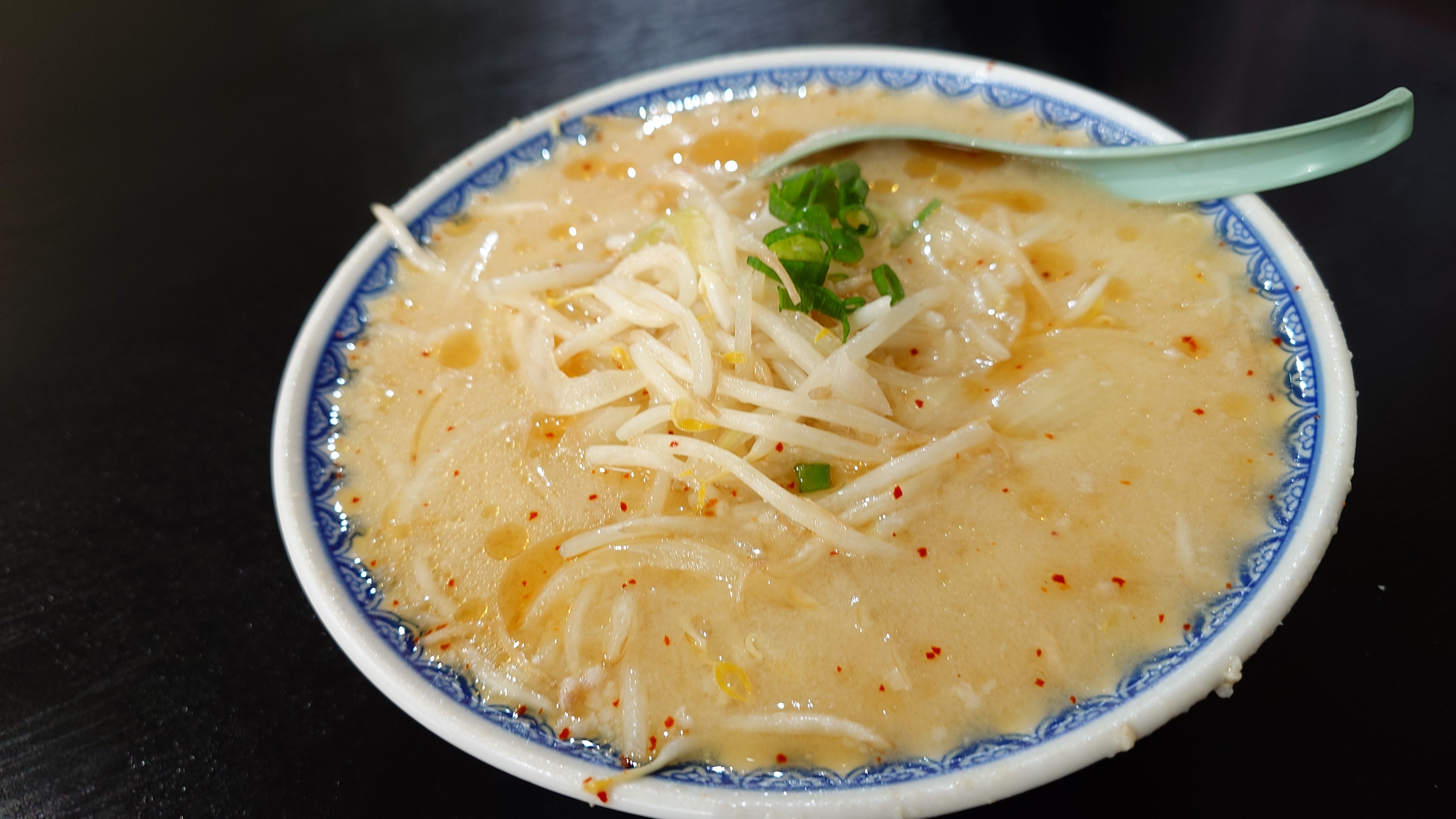 そして、半麺のみそラーメンが着丼。その瞬間からニンニク。しゃきシャキなもやしに玉ねぎ。ここにチャーシューが欲しかった。濃厚な白味噌スープに辣油でピリ辛。更に唐辛子を投入して温まります。