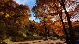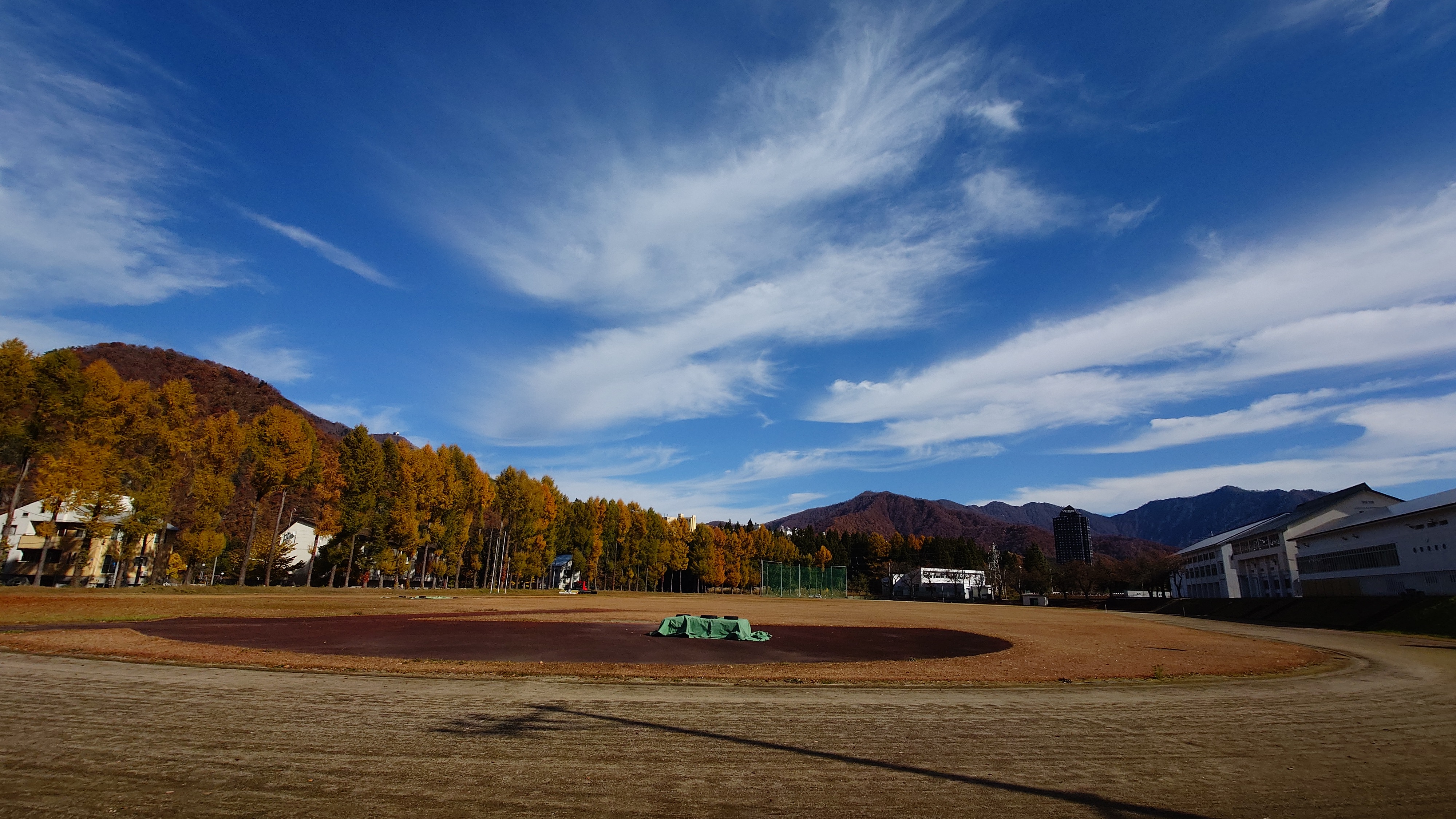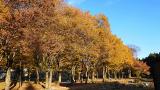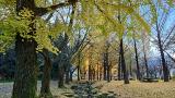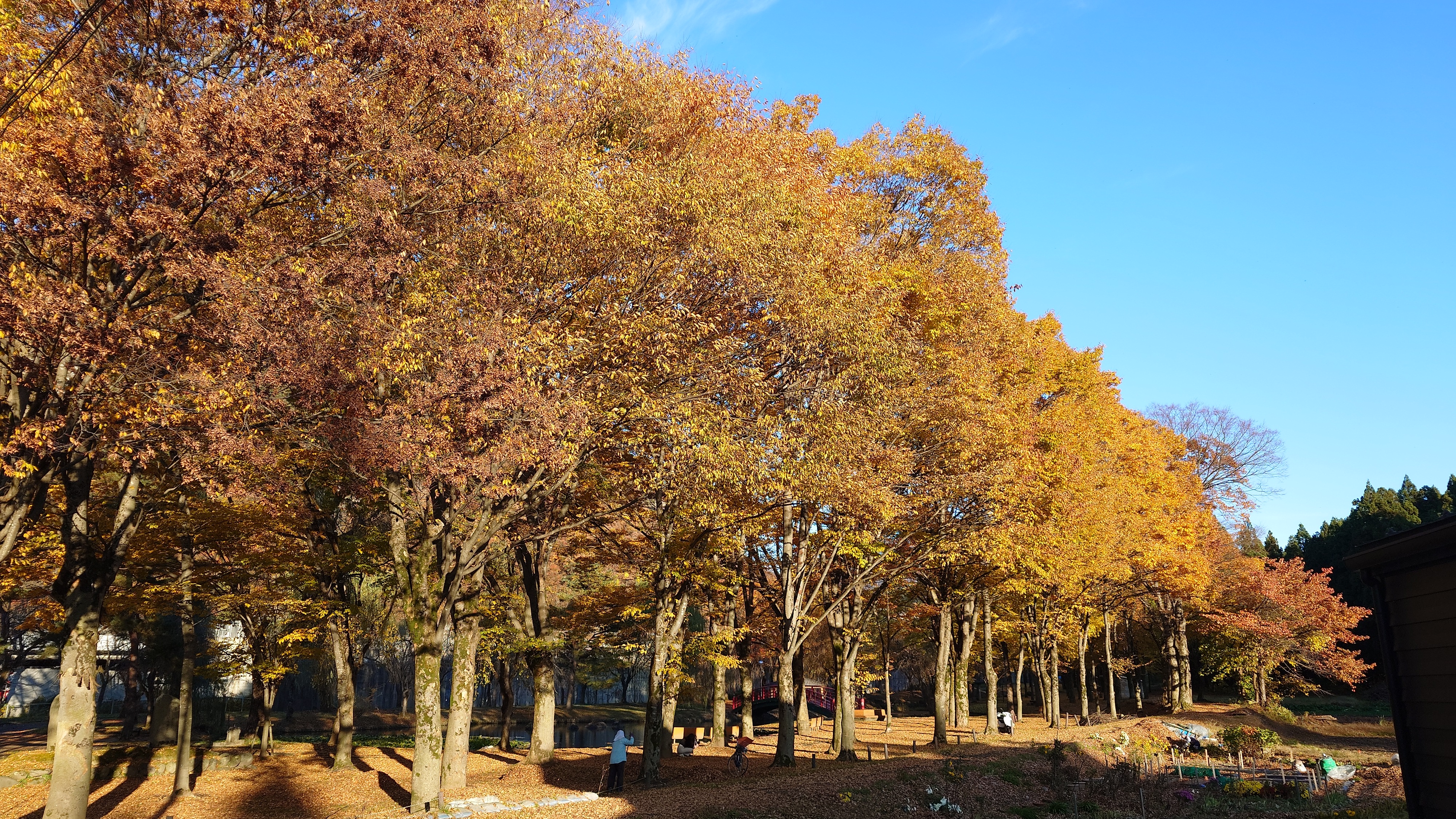 湯沢中央公園ではイチョウや桜なども黄葉していて、陽が落ちる手前で正面から西日が当たって輝いています。
