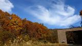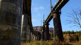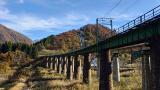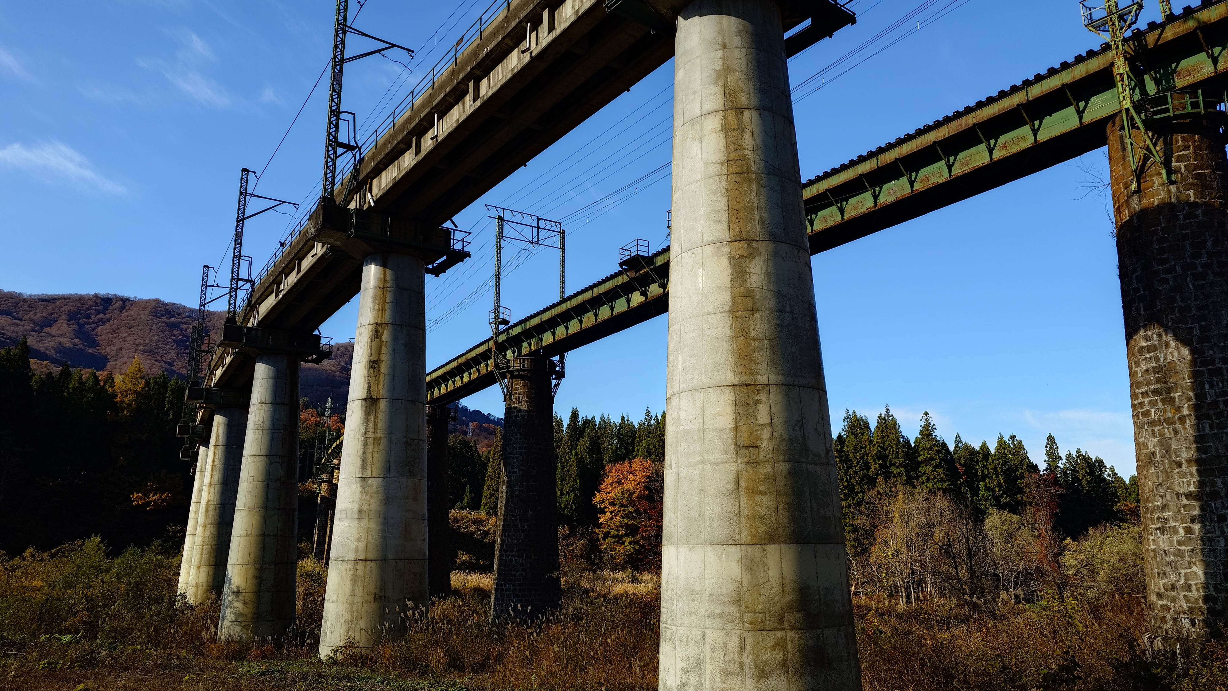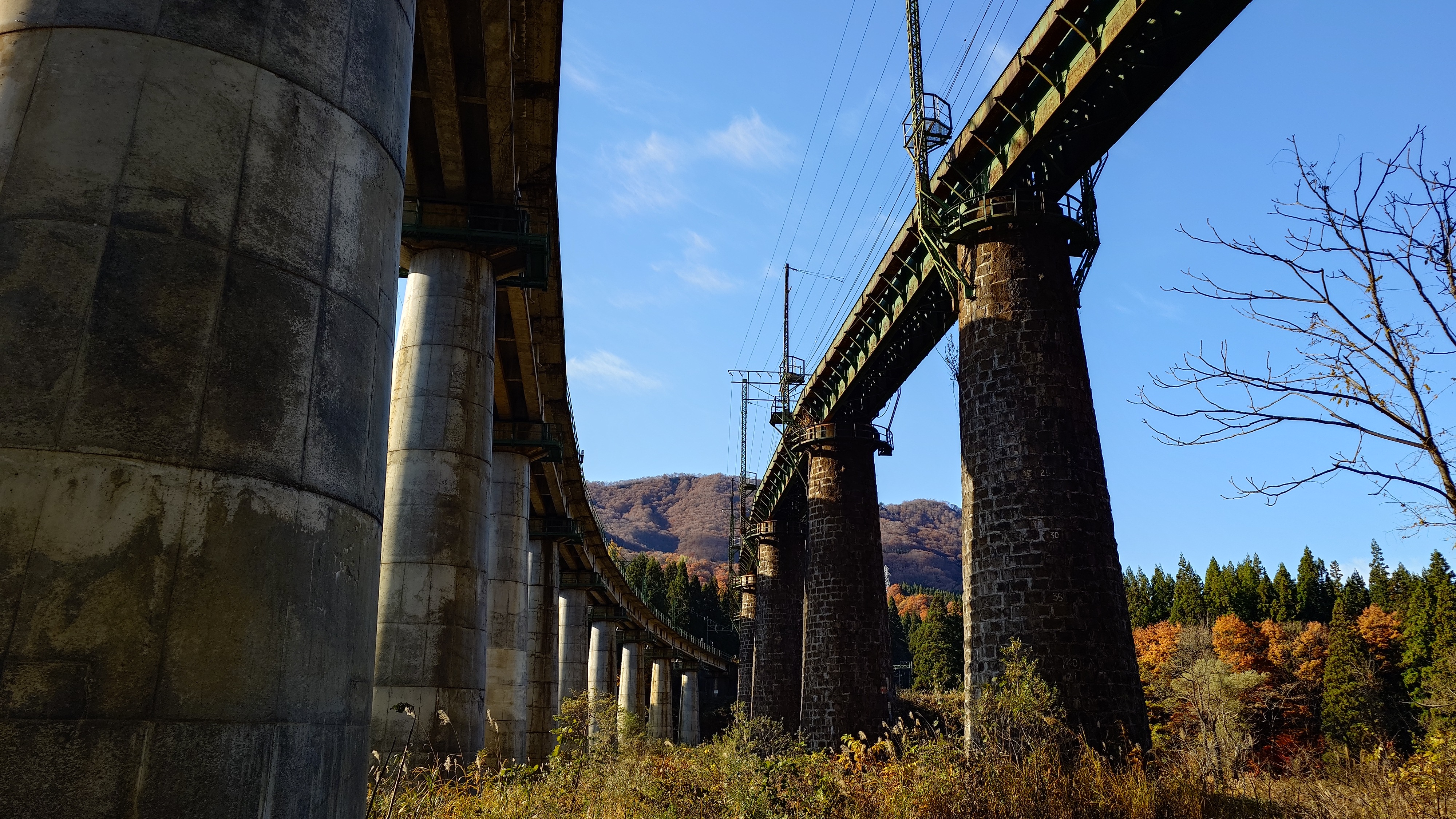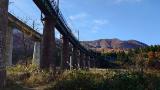 ブロック積みの上り線と、コンクリートの下り線。秋の季節に映える鉄橋です。