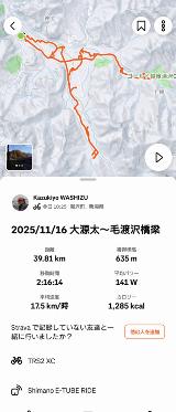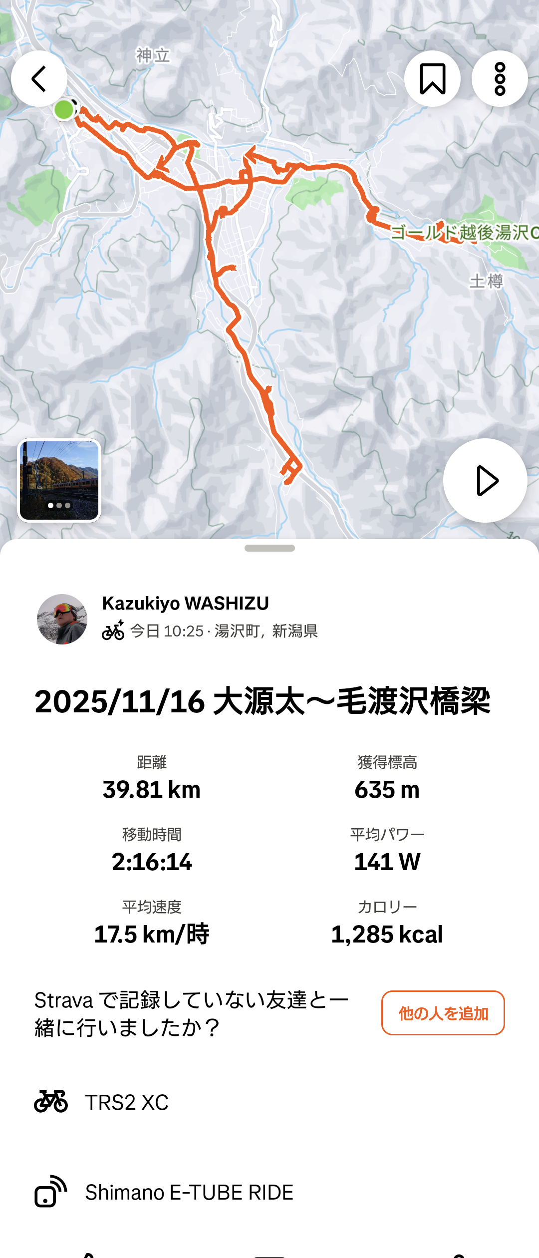 今日は湯沢うろうろで、距離は39Kmでしたが、大源太、毛渡沢まで上がったので獲得標高635mと伸びました。