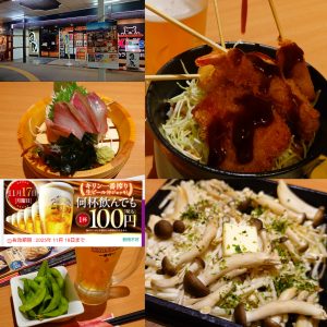 ブリ刺は貧相でしたが、キノコバターに串カツはそれなりにアリ。串カツは最後で丼にしたので、ご飯で腹に溜まります。しかし、魚民もほぼ500円以上になっちゃいました。