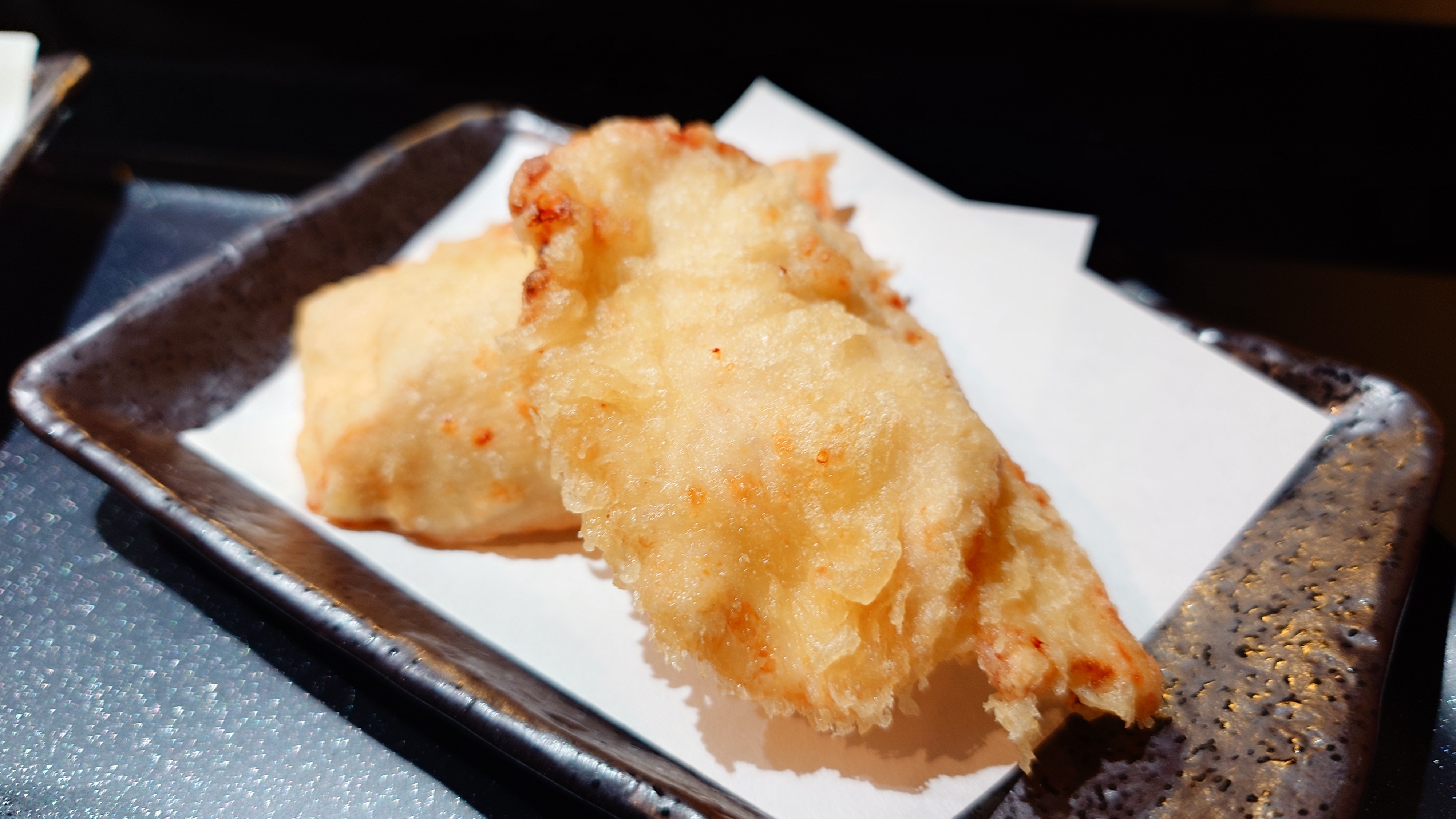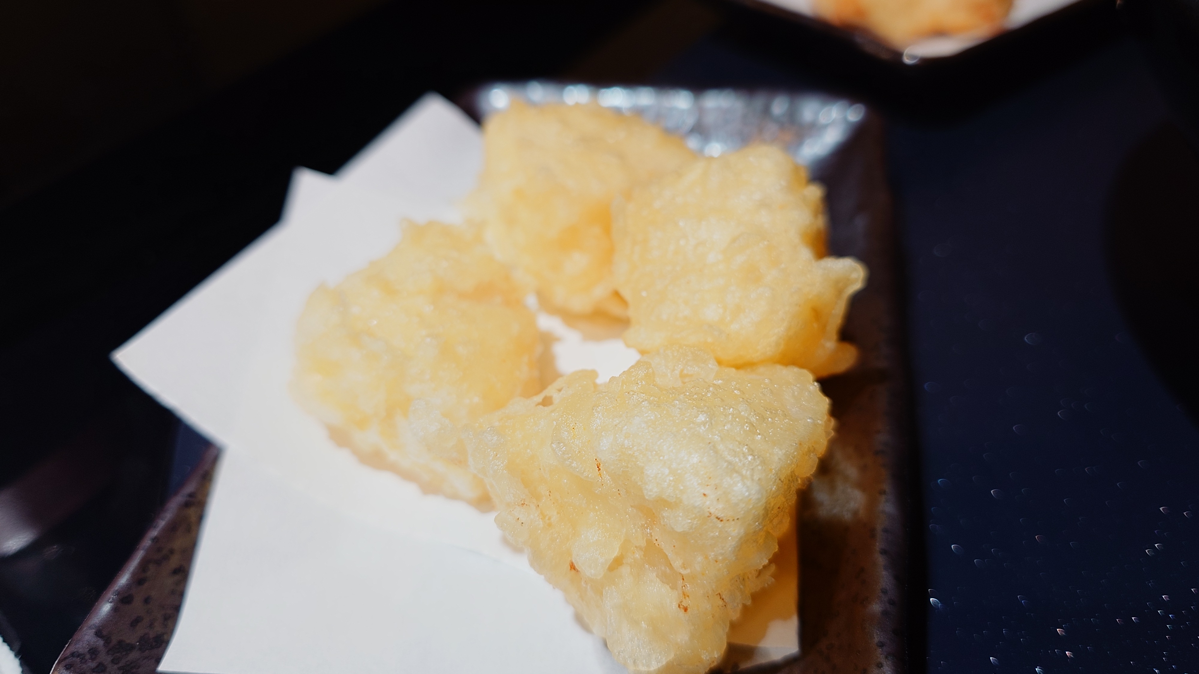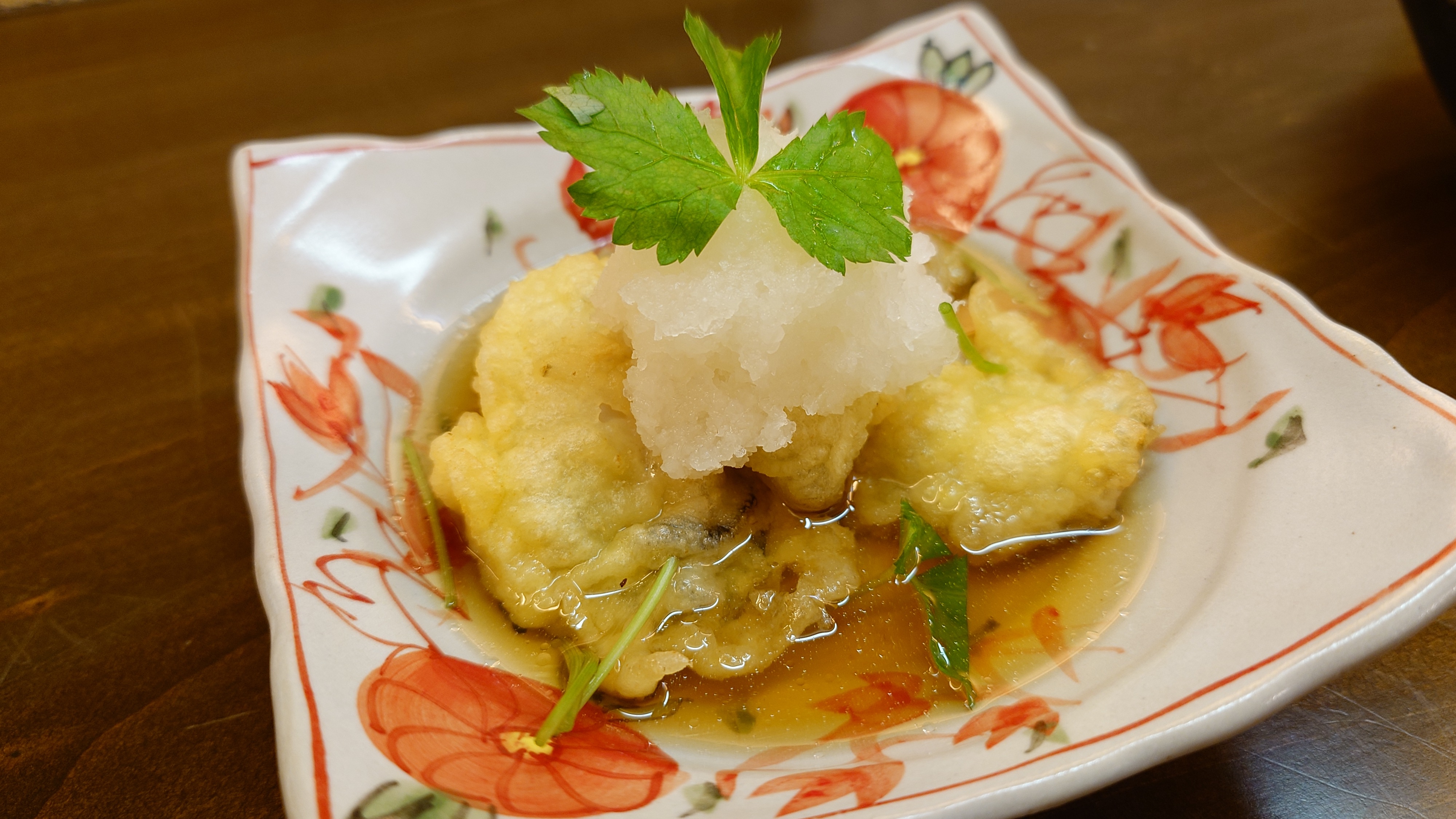そして、かしわ天と大根天。かしわは西日本で鶏のことですが薄めで平たいのにジューシー。大根天はふろふき大根を揚げて、そのままでもお塩でも旨い。