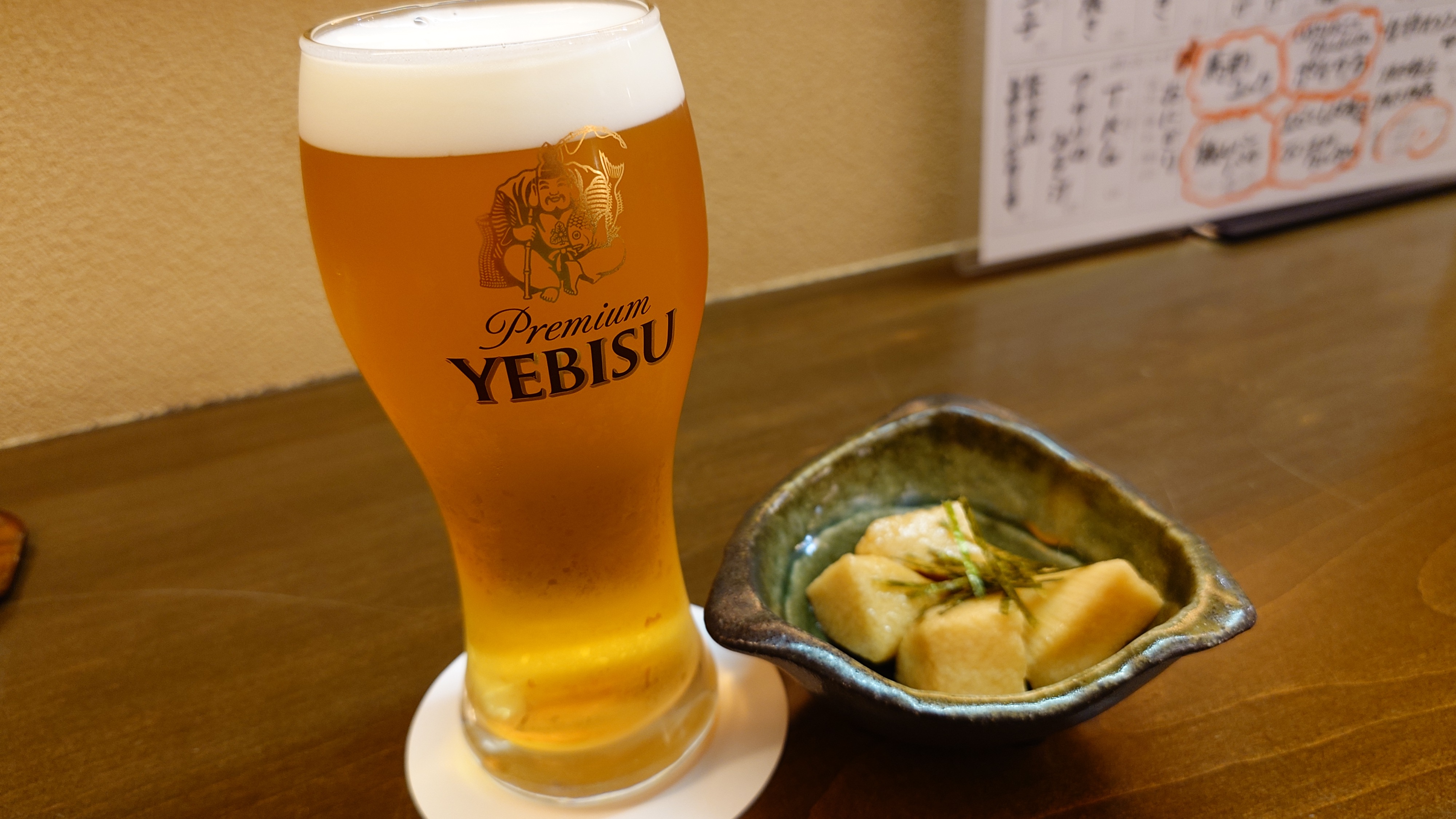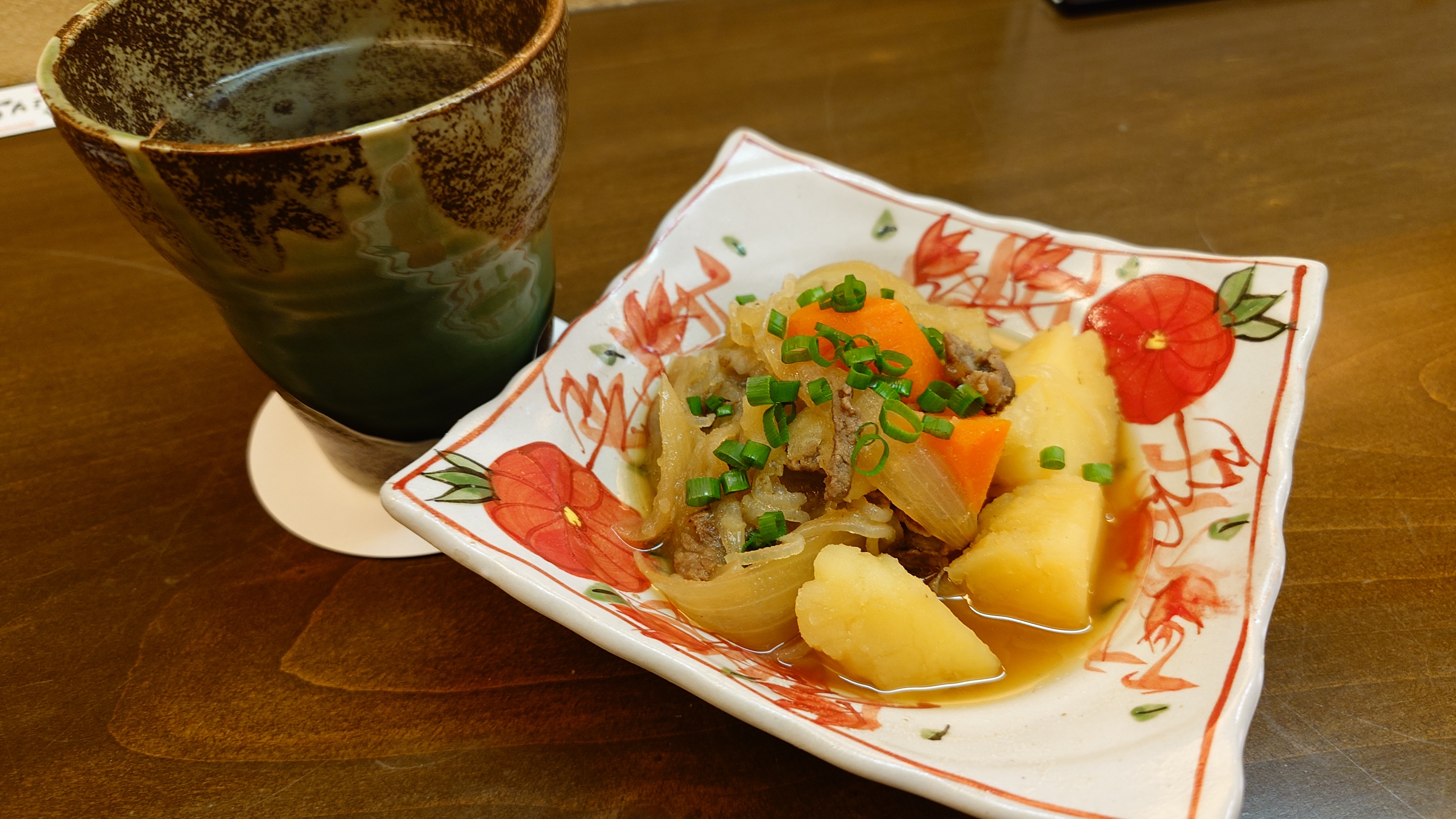 そして、ありそうでめったに見ない牡蠣の揚げだし。薄口でも出汁がしっかりしているので、牡蠣の旨味に負けてません、最後は肉じゃが。これも意外に湯沢に無いんです。ほっこりするあわざです。 ビールからの、薩摩焼酎の真鶴。お湯割りで温まります。