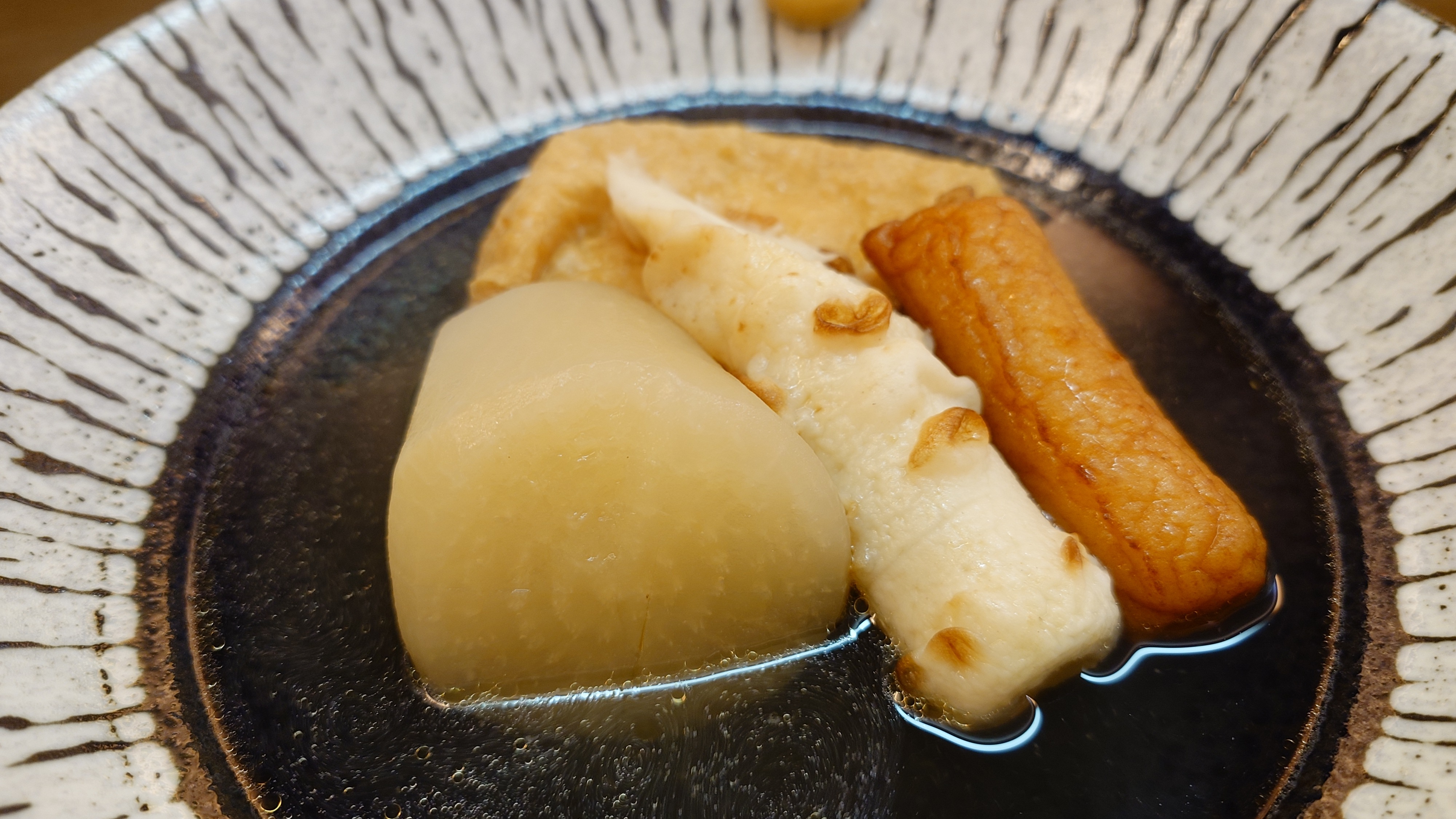 六日町のあわざ。寒くなるとおでん。それも関西出汁が沁みてます。栃尾揚げかおつゆを吸って美味しいです。