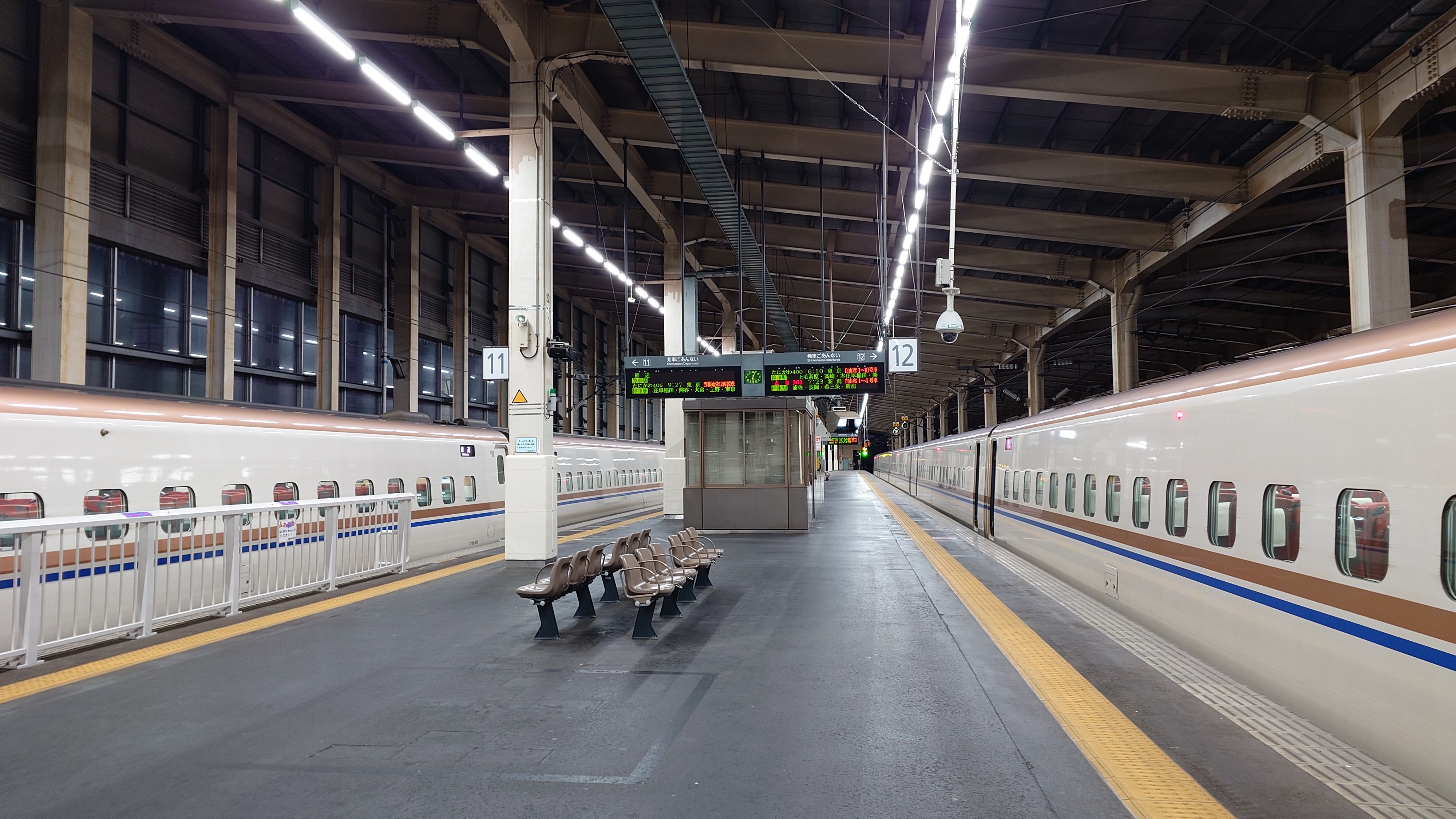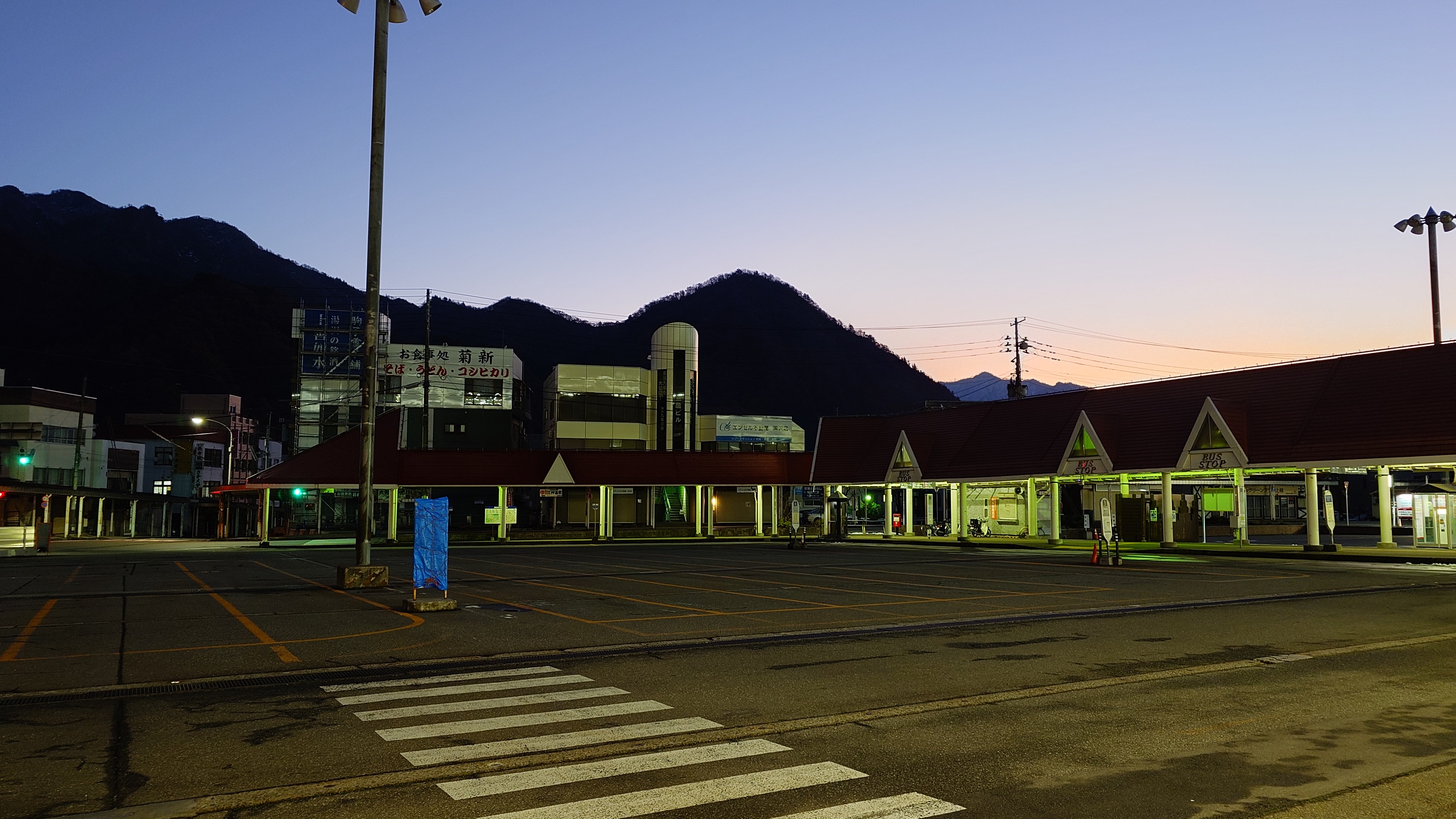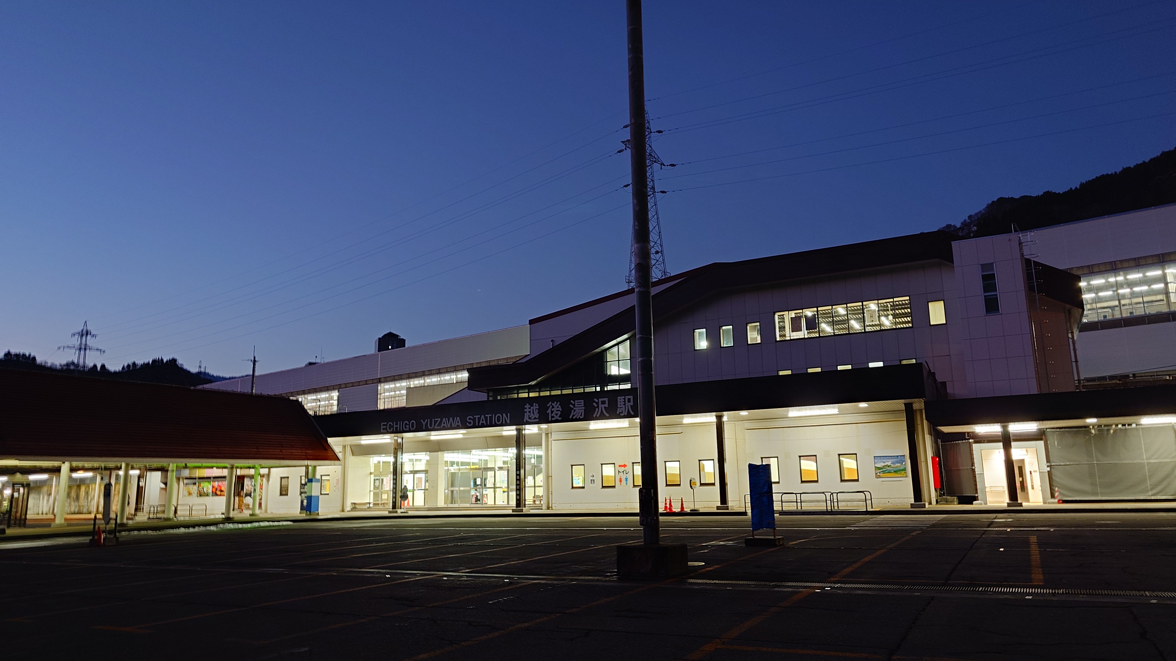 何時もの朝イチ新幹線に乗車です。ようやく白々として来た越後湯沢駅前です。
