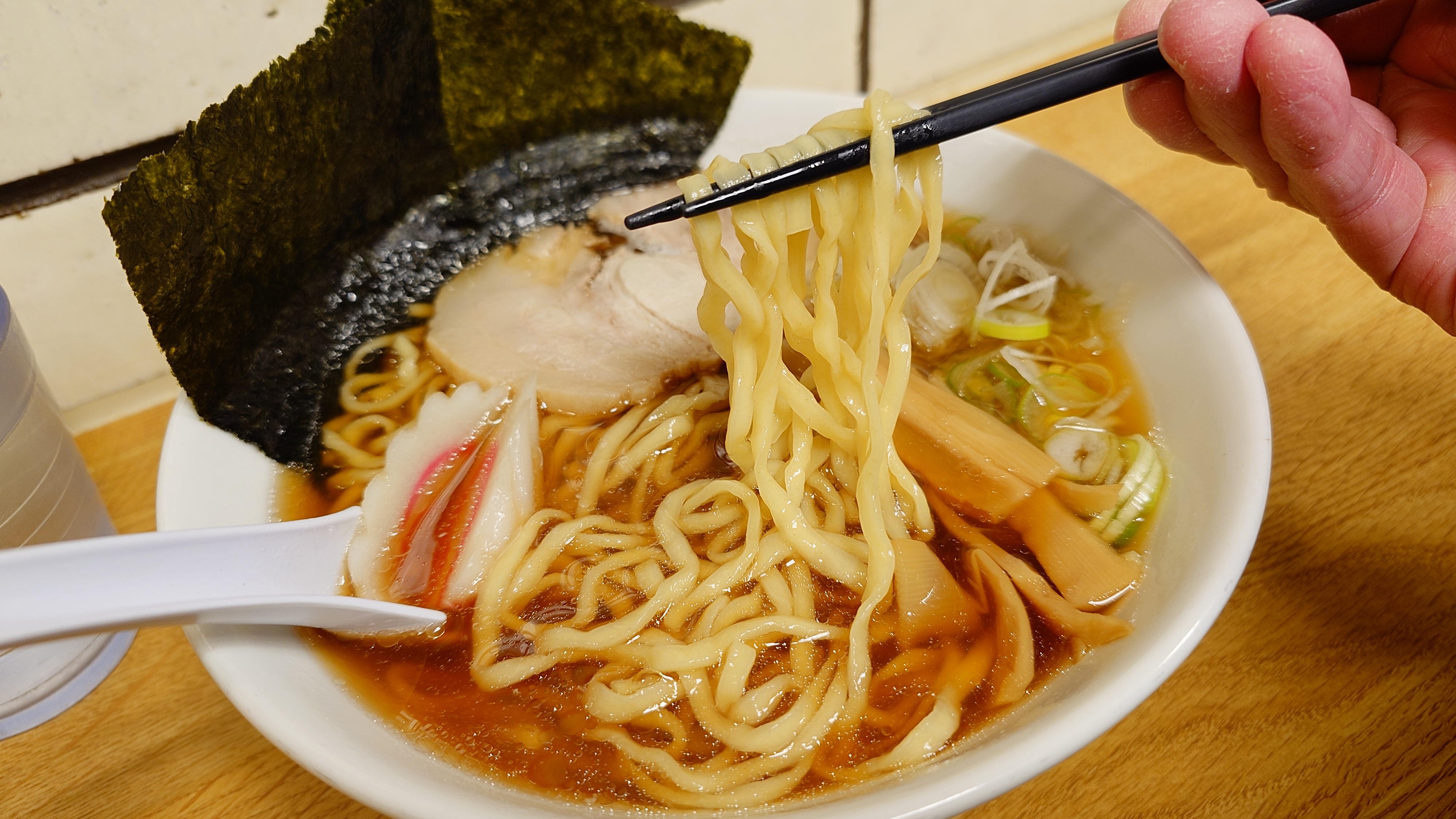 茹で上がりまで数分、佐野ラーメンの特徴の縮れ麺に、あっさりした醤油スープ。お、なかなか美味しいです。まさに朝ラー向きとも言えます。なるとが端っこでデカくて当たり。