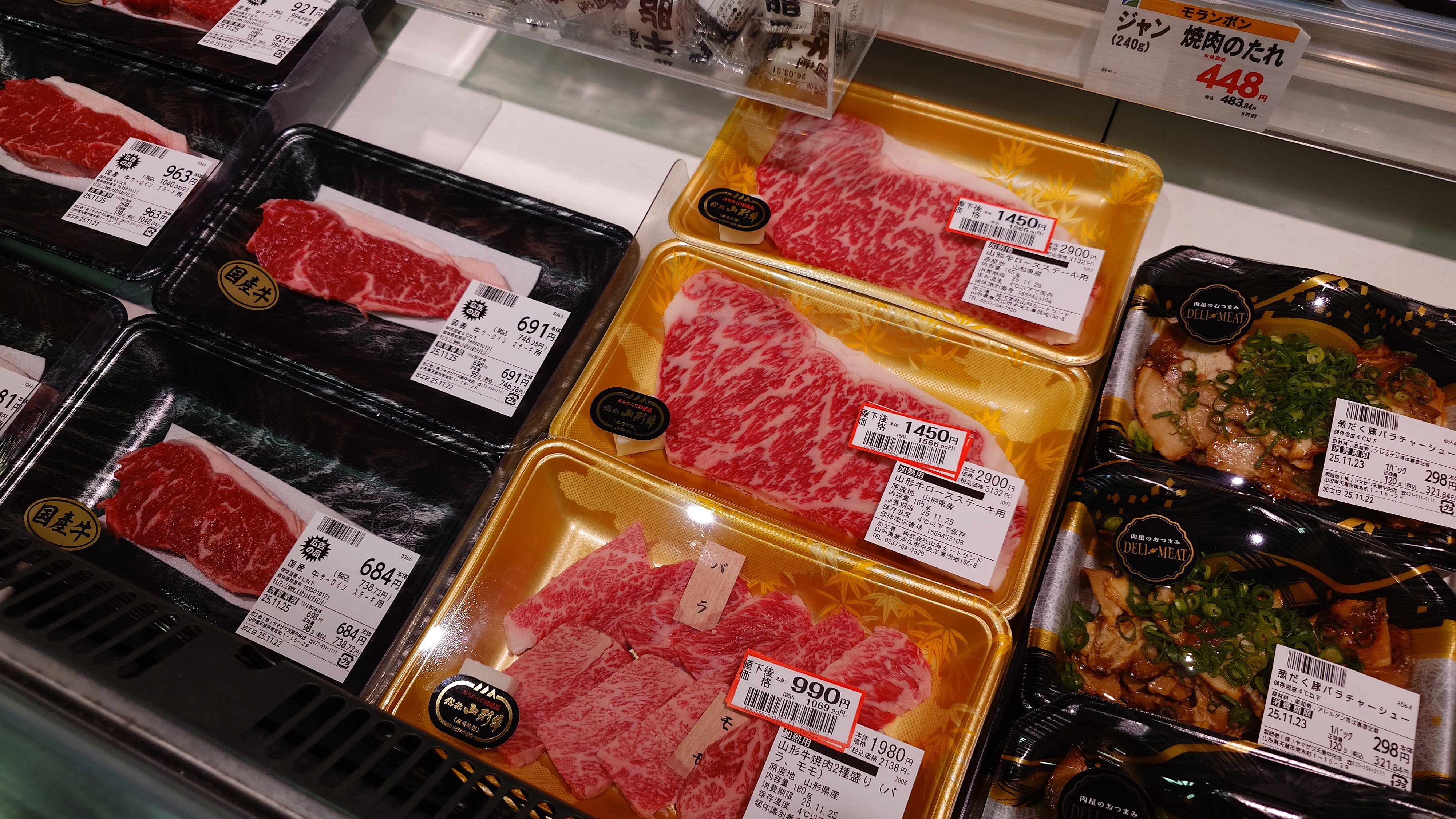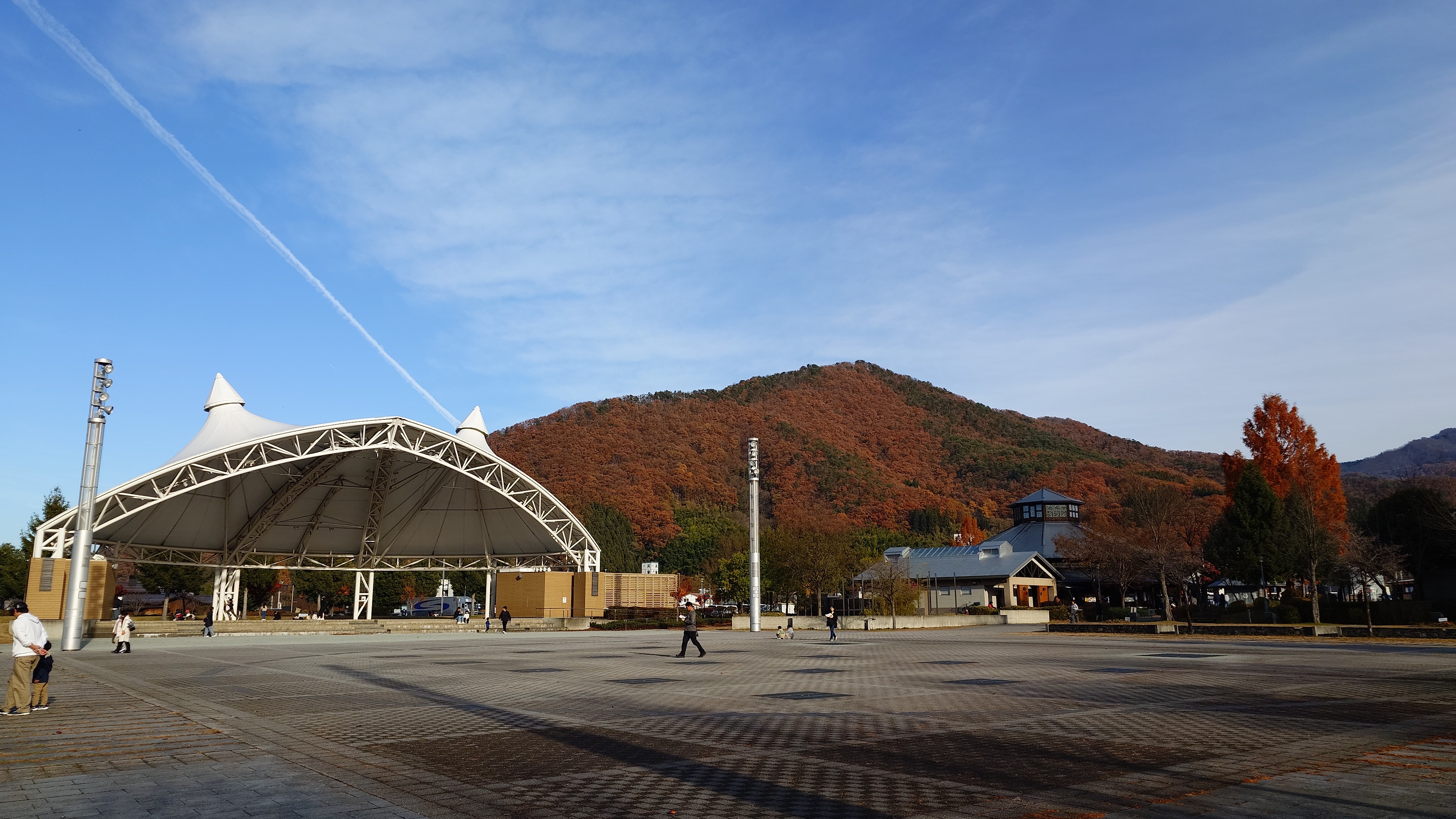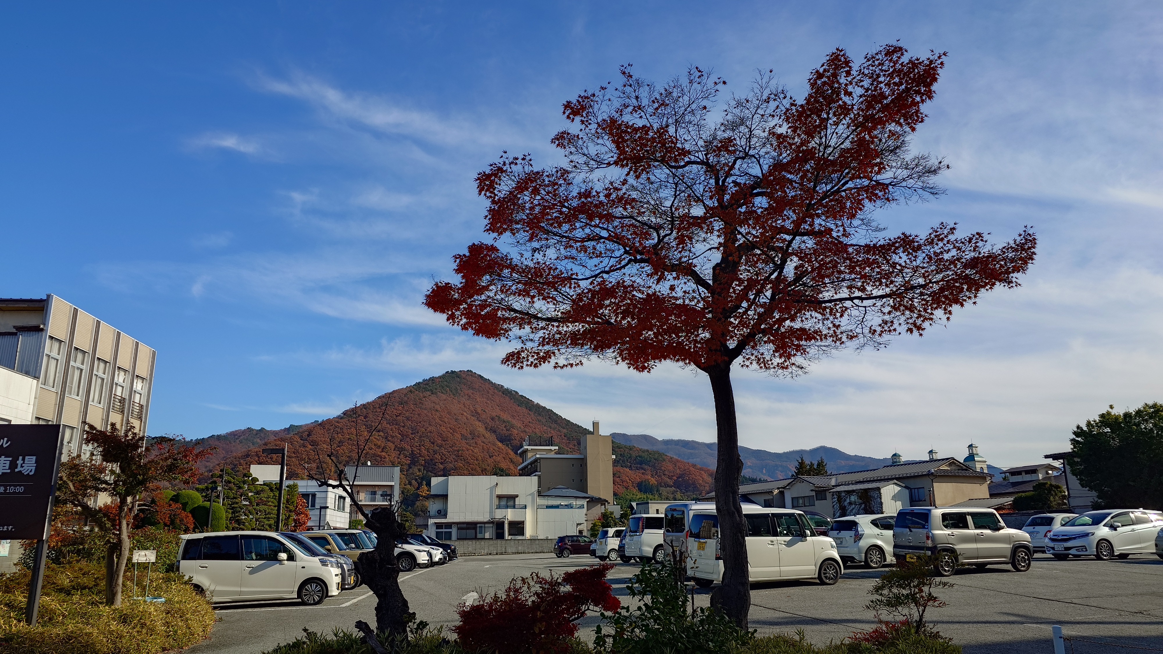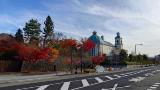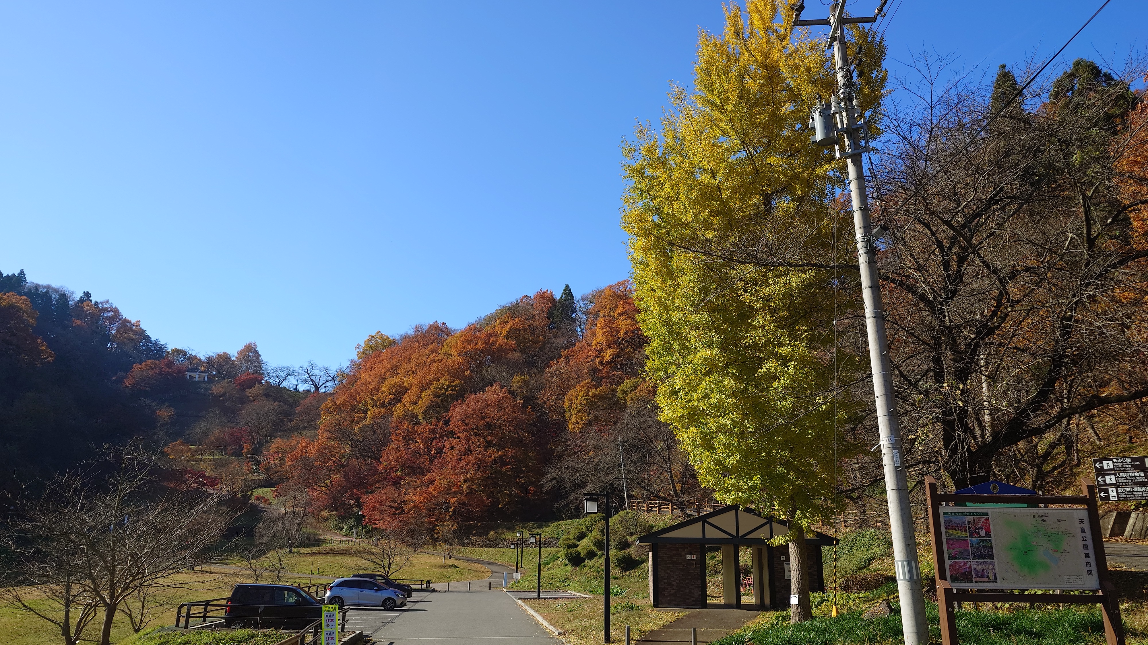 天童公園もみじ園に向かいます。街なかから小高い丘が望めますが、行く途中でスーパーに立ち寄り。近くの米沢牛も、名産のラフランスも安い。