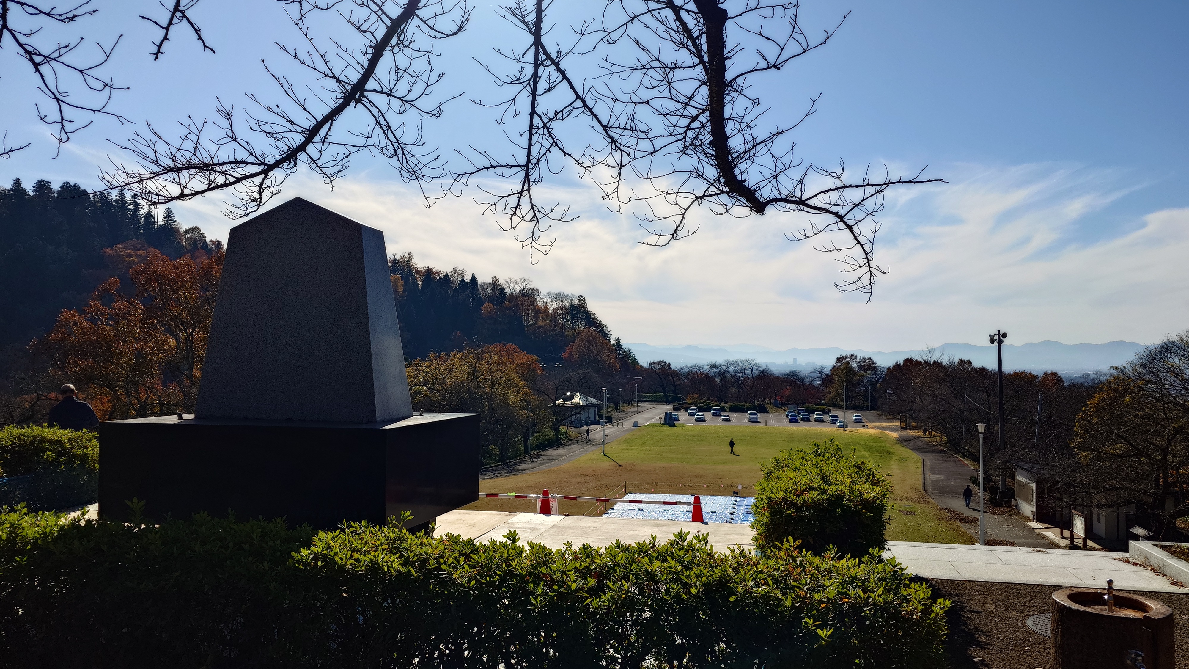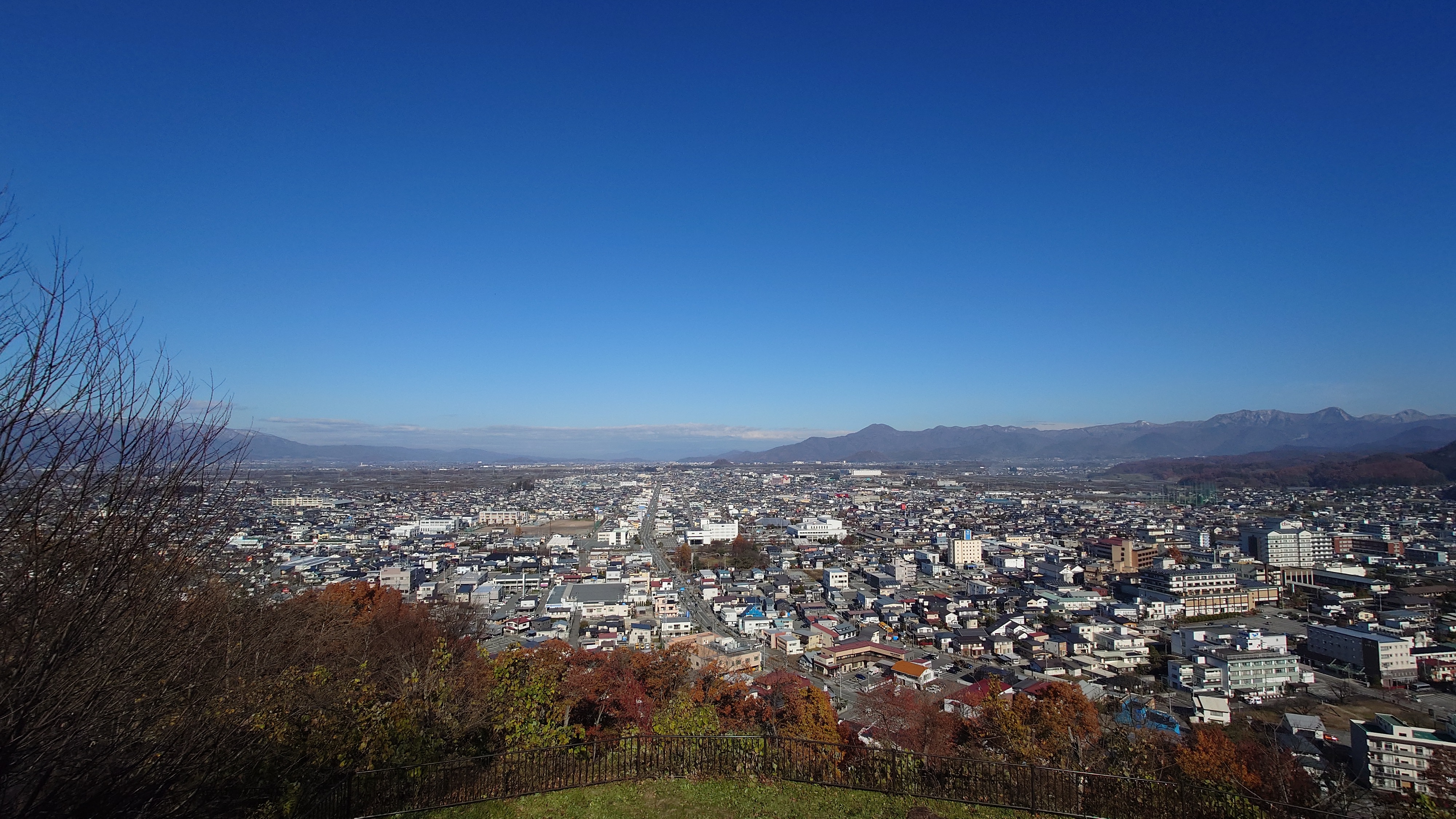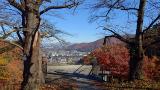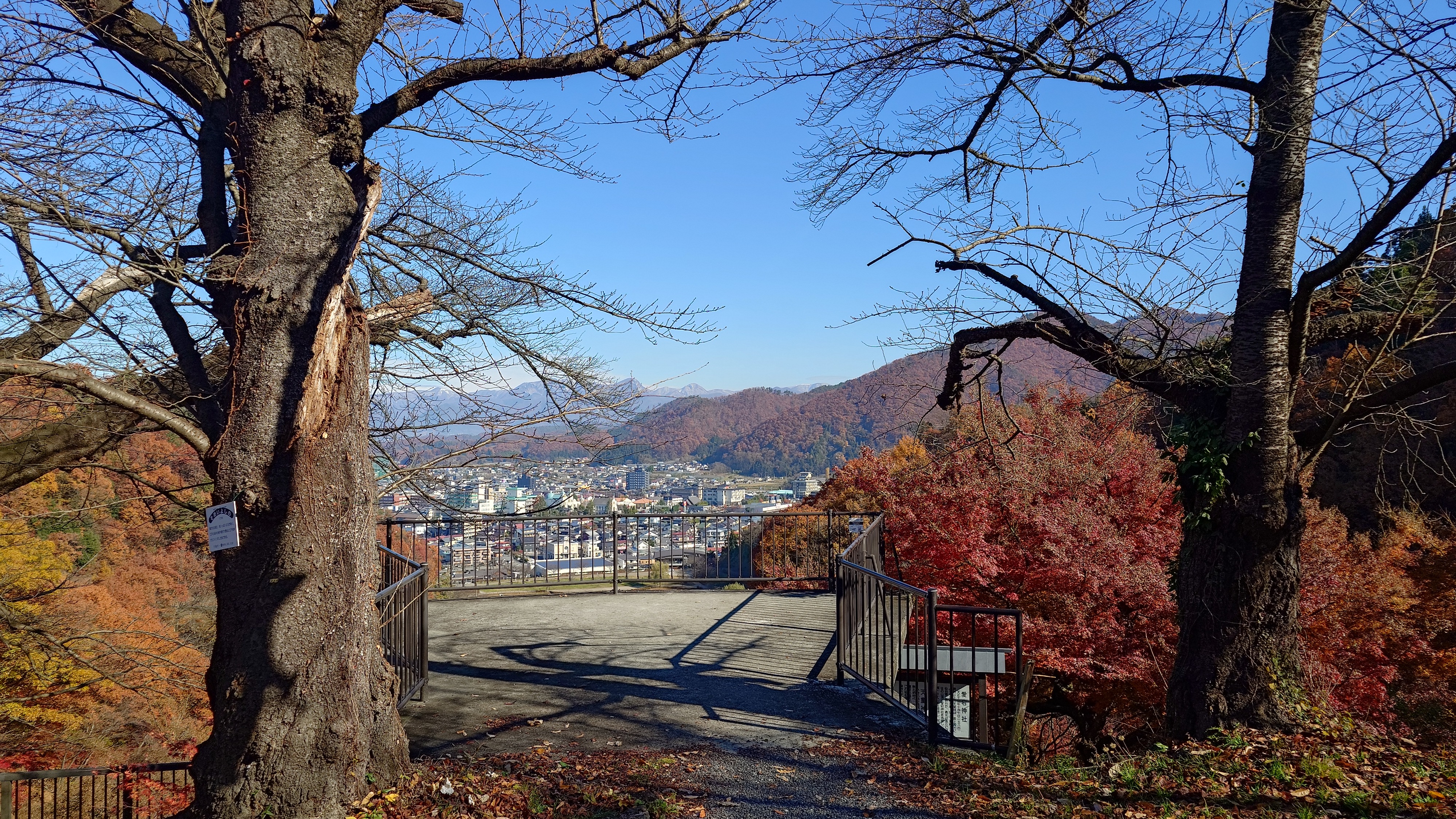 天童公園もみじ園から登ると、愛宕神社の山道へ。バーベキュー場があって、そこからの展望と、人間将棋会場を越えて展望台からの景色。