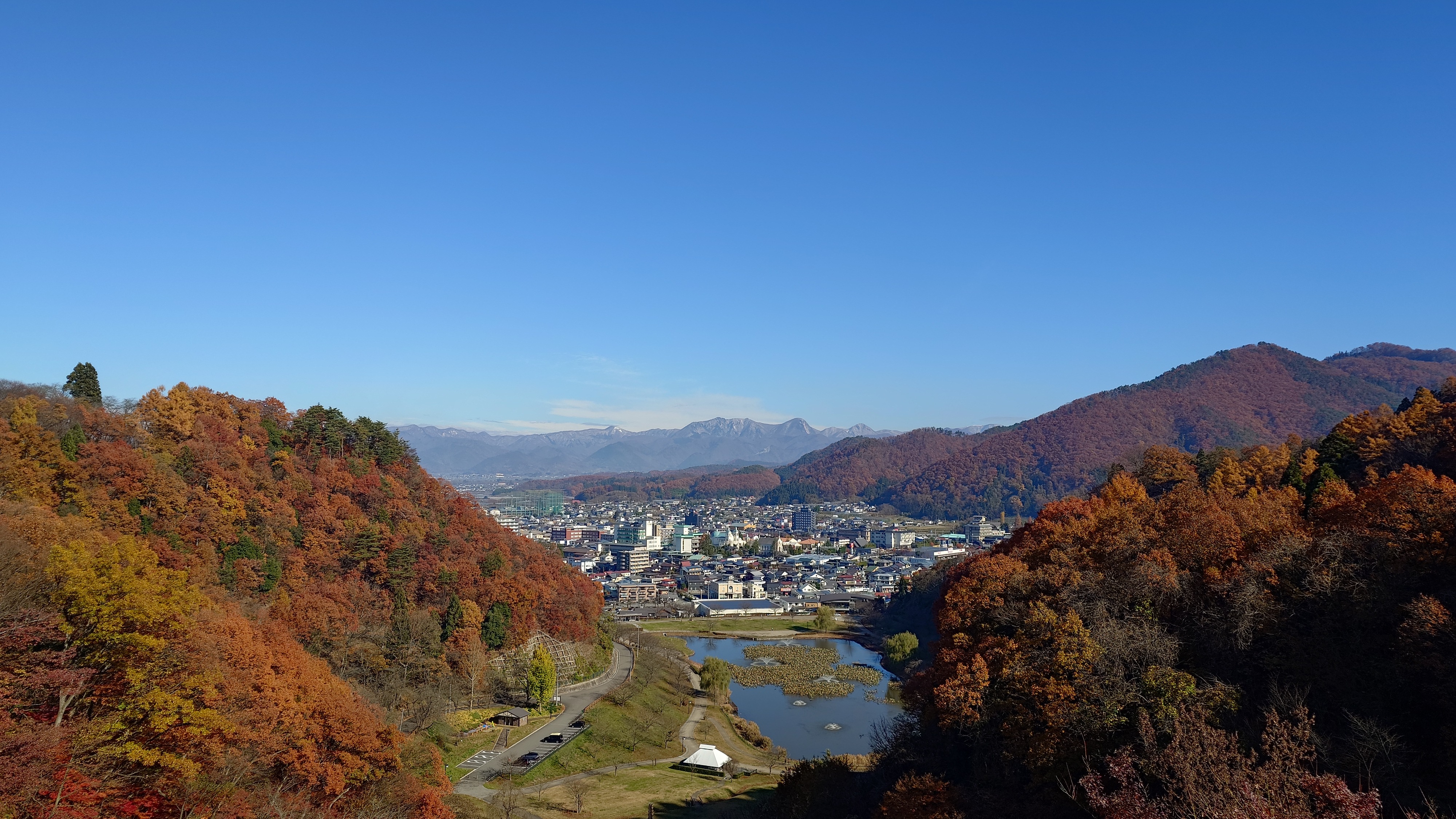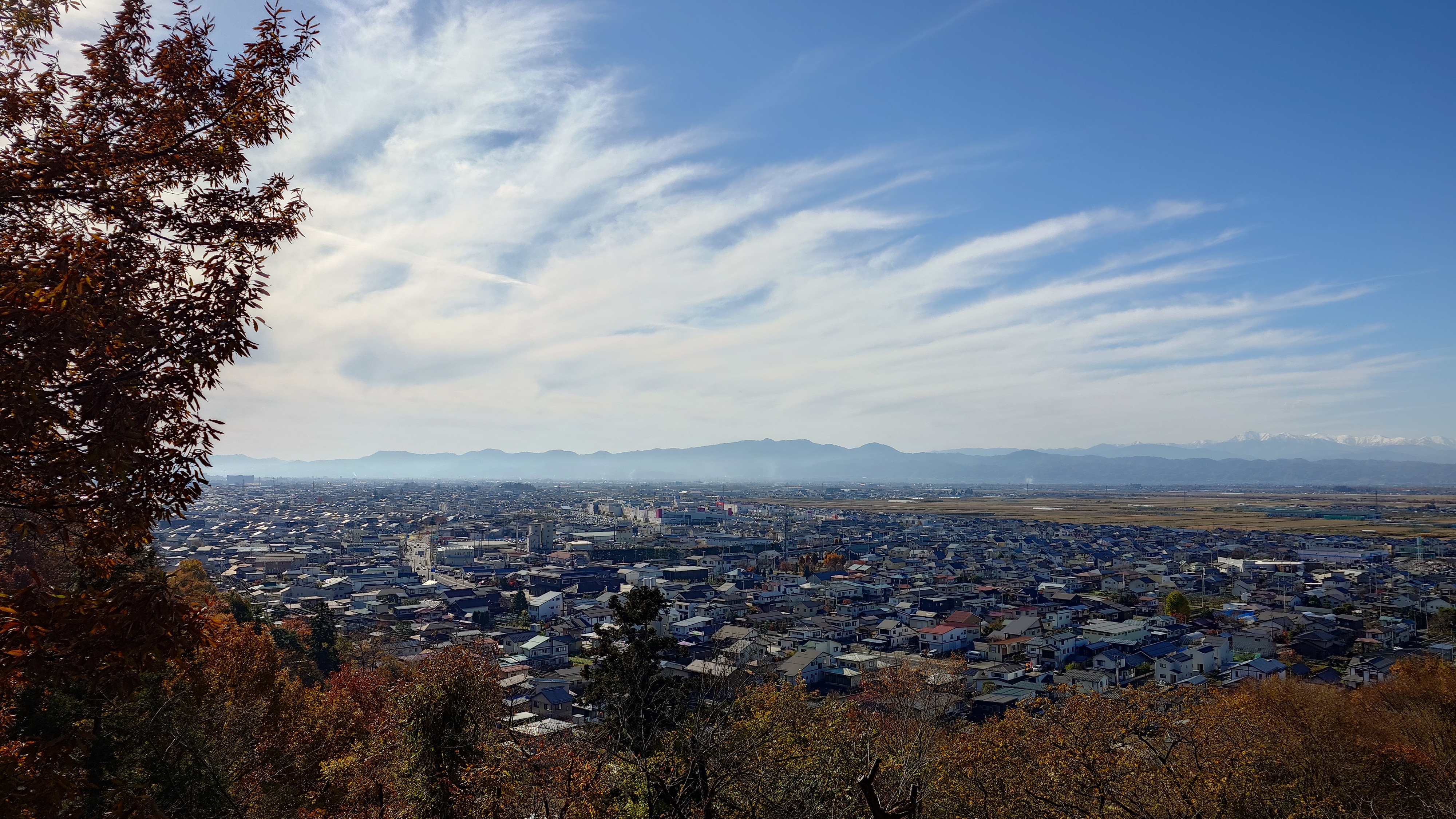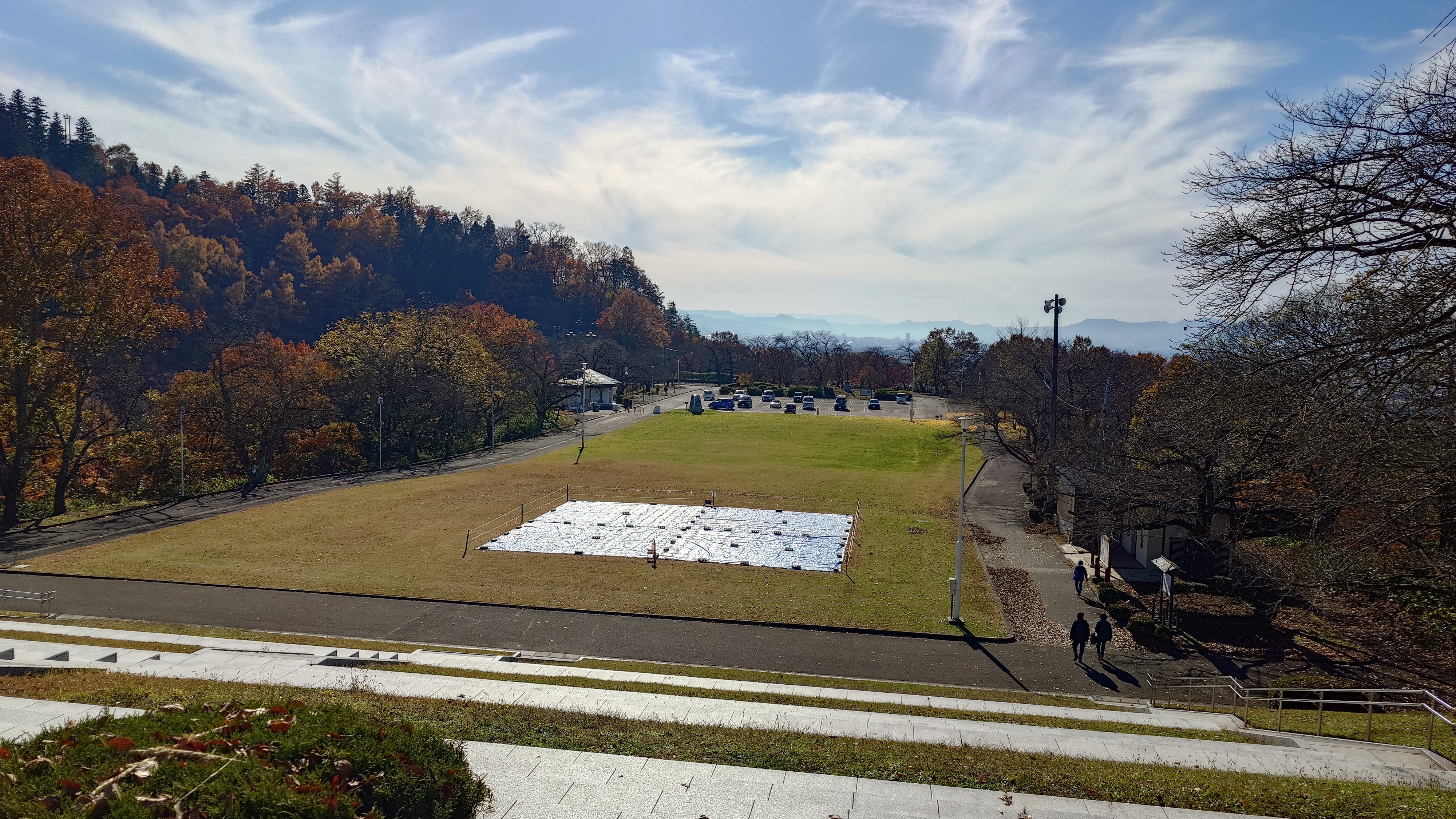 天童公園もみじ園から登ると、愛宕神社の山道へ。バーベキュー場があって、そこからの展望と、人間将棋会場を越えて展望台からの景色。