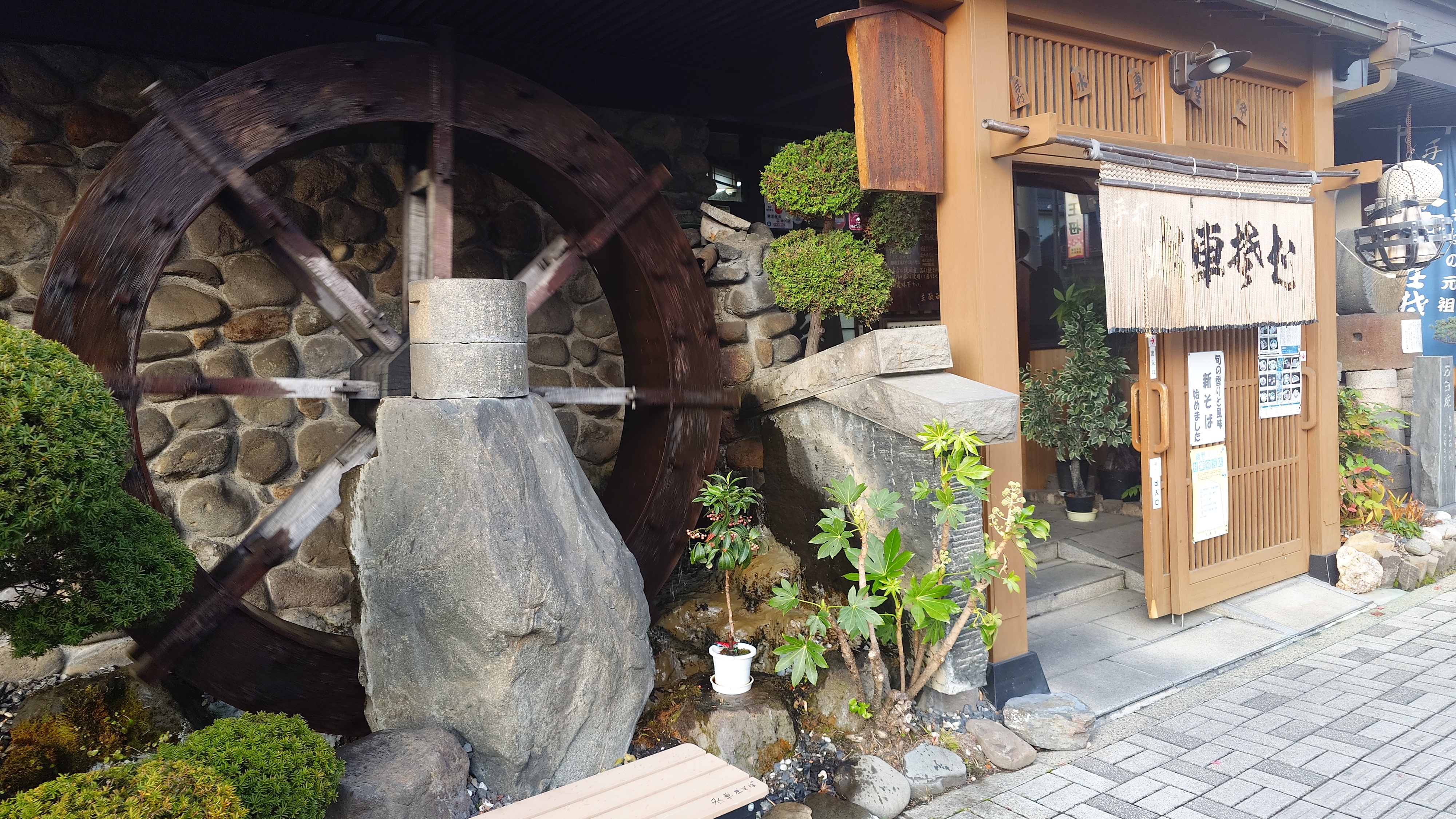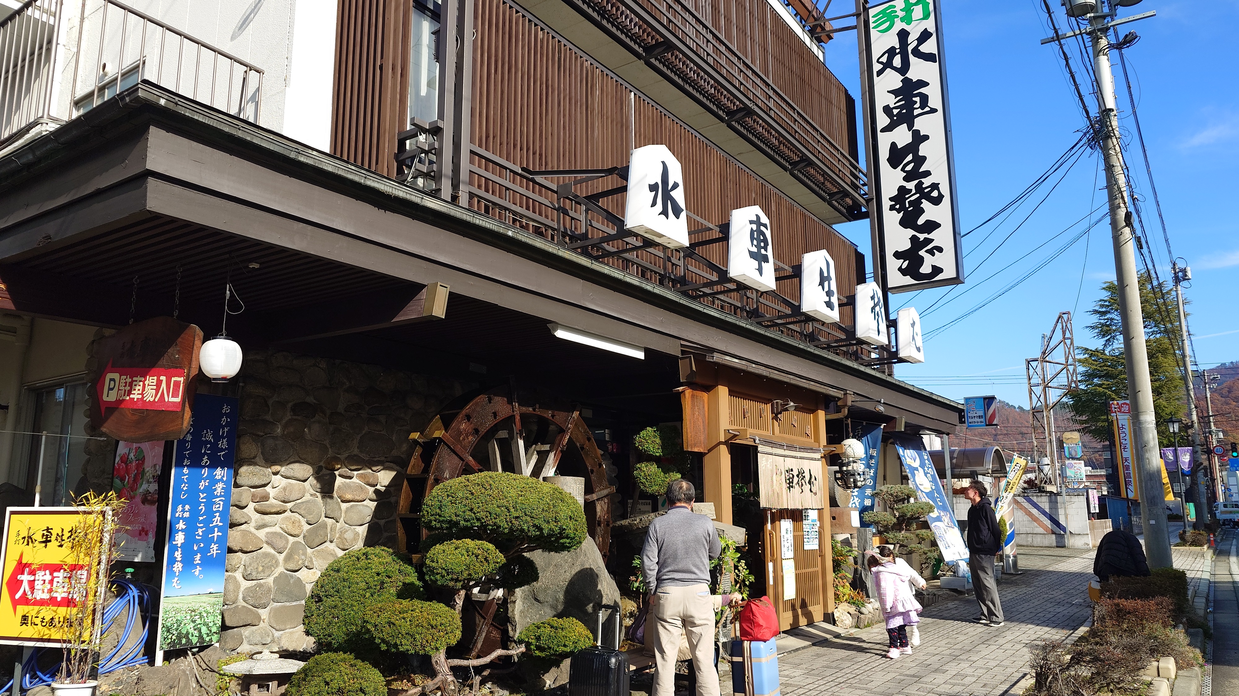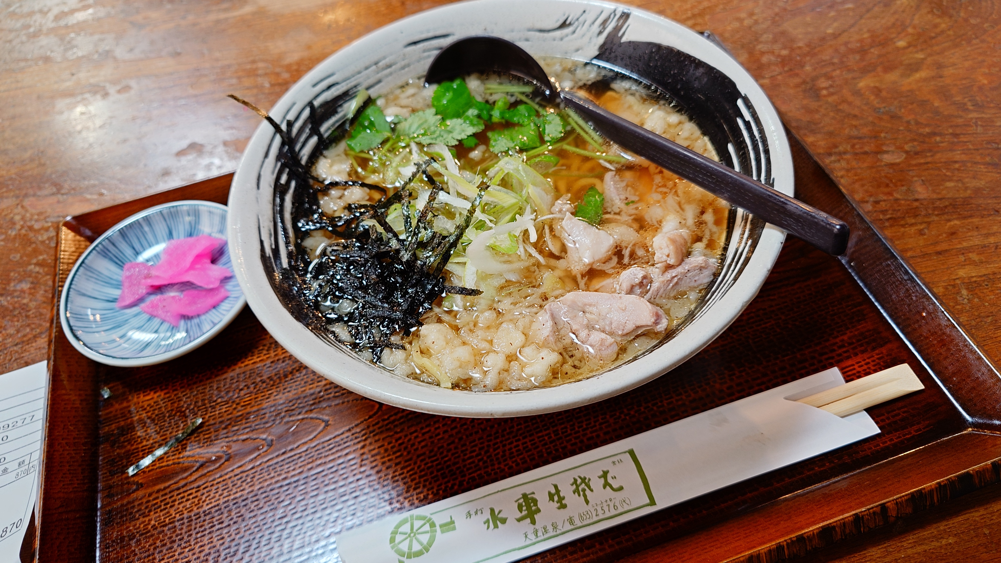 帰り道。先程あきらめた水車そばに寄ったら、さすがに行列は解消されて、数分待ちで着席。即注文で鳥中華がやってきました。
