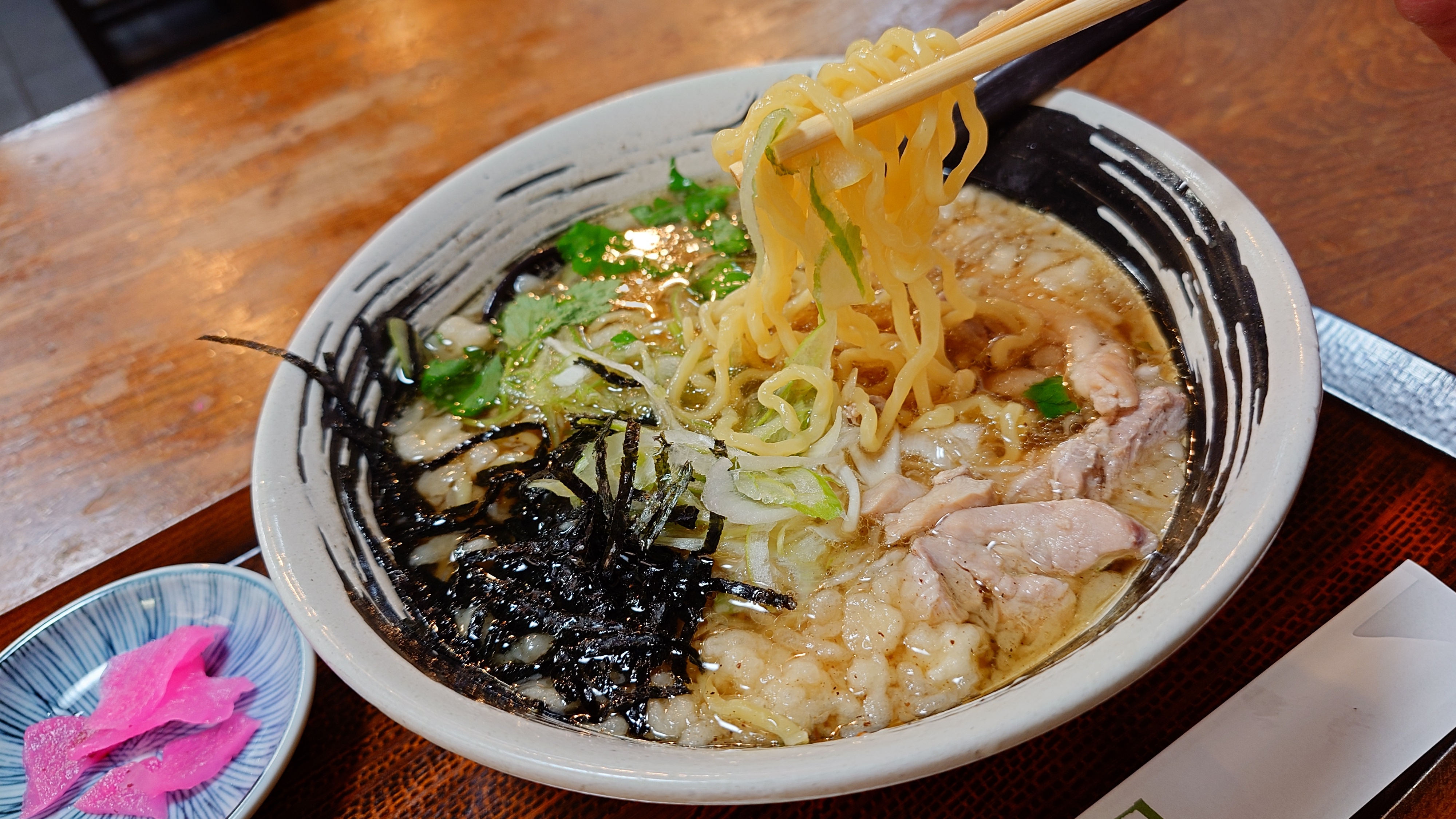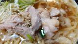 スープをひと口。甘い。関西のうどん汁みたいな旨味感。そこに鶏肉がゴロゴロ入ってます。揚げ玉が入ってるので、背脂のような効果が出て、これも甘味に寄与してるかと。