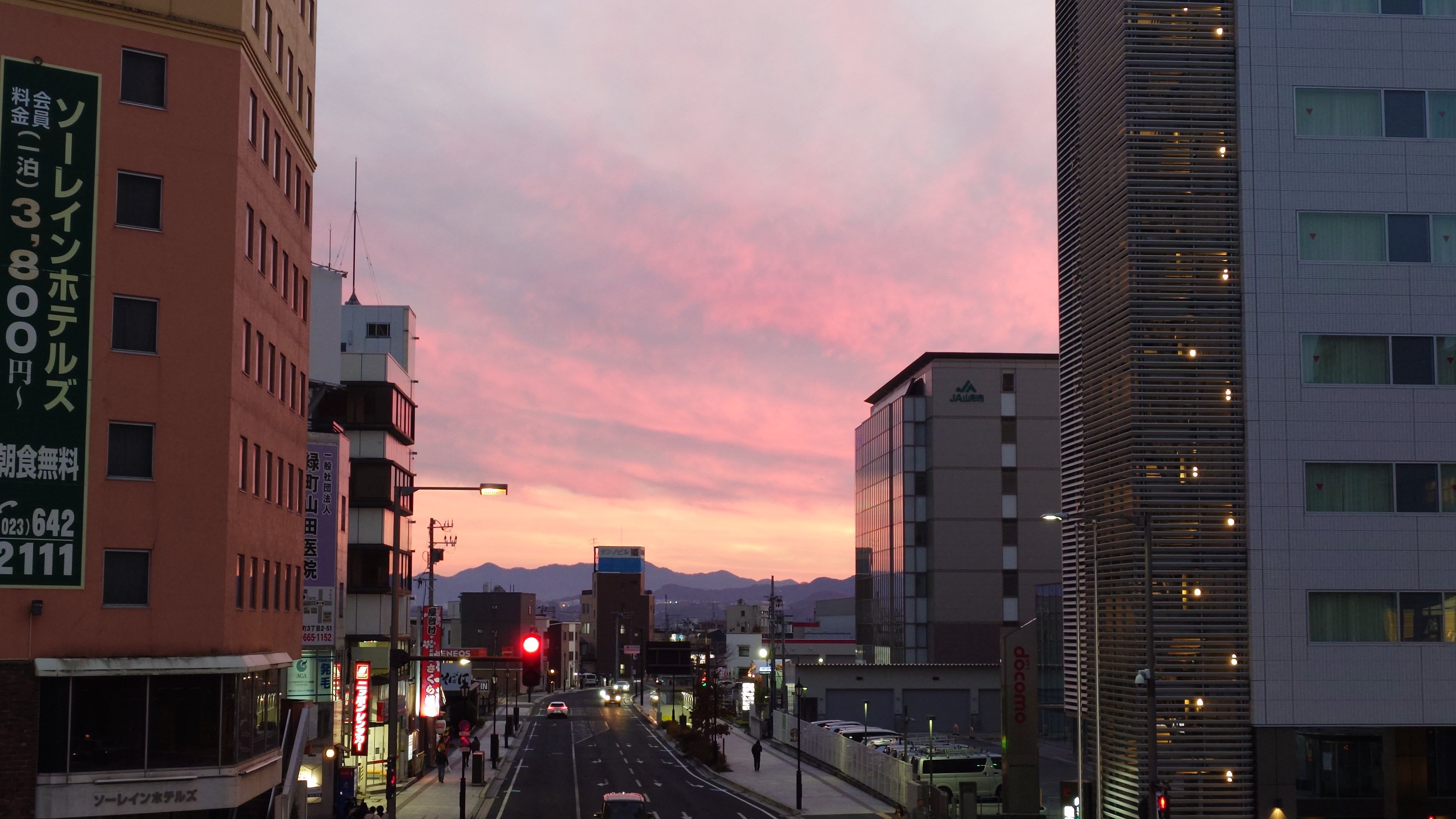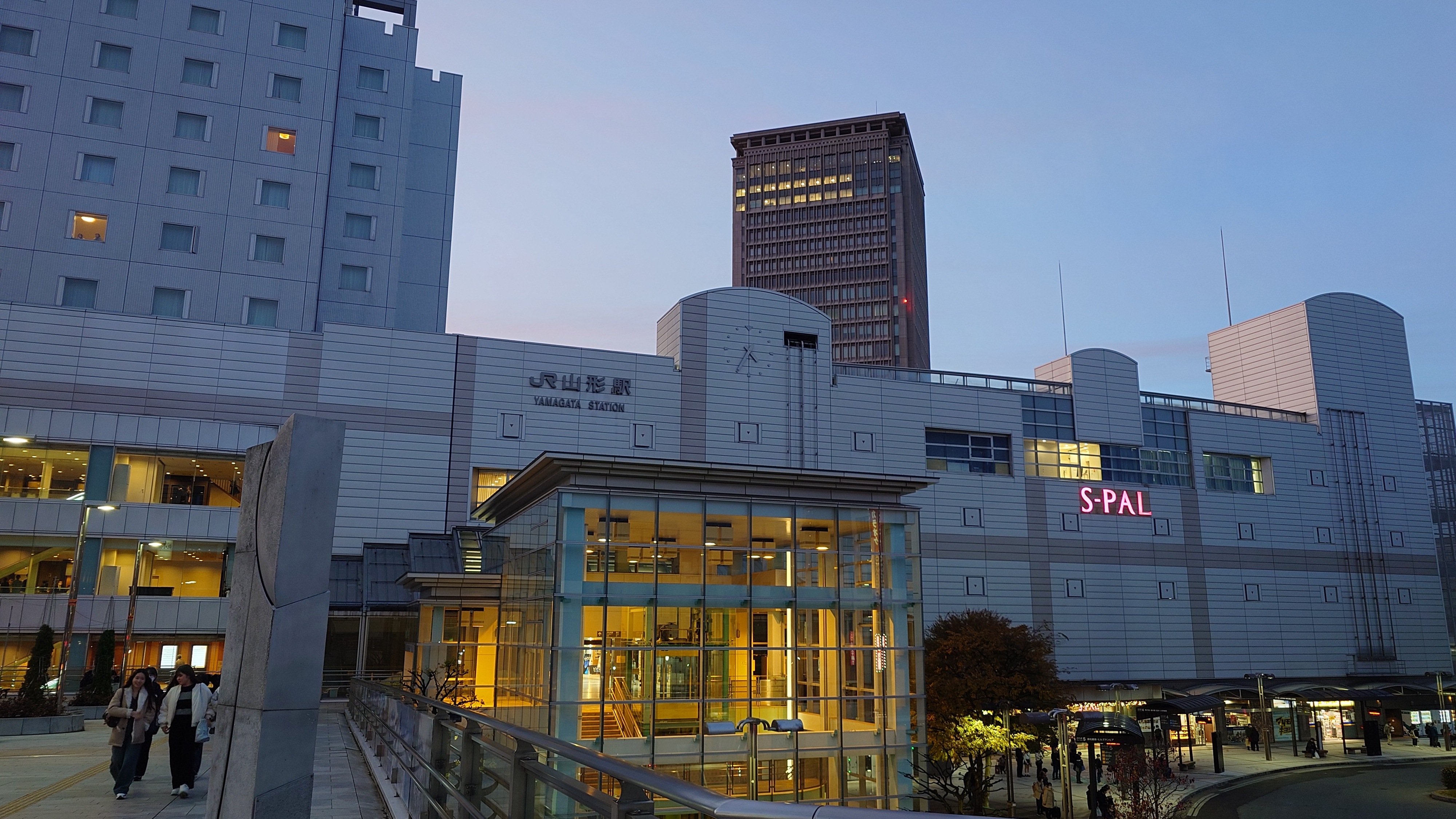 山形駅に着いたらもう夕暮れ。真っ赤になってます。山形市は7年振り。