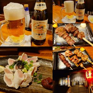 ささみのたたきでビール。まずは泡付けから。締まった身が美味しい。そして、おまかせ5本。