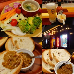 今夜はネボケへ。コーンスープのロールキャベツを食べながらバーニャカウダ。野菜が旨くてどんどん食べれます。マヨネーズももらってパクパクやってると、迷ってたおつまみカレー。メニュー外です。辛口のトロッとカレーをパケットにつけて。お腹いっぱい。