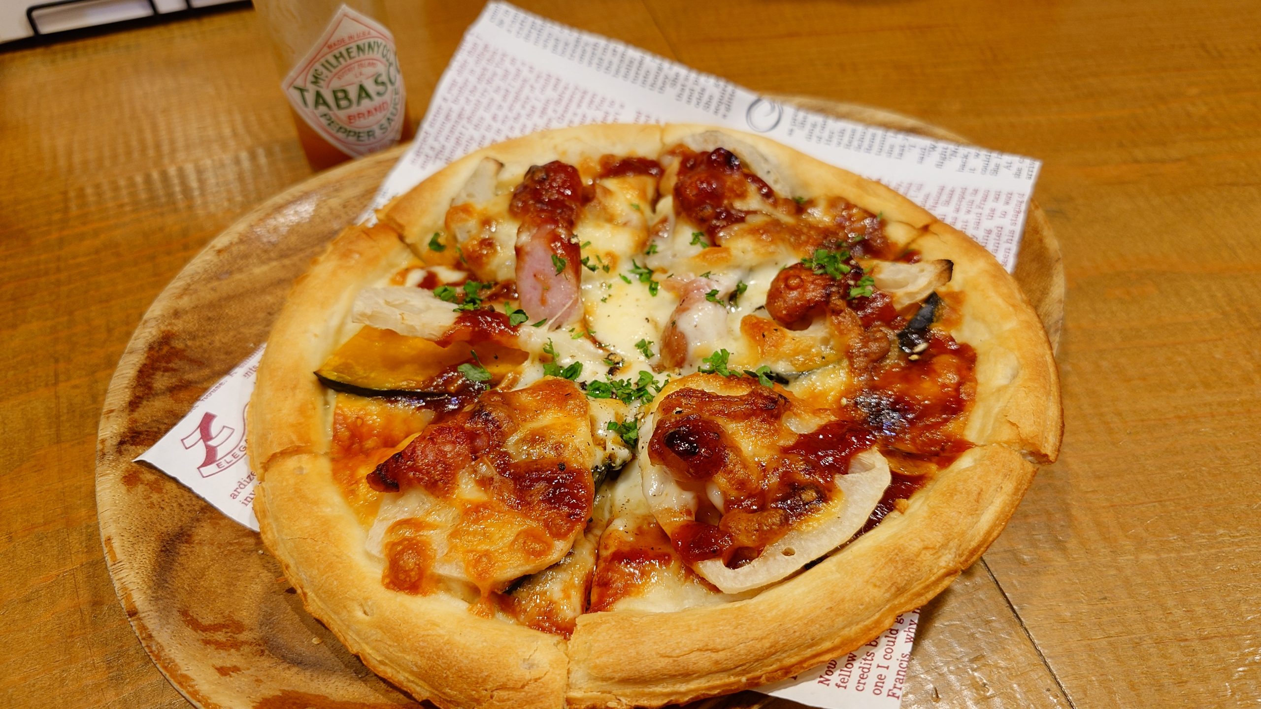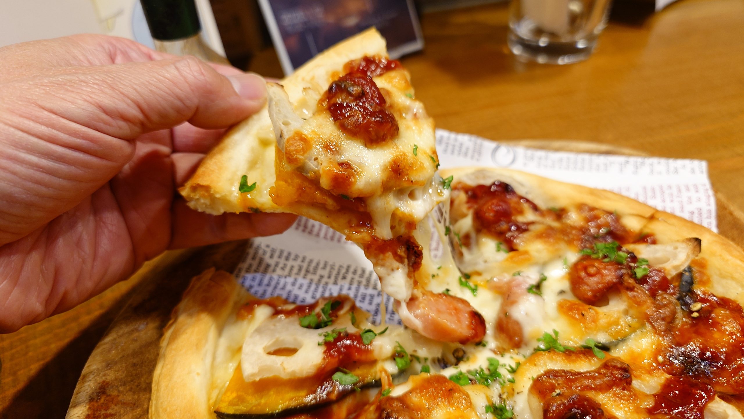 そこに冬ピザ。レンコンやカボチャが乗っててボリューム満点。BBQソースが美味しいです。