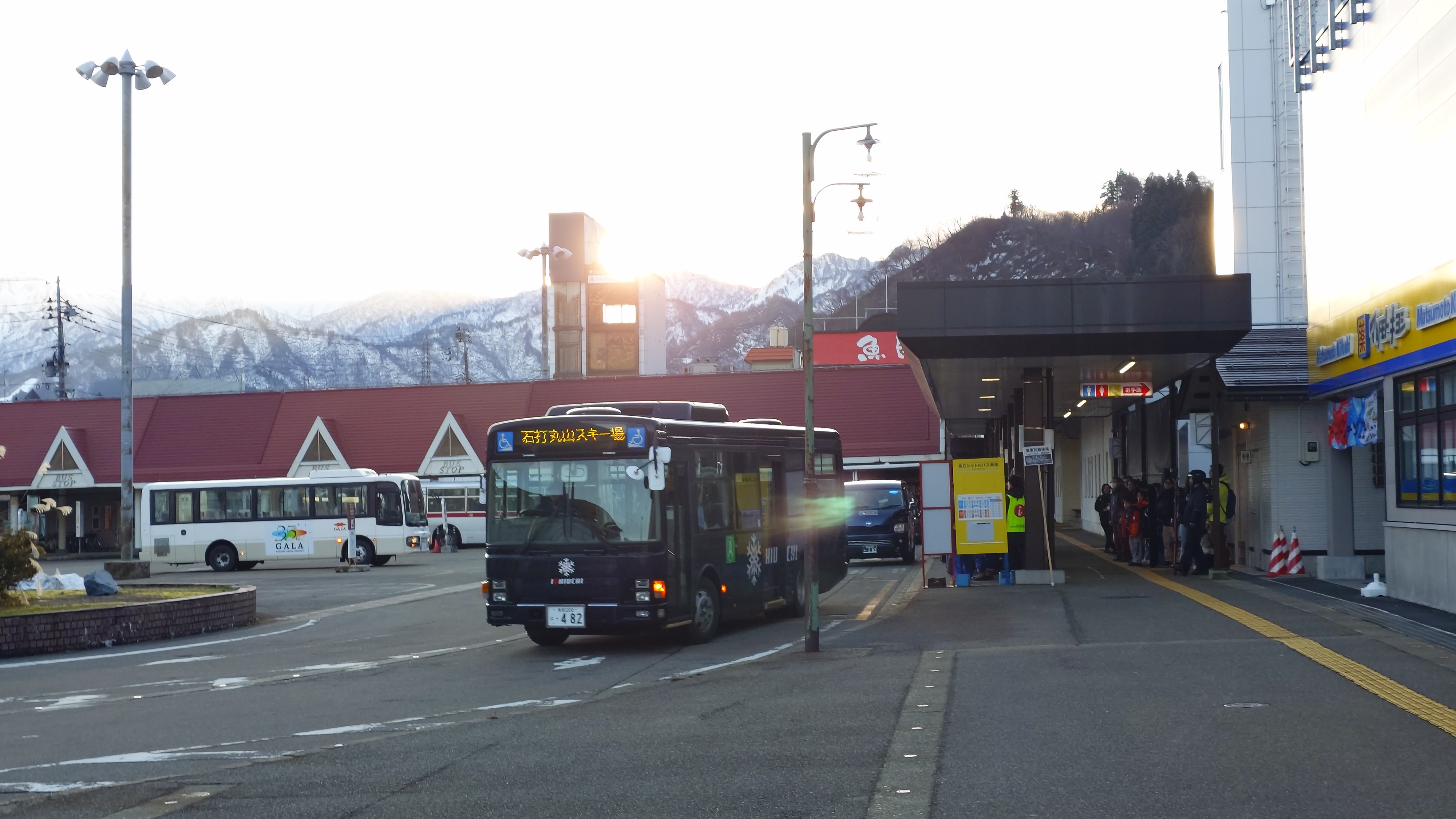 朝7:40便に乗ろうと東口に来たら、昨日オープンした石打丸山行き、かぐら苗場行きに行列。かぐらは積み残し2台目到着でした。