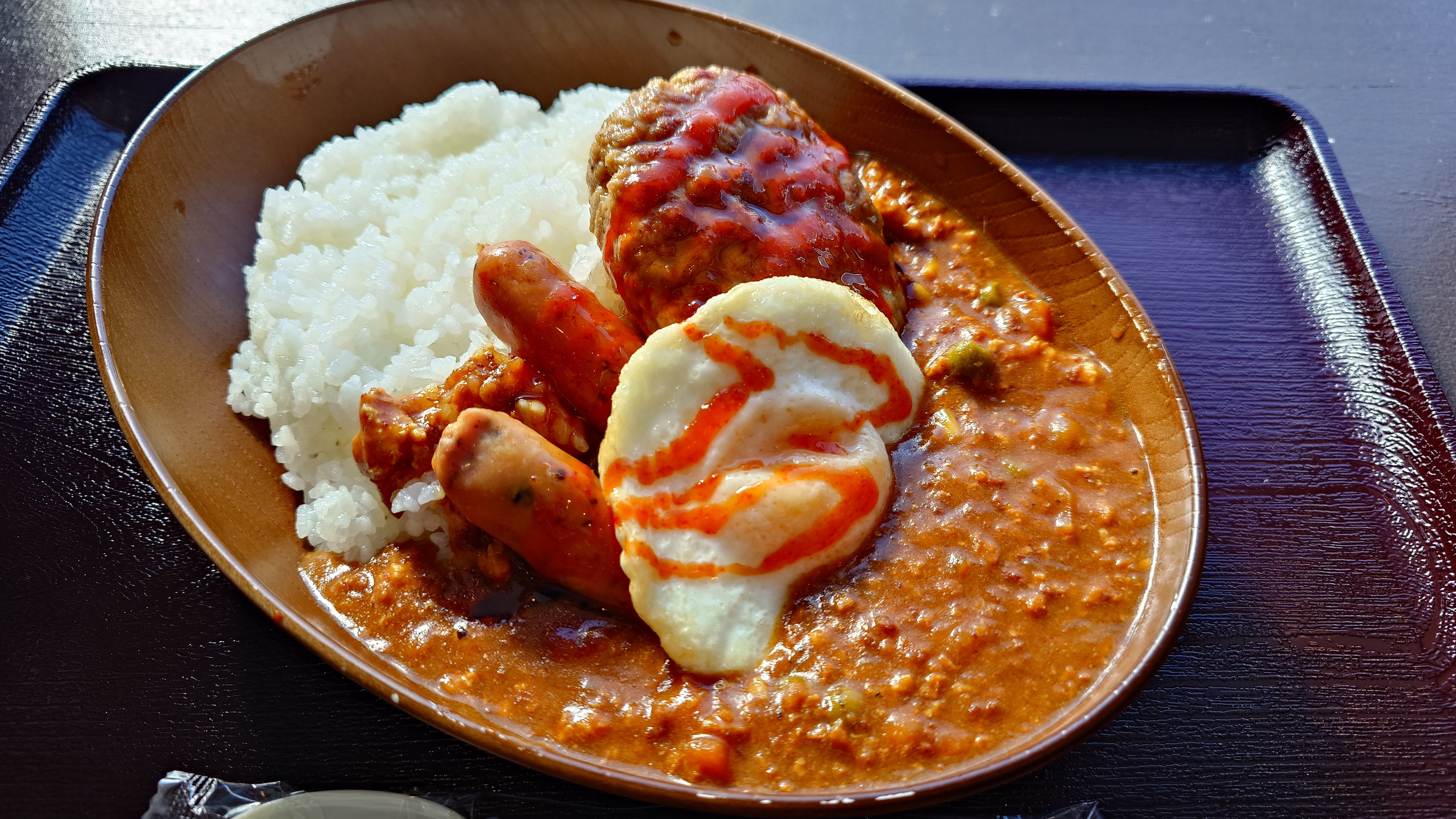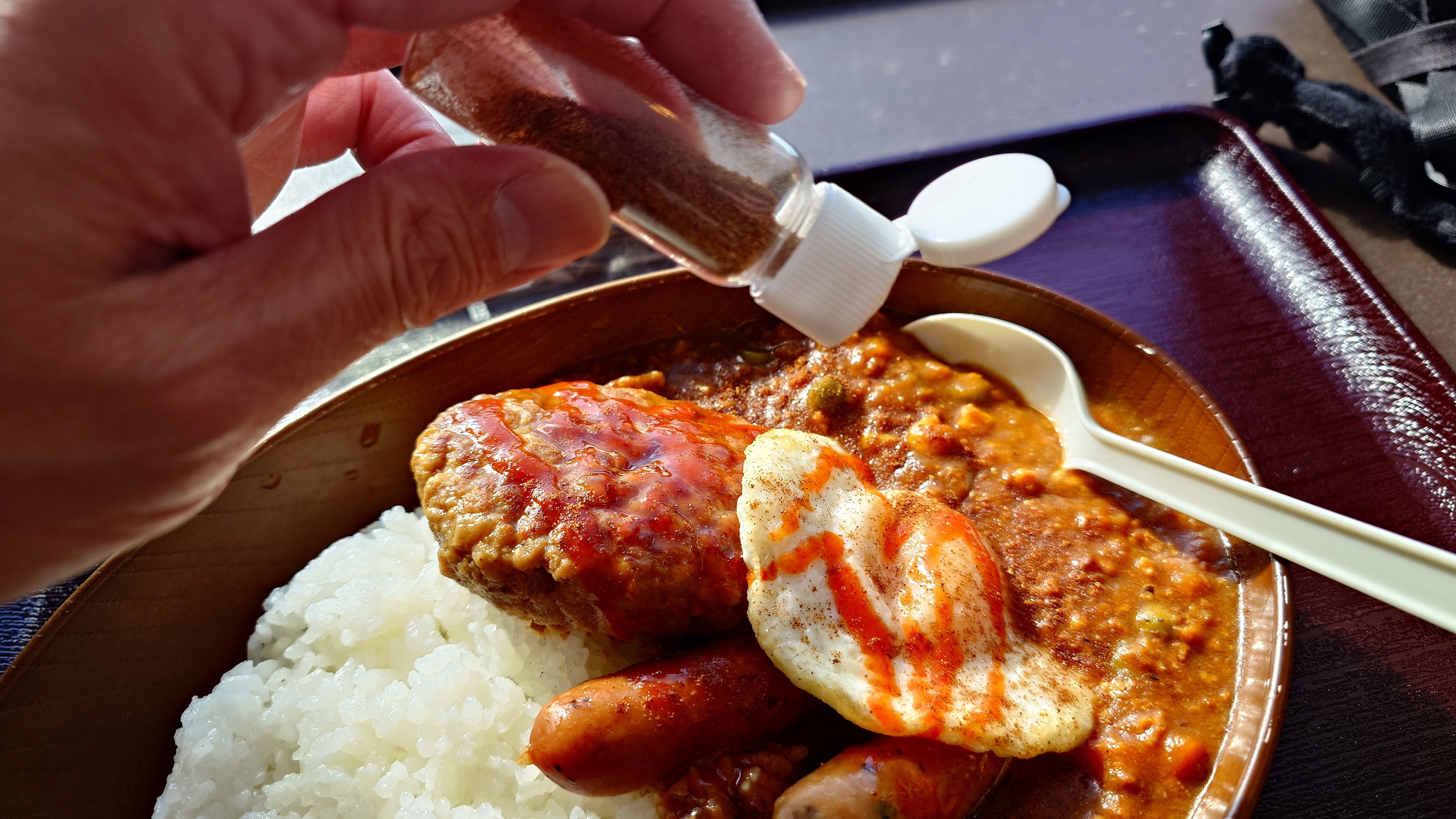 今年も店長が黒くて元気です。今シーズンもカレーメインの構成で、ハンバーグキーマカレーにしましたら、あれこれ付けてくれました。ありがたや。