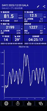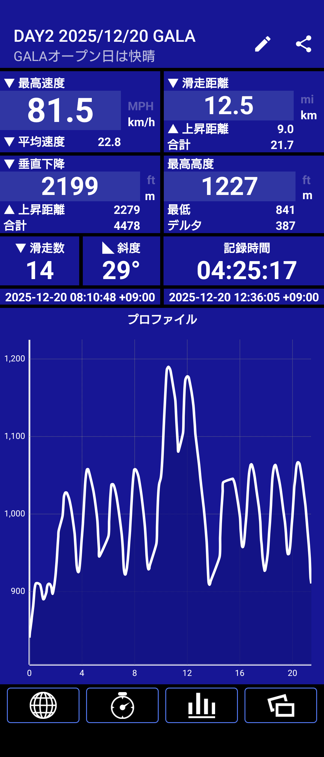 本日はこれにて上がり。記録を見ると、山頂4回のうち2回が抜けてますなあ。それでいても獲得標高2,200mなので、GALAならまあまあ滑った日でした。