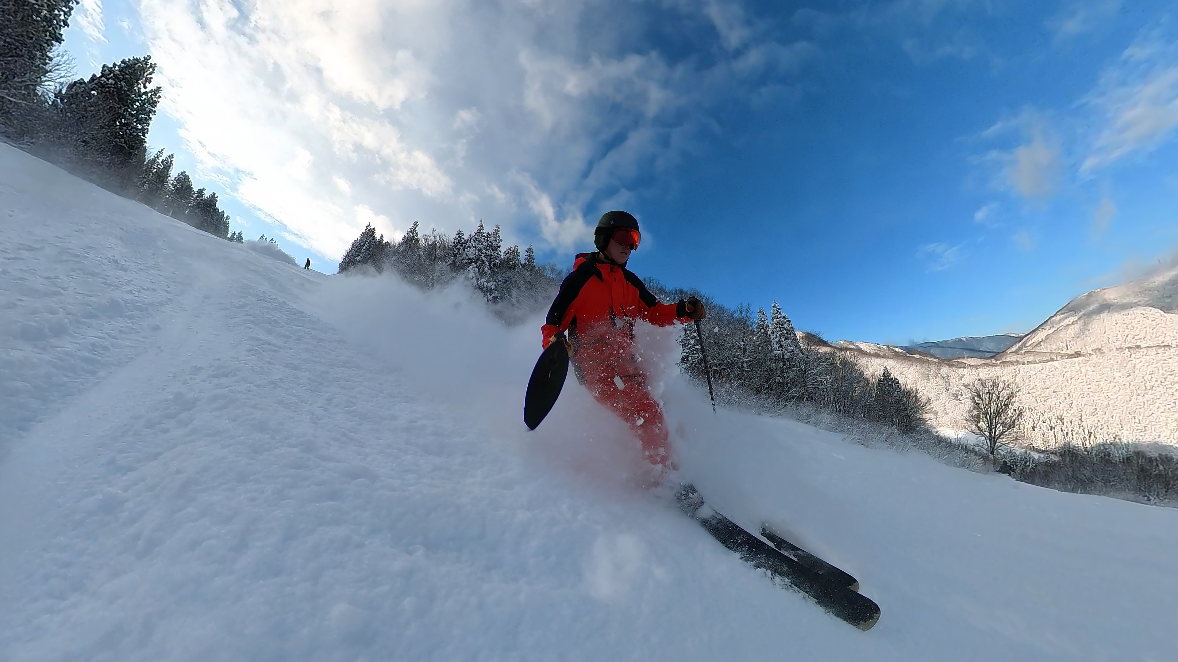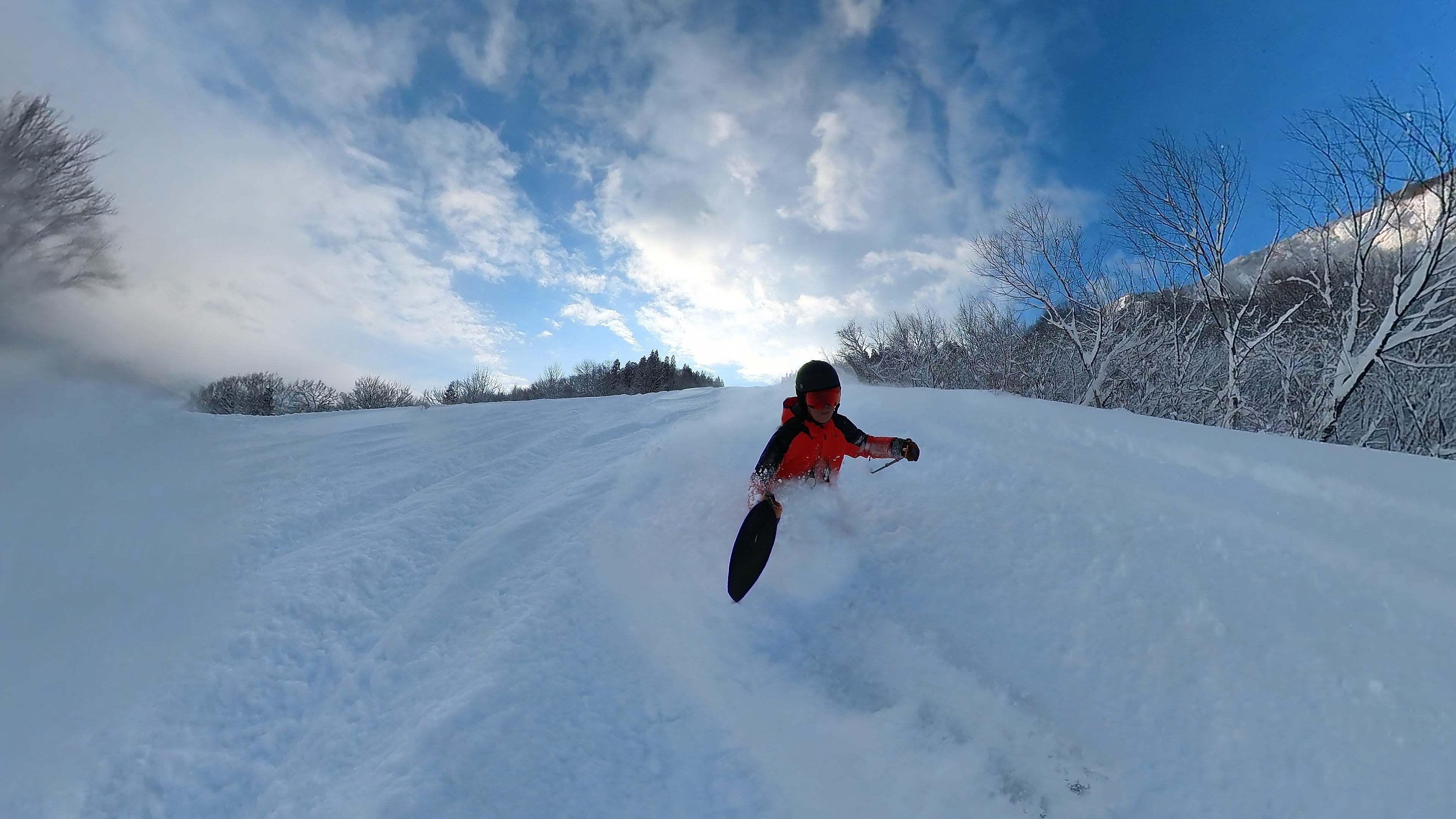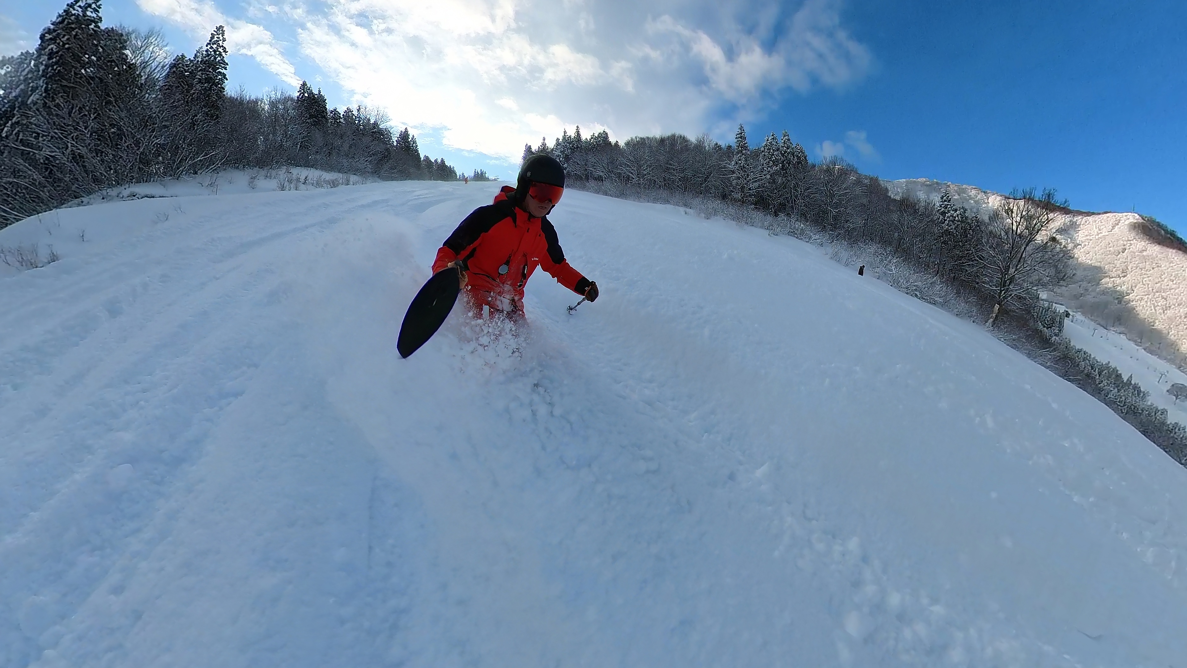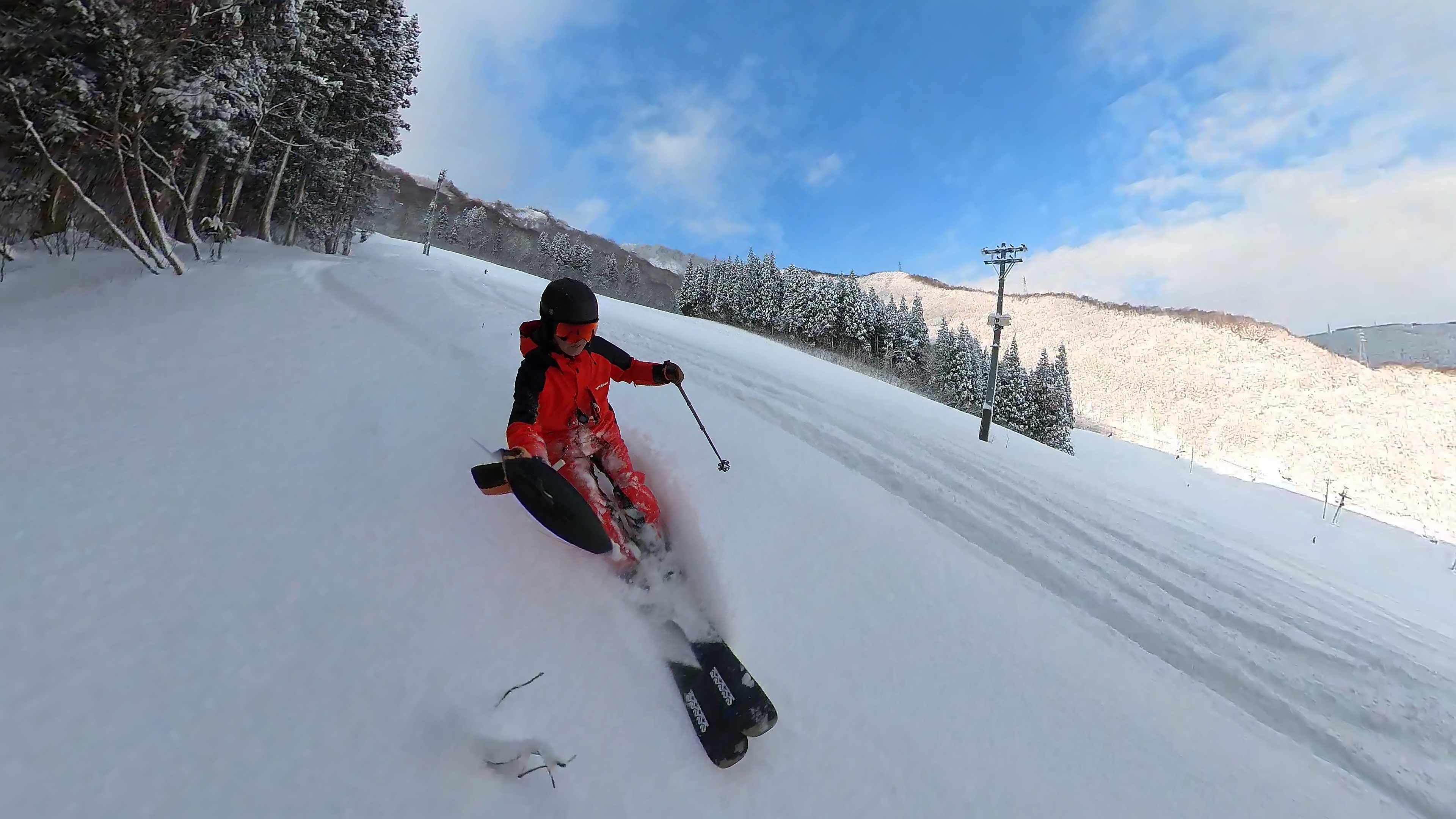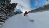 インナー2枚重ねの冷たい右手は我慢しつつ、ヘラクレス下部の急斜面を膝パウします。軽いパウダーなので、他のトラックを越えても衝撃が少なくて楽チン。