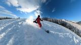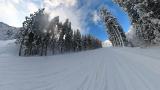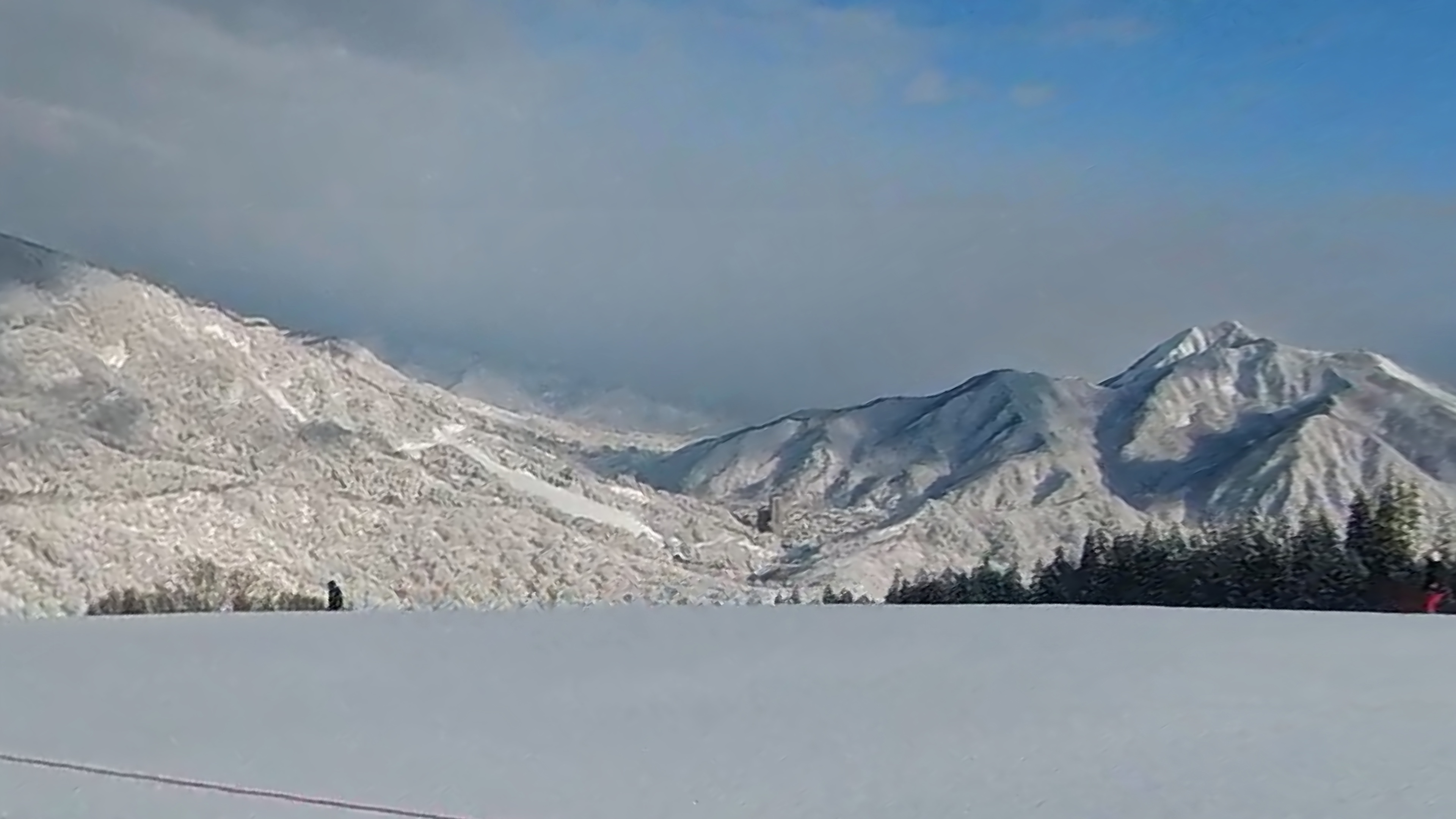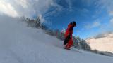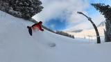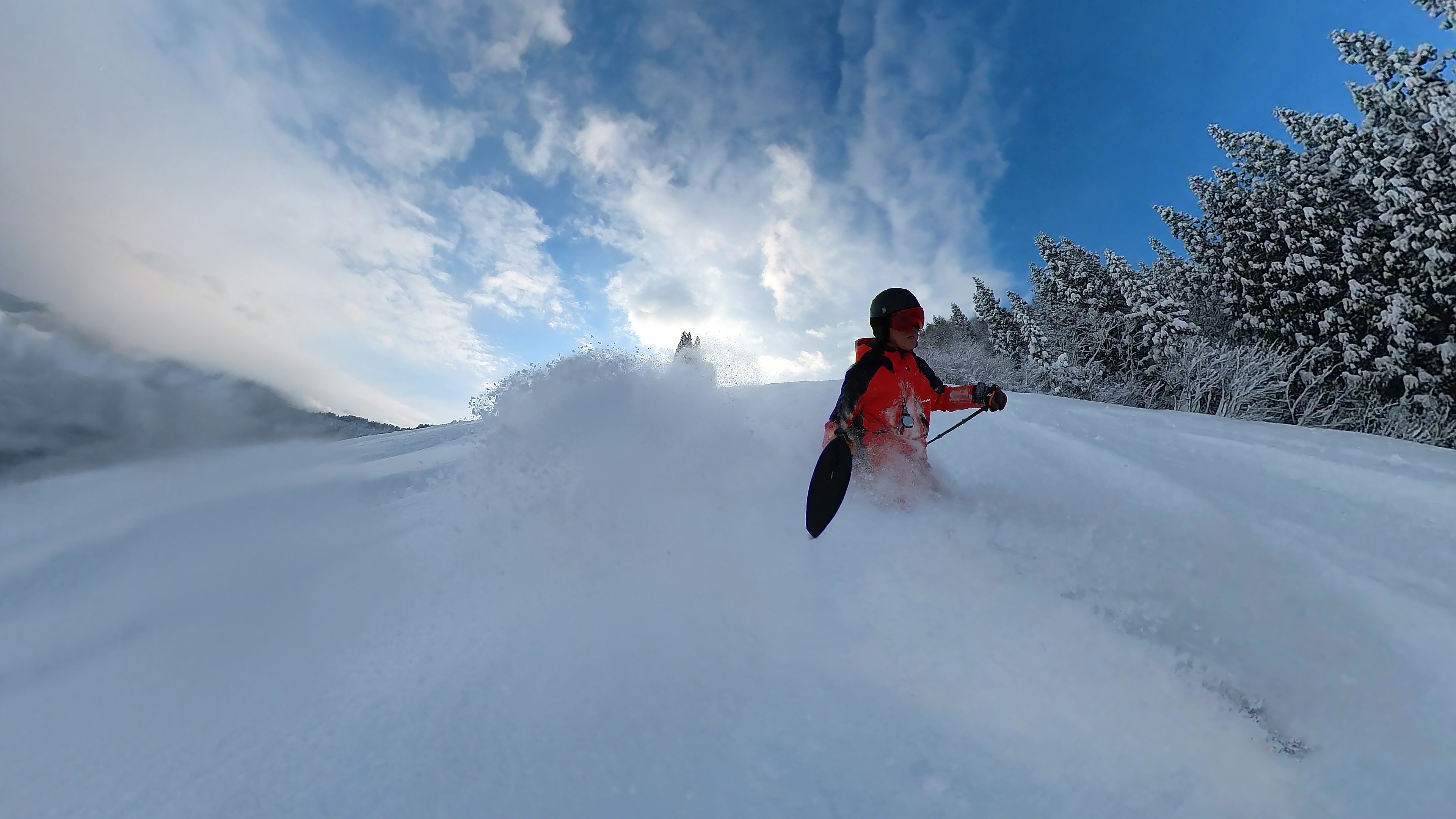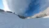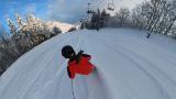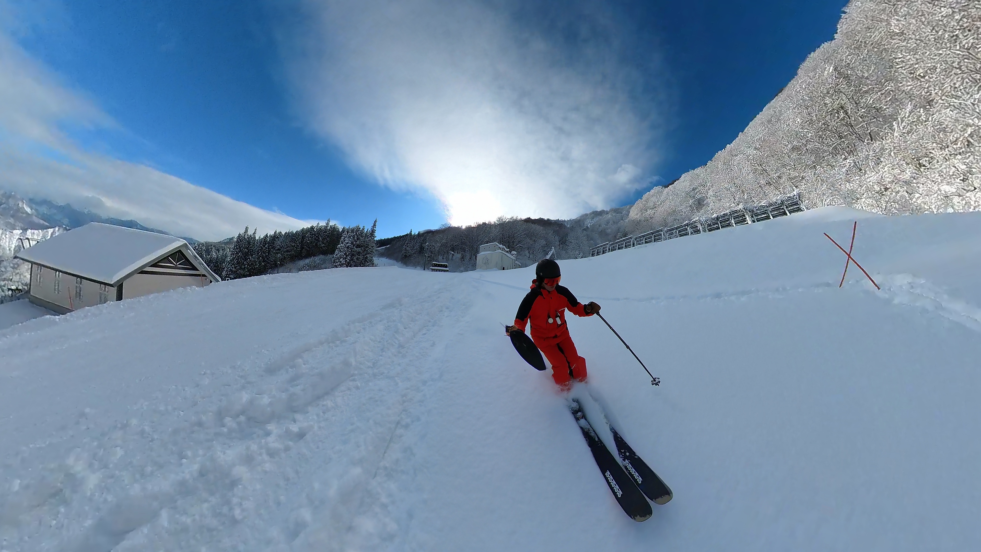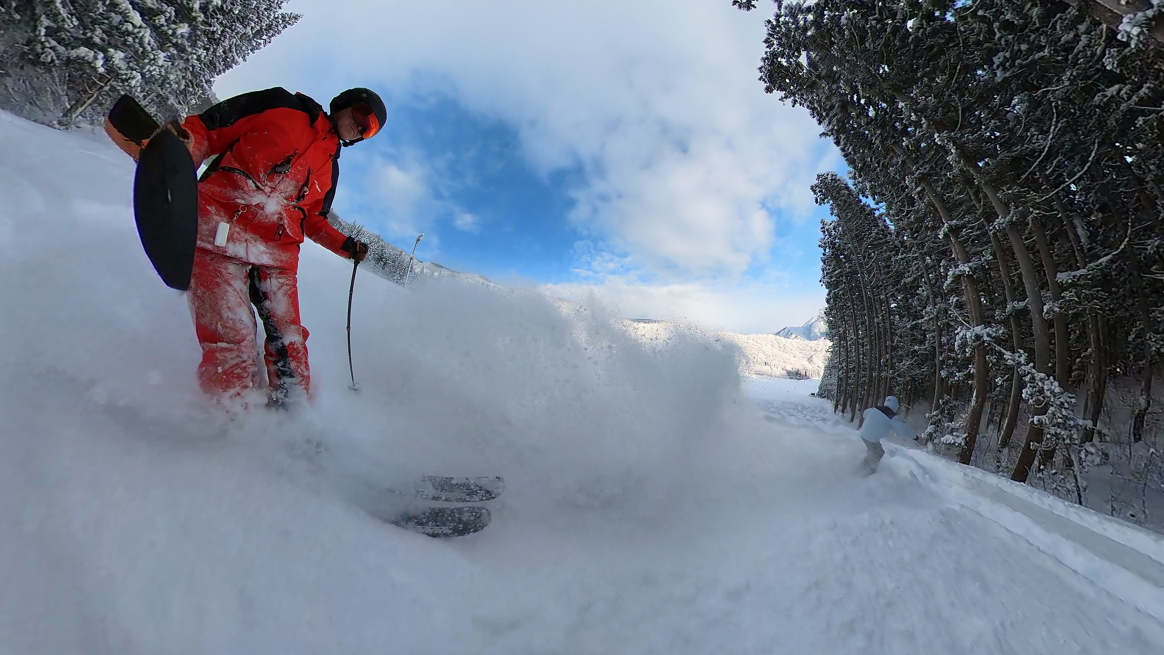インナー2枚重ねの冷たい右手は我慢しつつ、ヘラクレス下部の急斜面を膝パウします。軽いパウダーなので、他のトラックを越えても衝撃が少なくて楽チン。