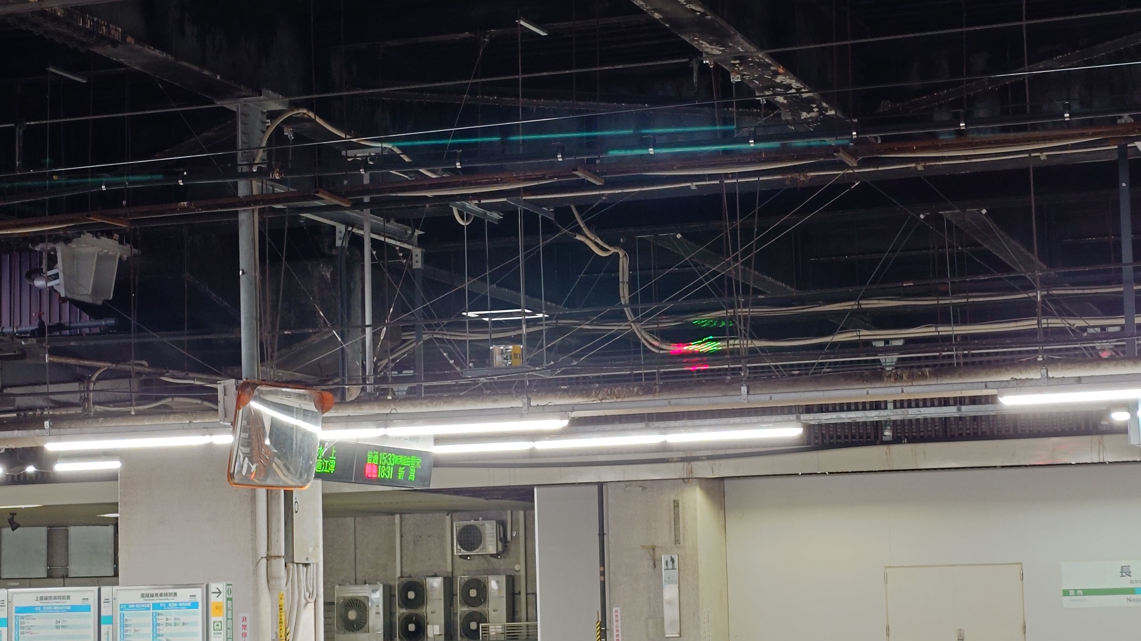 あきらめて、信越線~上越線で湯沢帰着。長岡駅ではホーム天井に向かって、クラブイベントなどで使うレーザーがくるくる回ってます。なんだこれ?