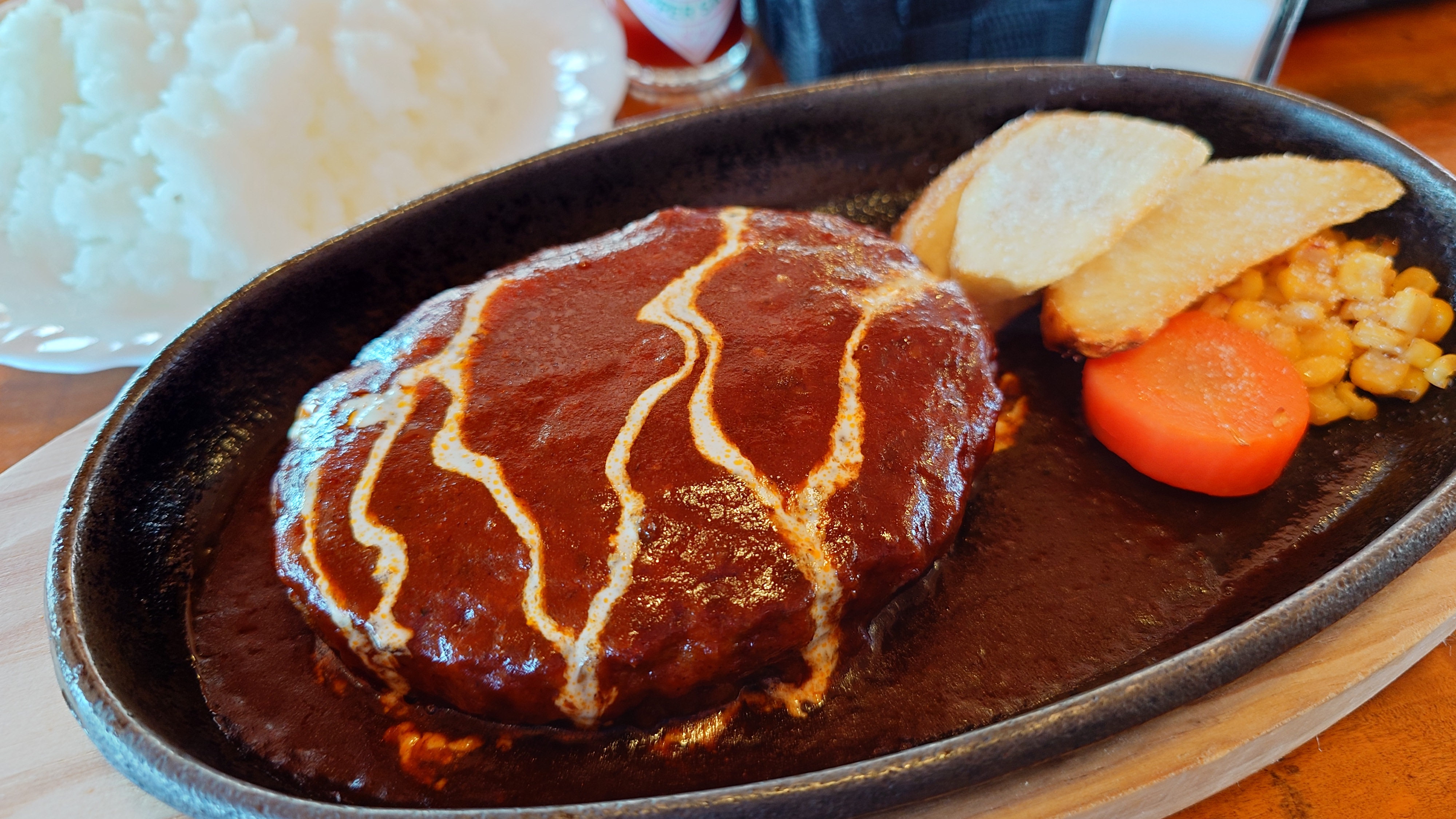 自家製ハンバーグステーキ デミグラスソースで。コクのあるデミにタバスコドバドバさせていただくのが通例となっています。ご主人の時はサドンデスソースまで出てきたたり。よくこねられた香りよいミンチに、美味しいコシヒカリ。今日は快晴の絶景でさらに美味しくなります。