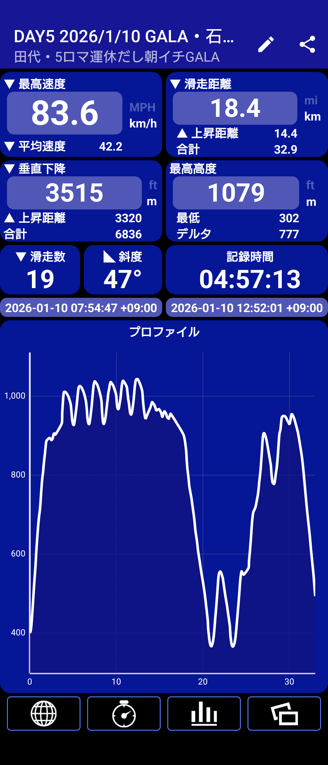 今日は滑走19本、獲得標高3,515mでした。下山コース行くと伸びます。脚が重い。