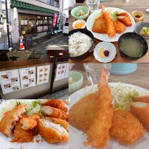 とんかつとか揚げ物系に丼ものやラーメンなどもあります。この辺であまりないミックスフライ定食で。エビ、アジ、白身、コロッケと王道です。そして、湯沢産コシヒカリが旨い。