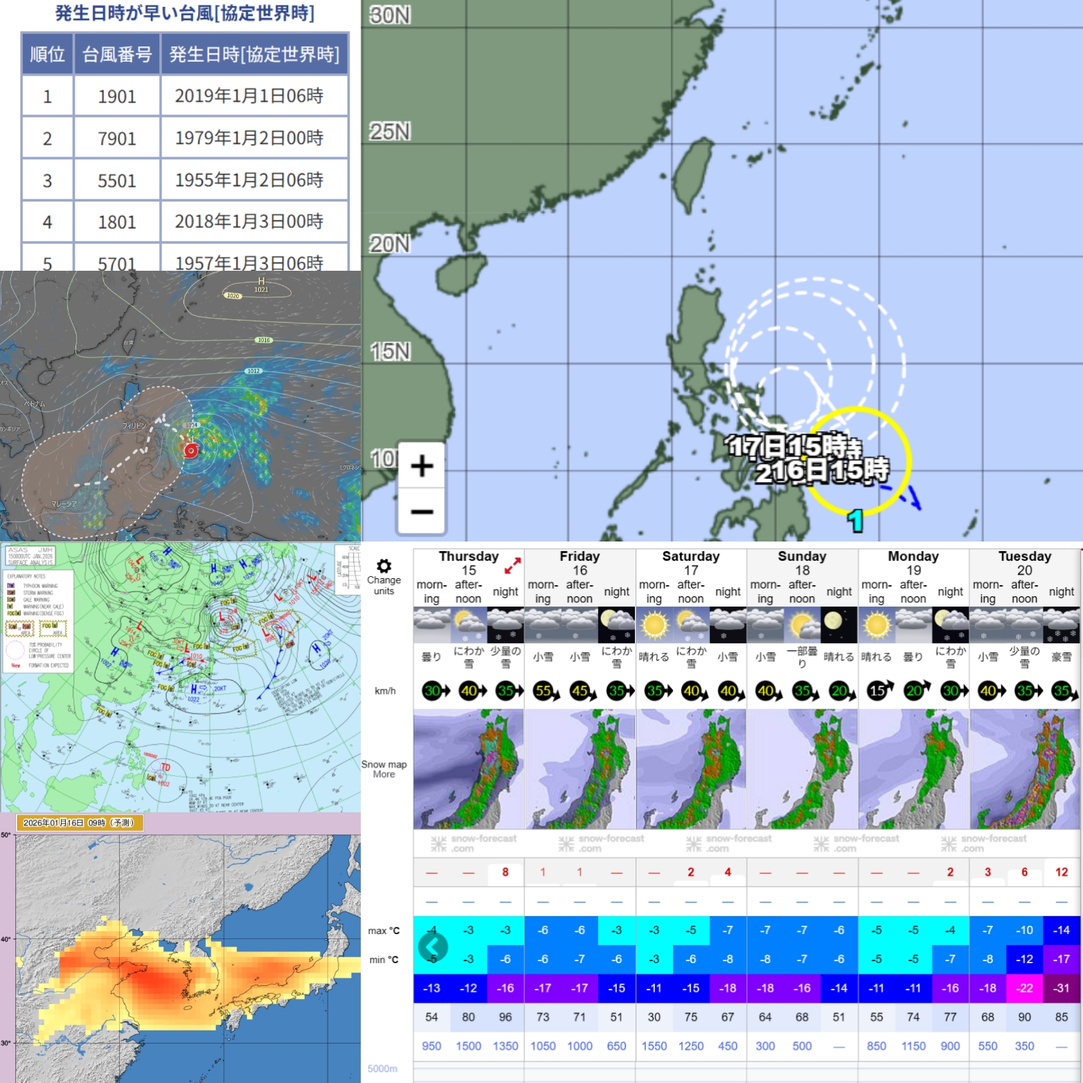 明日辺りから、凄い早い黄砂が本州全域にやって来そう(左下)とのニュース。妖怪板掴み出没は嫌だなと天気図見てみたら、台風1号が出来てました。1月の台風発生は珍しくありませんが、昨年は6月に1号でしたから。フィリピン辺りをうろうろしそうです。