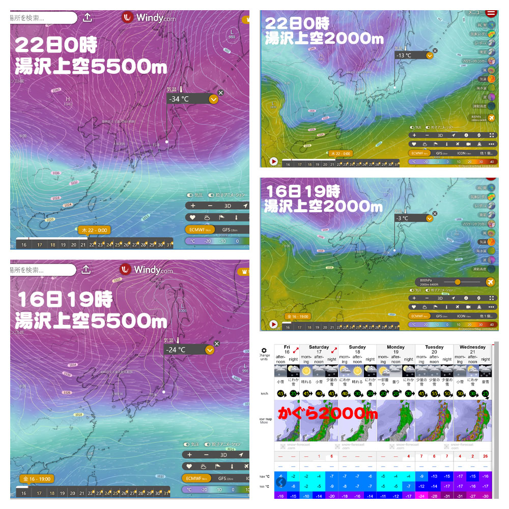 日本上空5,500mで-34℃予測 公開済み 2026年1月16日 · 更新済み 2026年1月19日 この数日暖かかった本州ですが、来週火曜夜辺りから崩れて、水曜からは寒い予報。日本列島の上空5,500m(500hPa)で、現在-24℃ですが、-34℃になっています。ここ湯沢も水曜から大雪予測が出ています。神楽ヶ峰付近2,000mでは-13℃に。等圧線の幅も狭いので来週末までまとまった雪が来そうな気配です。 Uploaded by 鷲津 数聖 2026-01-16T10:46:36.000Zvia Facebook https://ift.tt/K9eyTpn