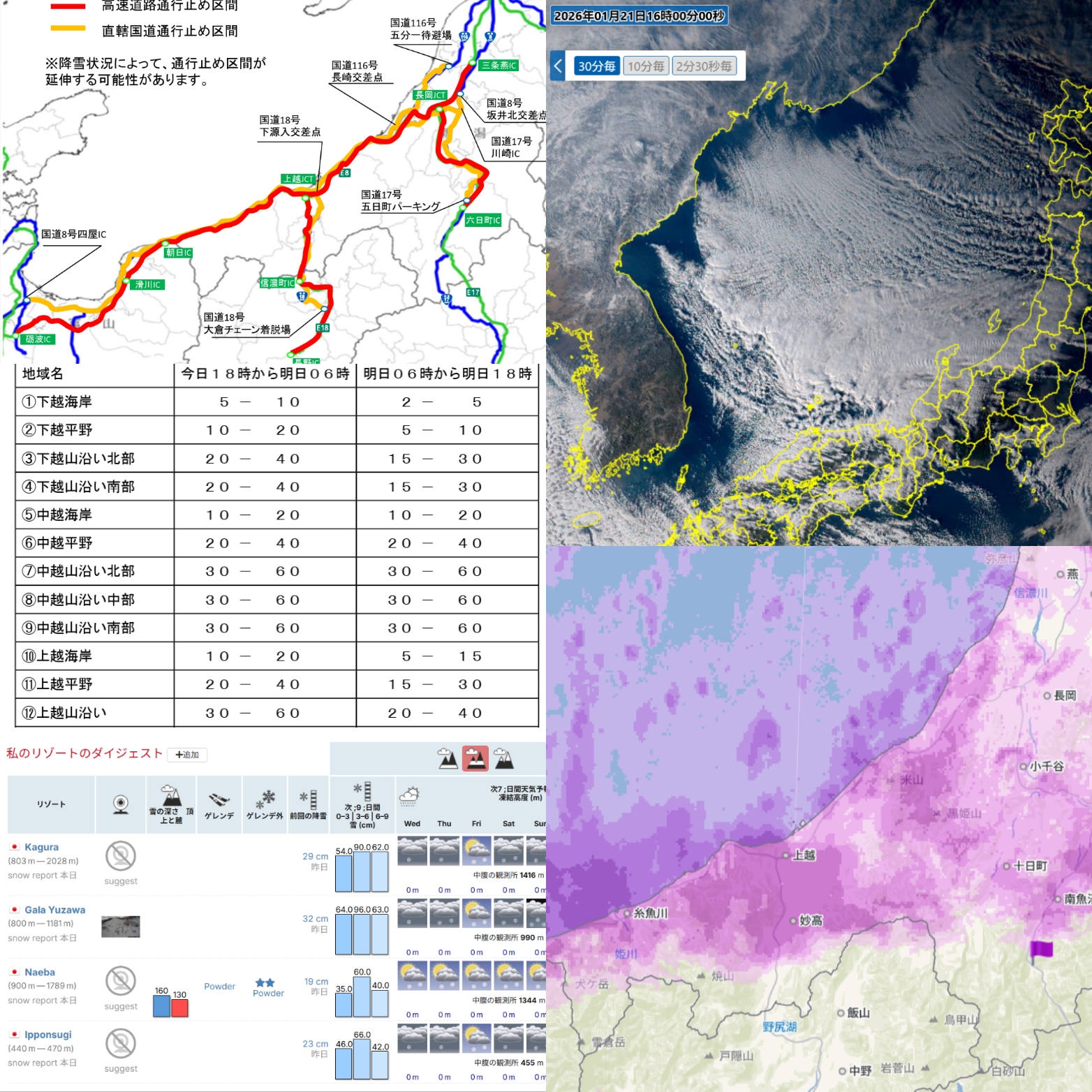 新潟県のローカルニュースでは、明日の関越道規制は六日町以北、JR上越線は今夜から水上~長岡間が運休見込み。