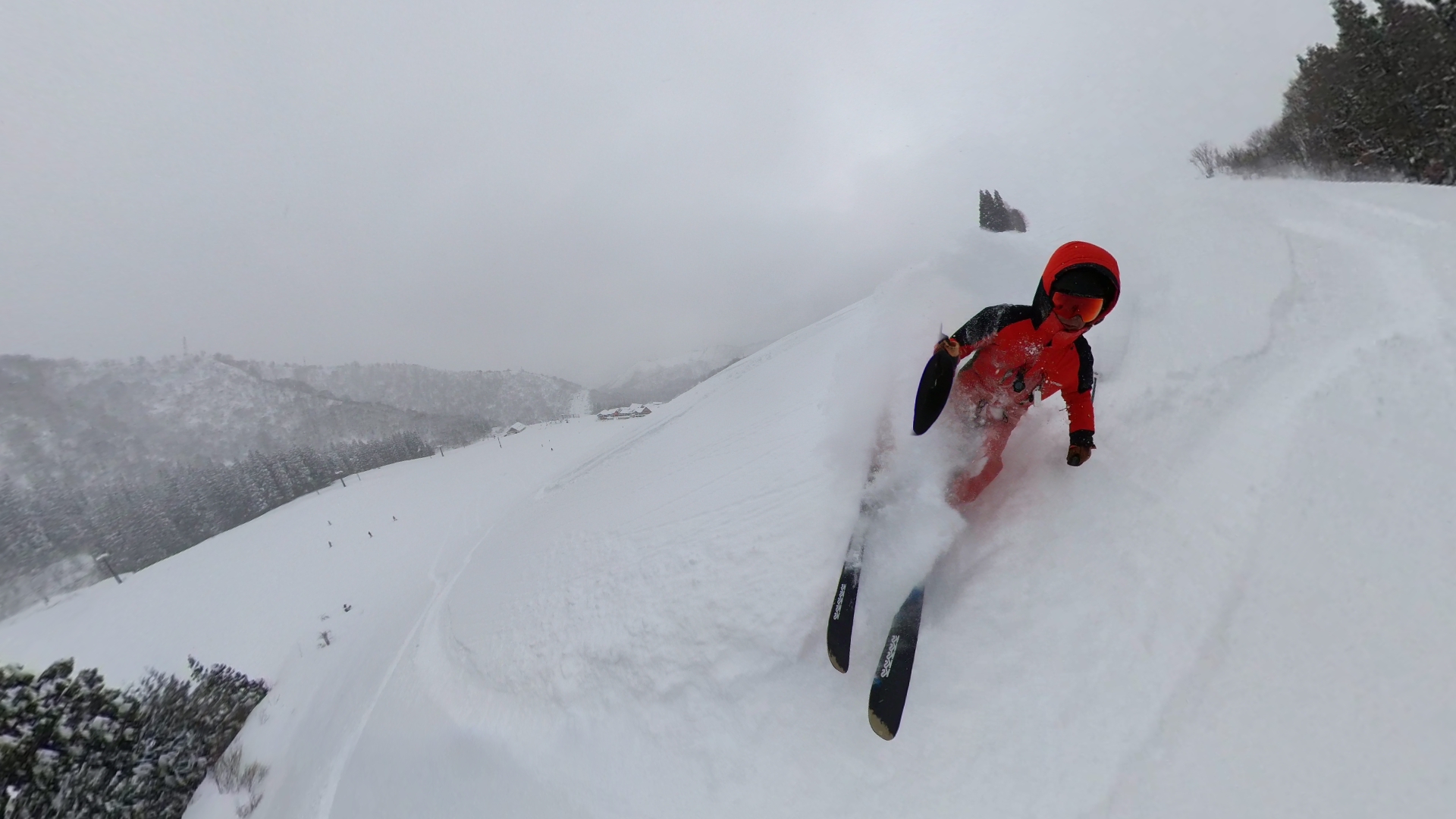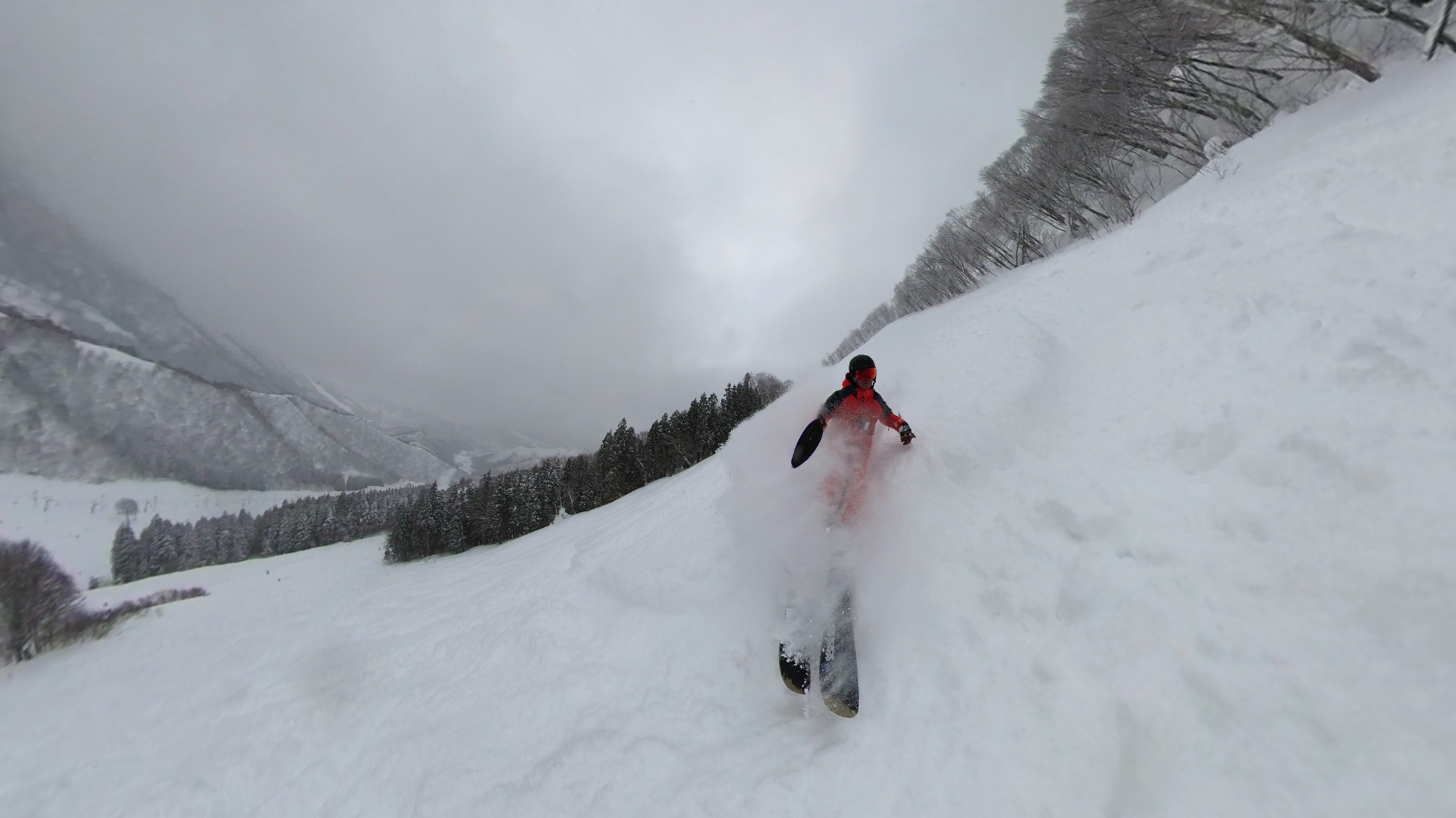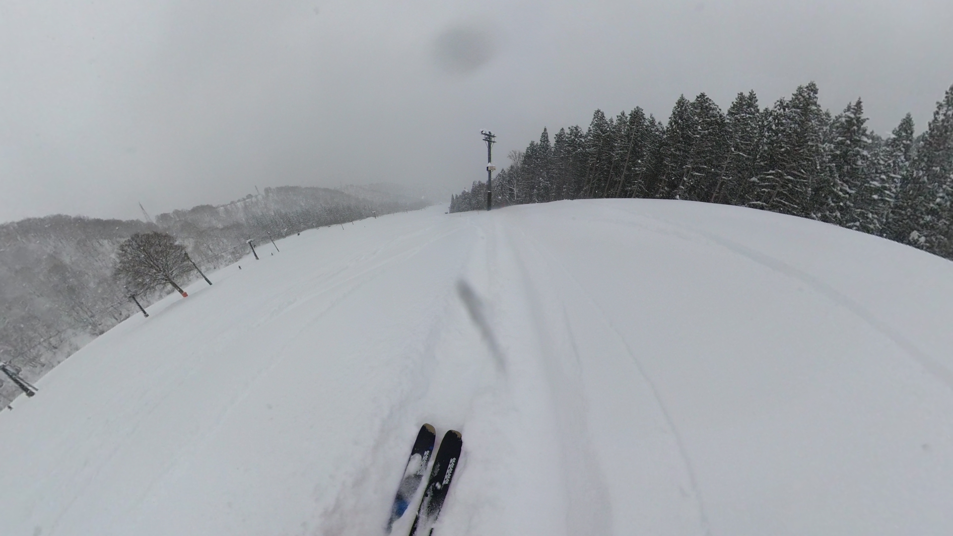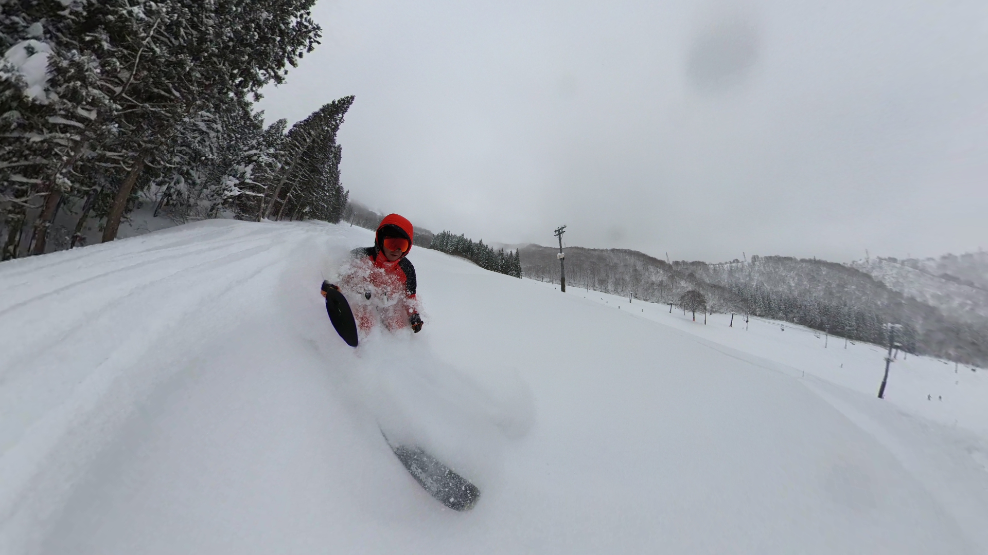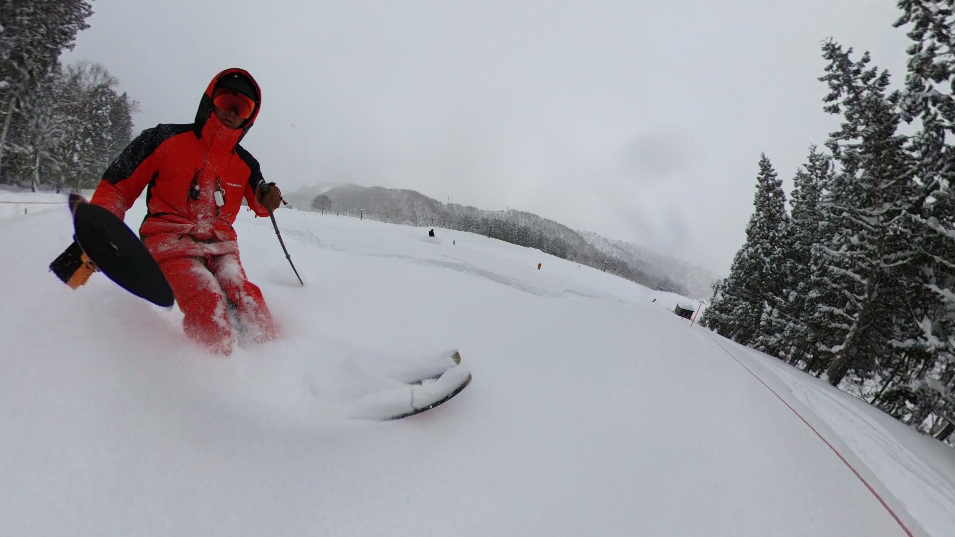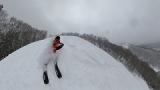 かぐら5ロマ付近に比べると、回すのに力がいる雪の重さではありますが、それでも軽い。段々畑の段差が不意打ちするので飛び跳ねちゃいます。
