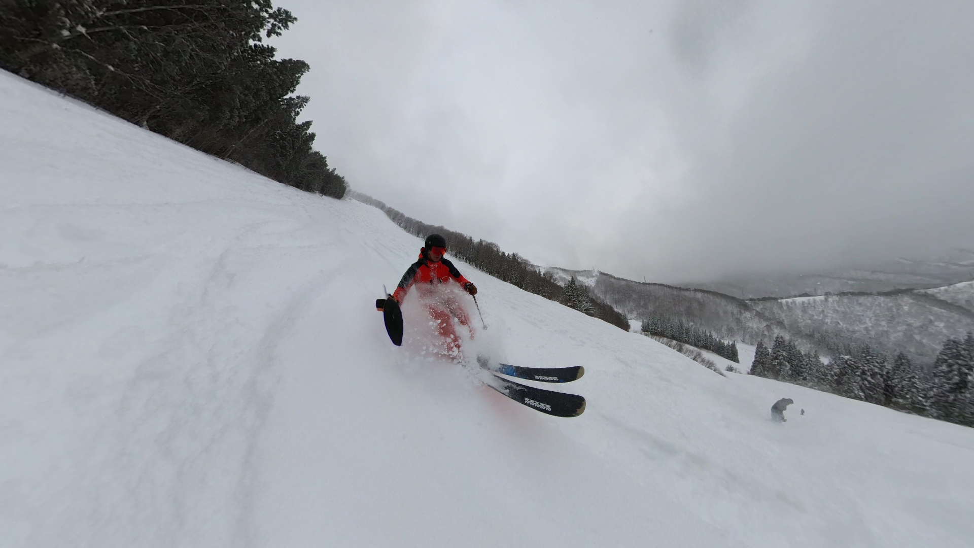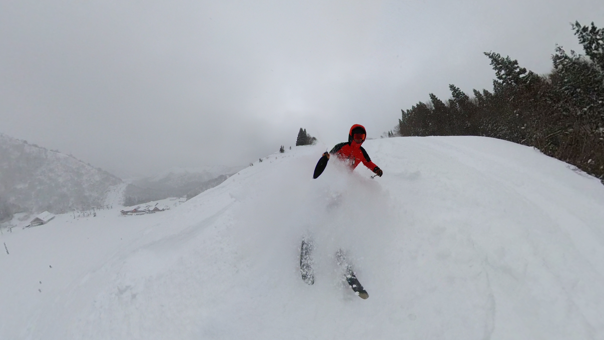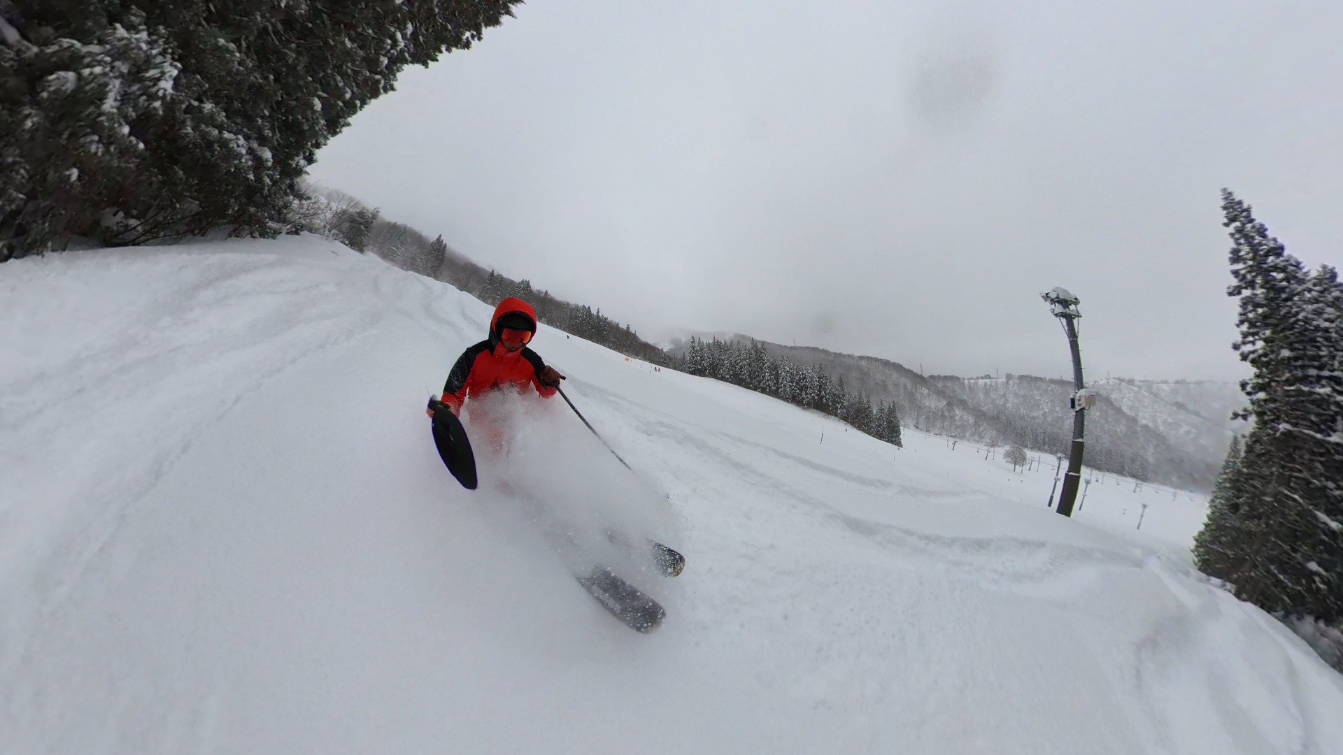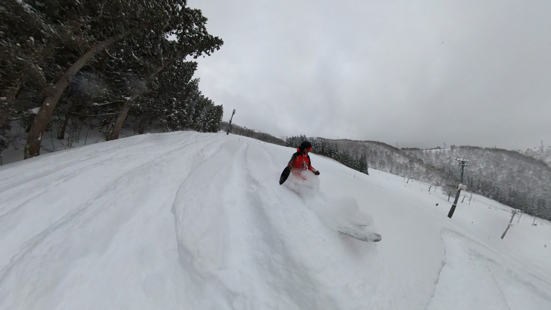 かぐら5ロマ付近に比べると、回すのに力がいる雪の重さではありますが、それでも軽い。段々畑の段差が不意打ちするので飛び跳ねちゃいます。