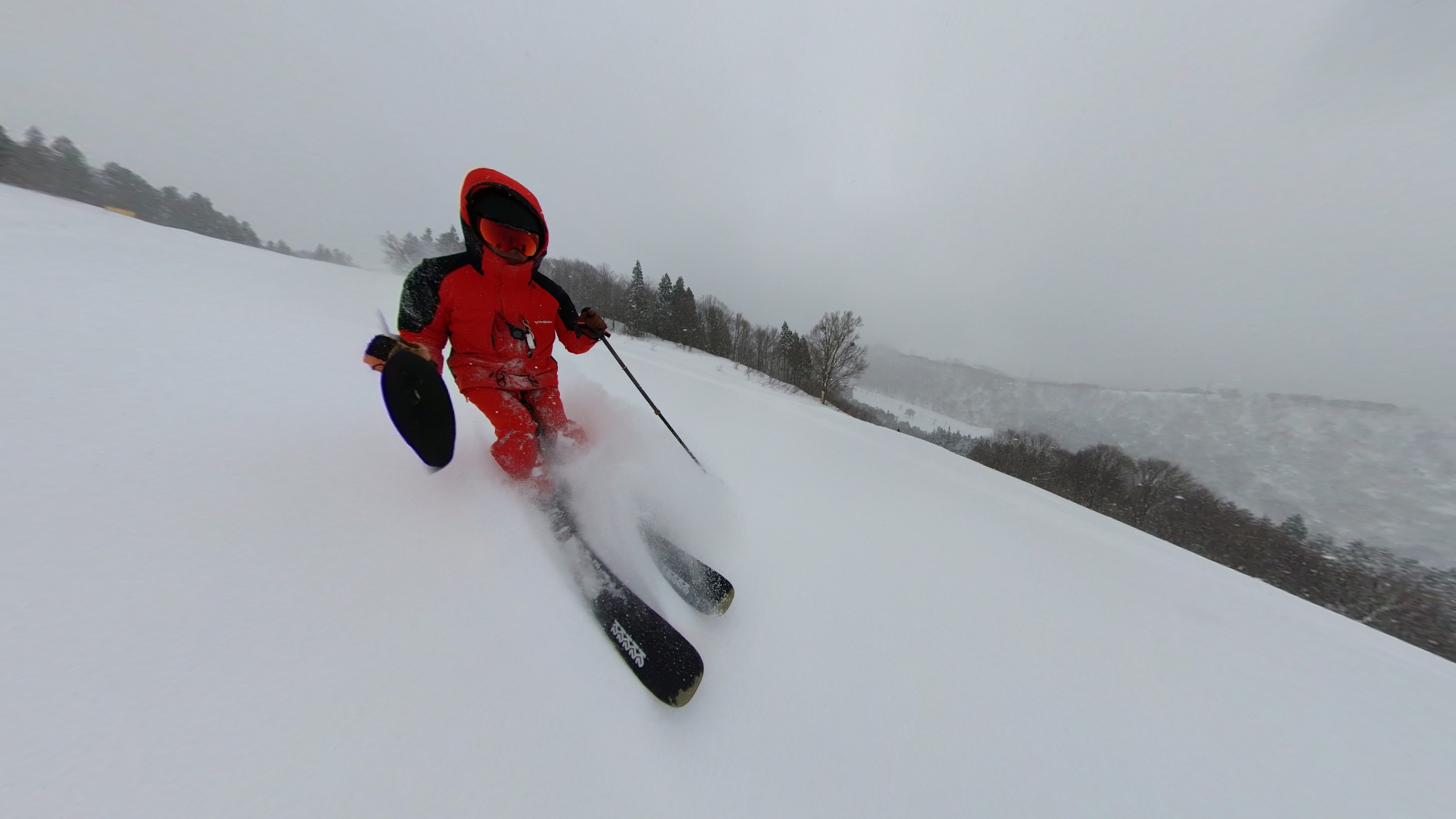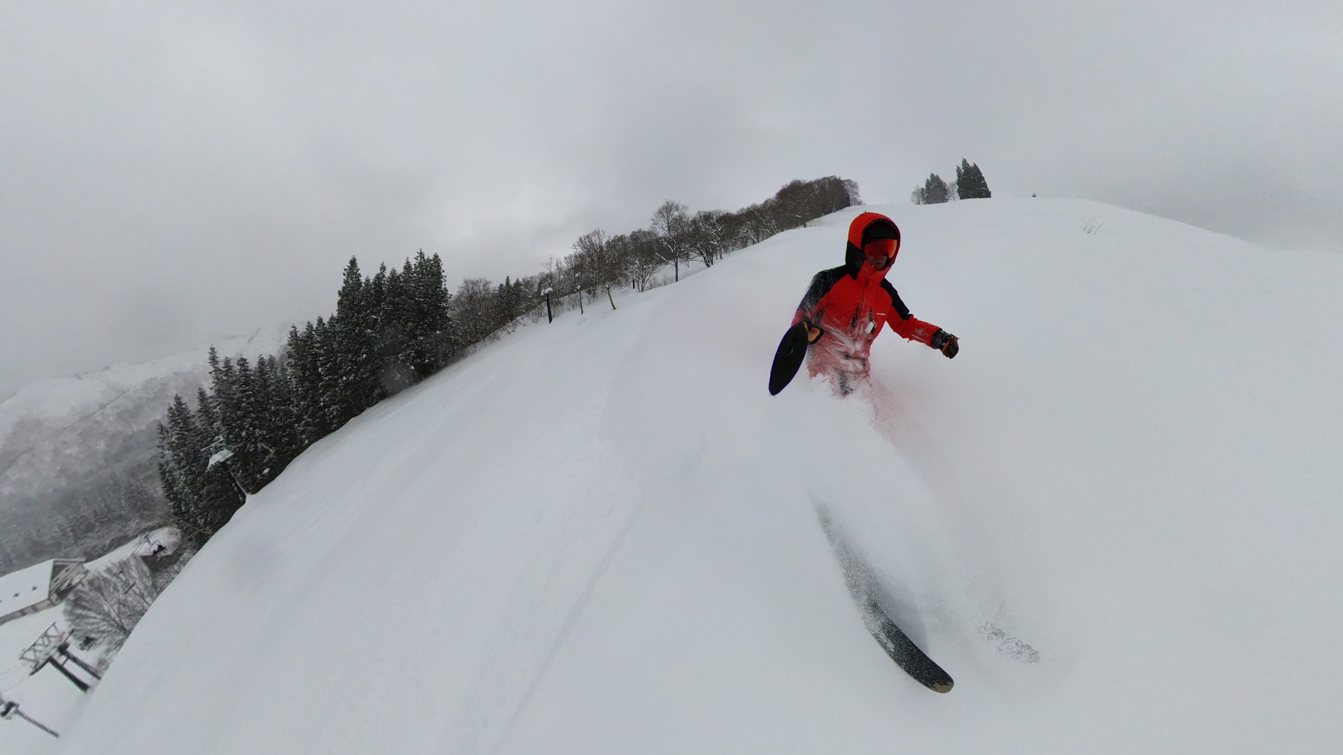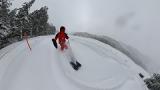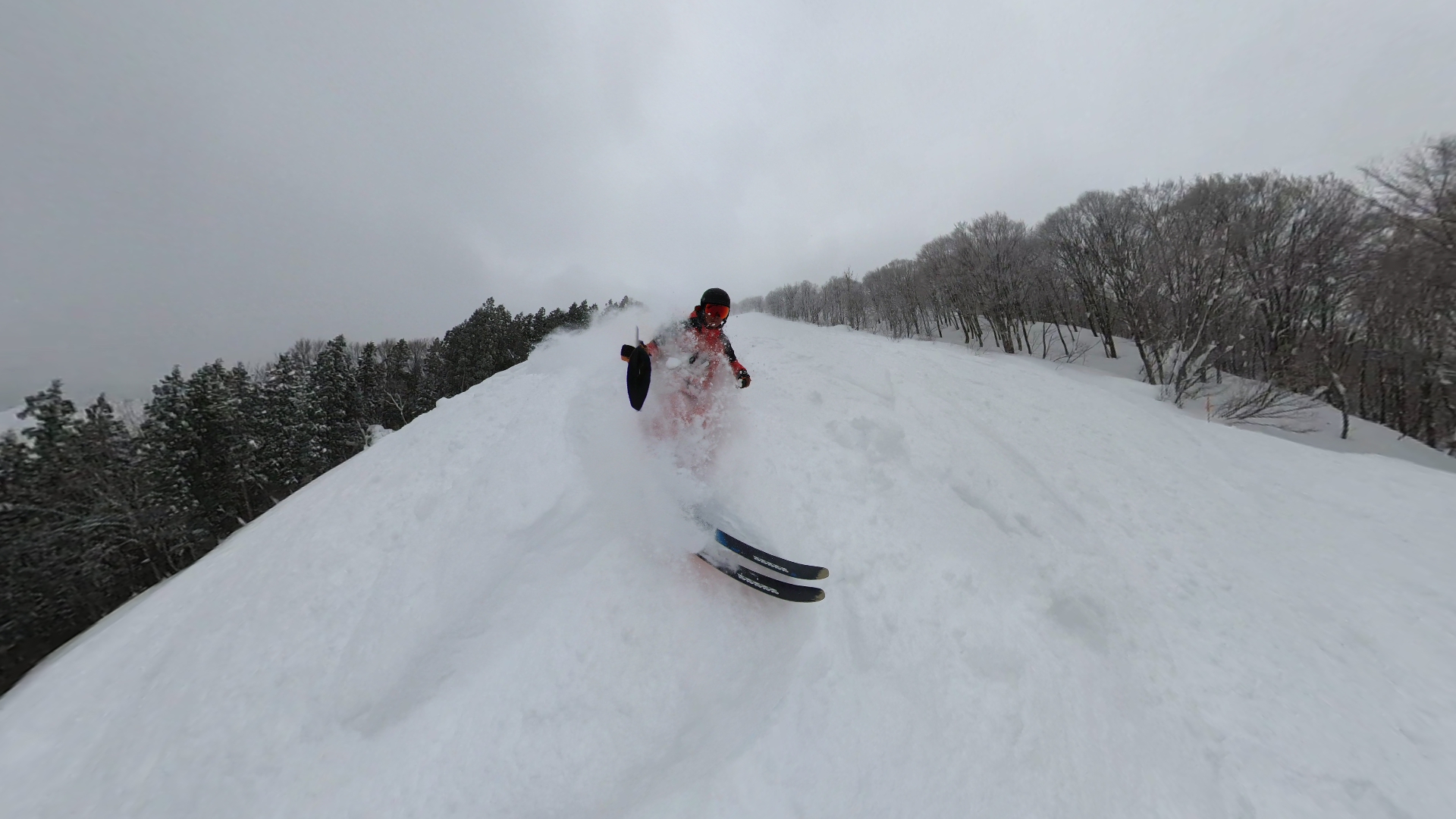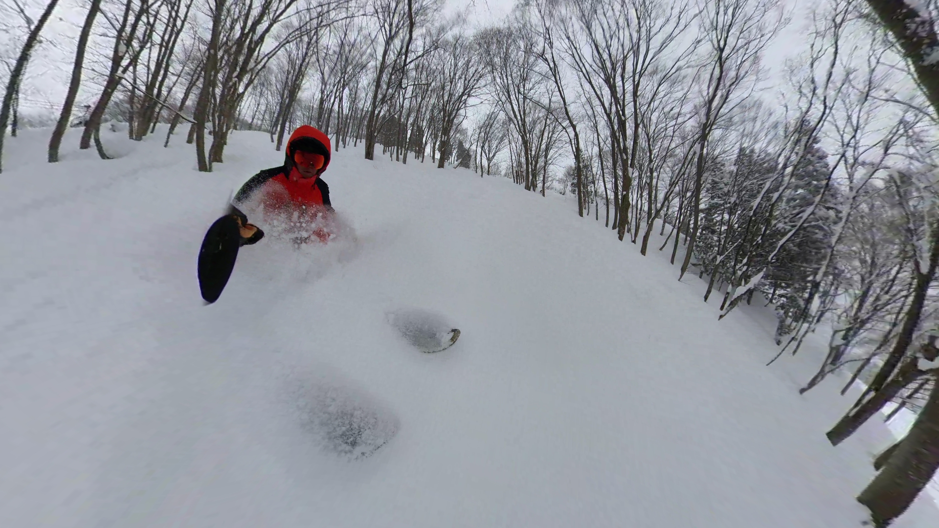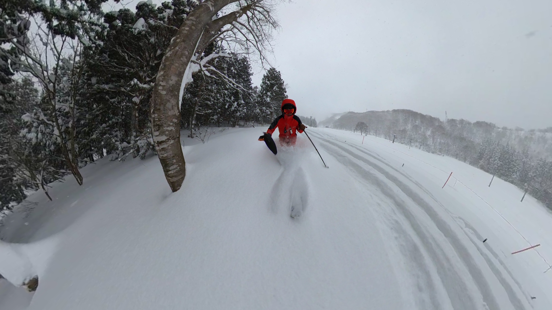 かぐら5ロマ付近に比べると、回すのに力がいる雪の重さではありますが、それでも軽い。段々畑の段差が不意打ちするので飛び跳ねちゃいます。