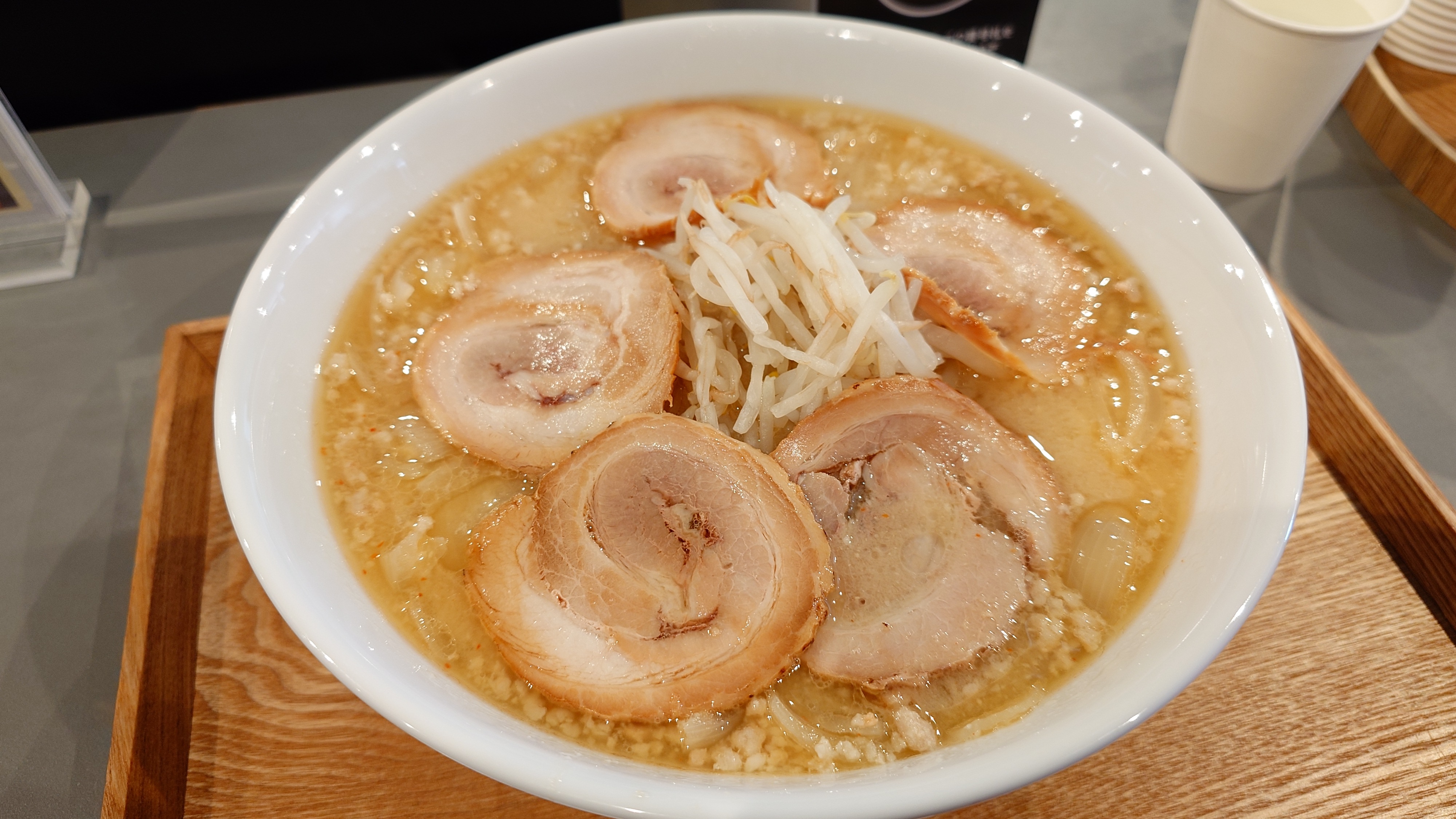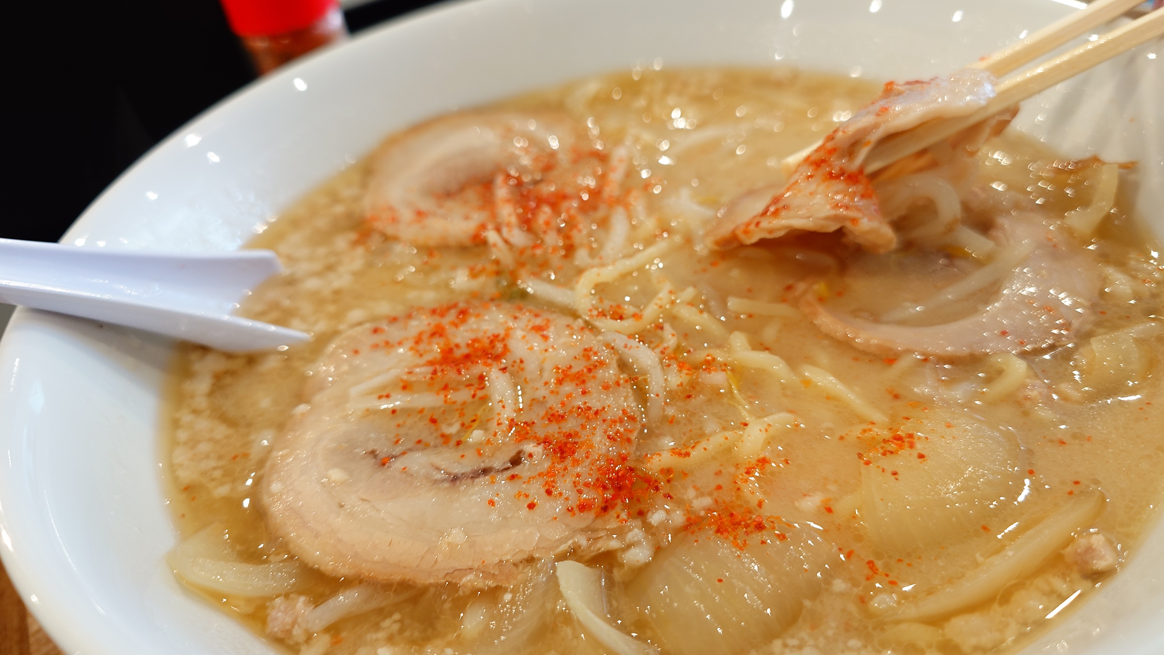 デフォはチャーシュー無しのミンチなので、ちょっと張り込んで、みそチャーシューめん。あまり待たずに着丼。うわっ、あの、ニンニク豚汁らーめん。ちょっと薄目な気がしますが、甘めの白味噌に大量の玉ねぎはミサです。一味は言うと出てきます。