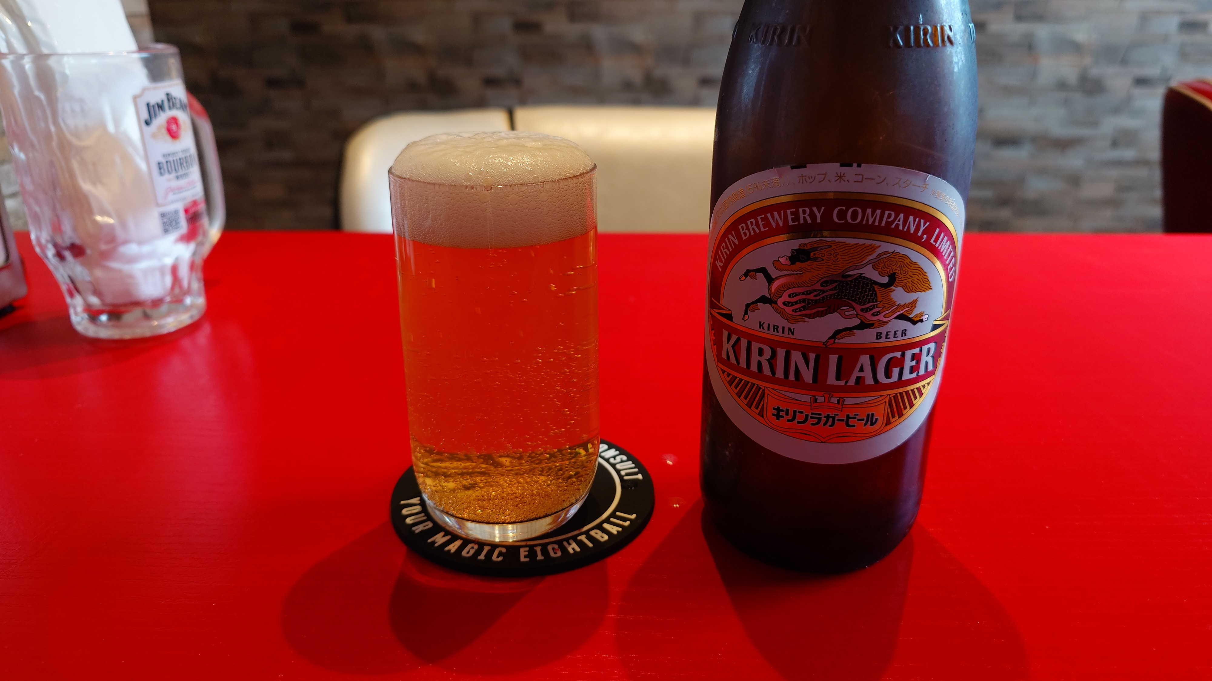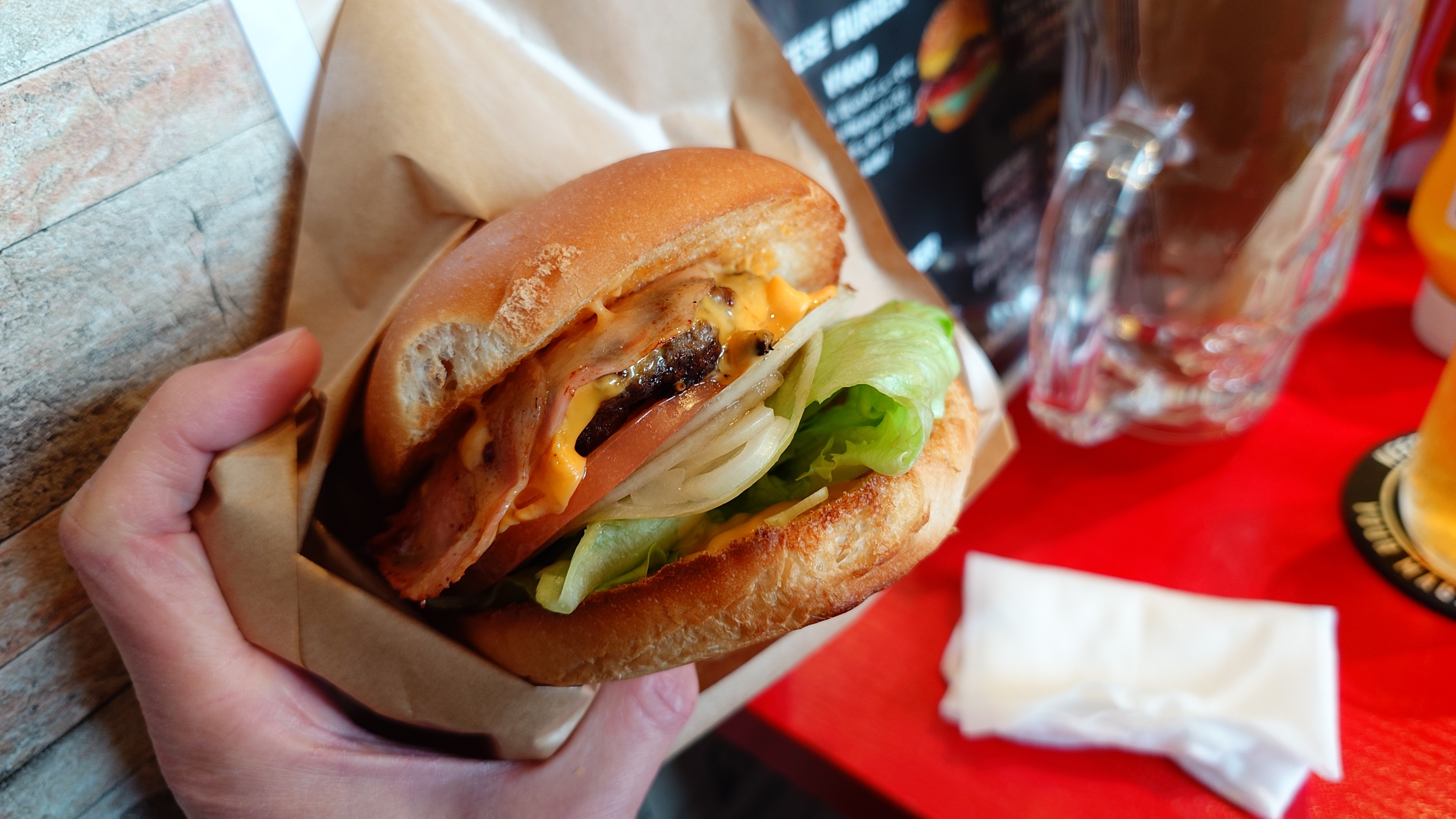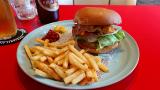 さて、選びましてベーコンチーズバーガー。ポテトとソフトドリンク付きですが、キリンラガーにしてしまいました。