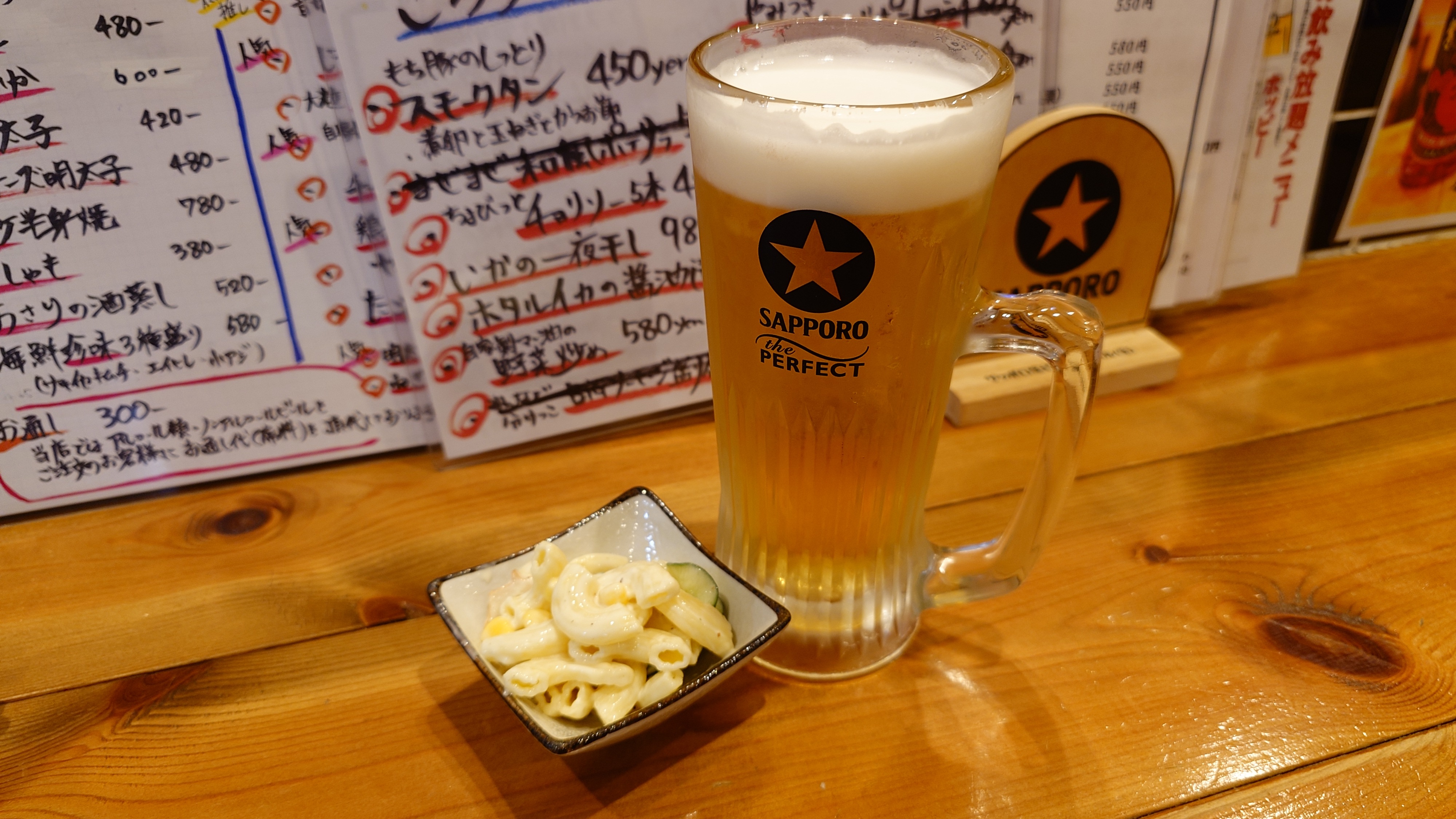 サッポロ生と、この辺りではまず見掛けない紫蘇ダルマサワー。広島の紫蘇焼酎から作ったリキュールで、紫蘇ジュースの様な爽やかさがあります。