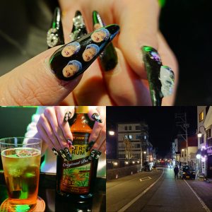 りなこが爪先を見せて来ました。うわっ、ショーヘーグラスのショーヘーがうぢゃうじゃ。さらには酒ボトルも。うわー。こりゃたいへんです。