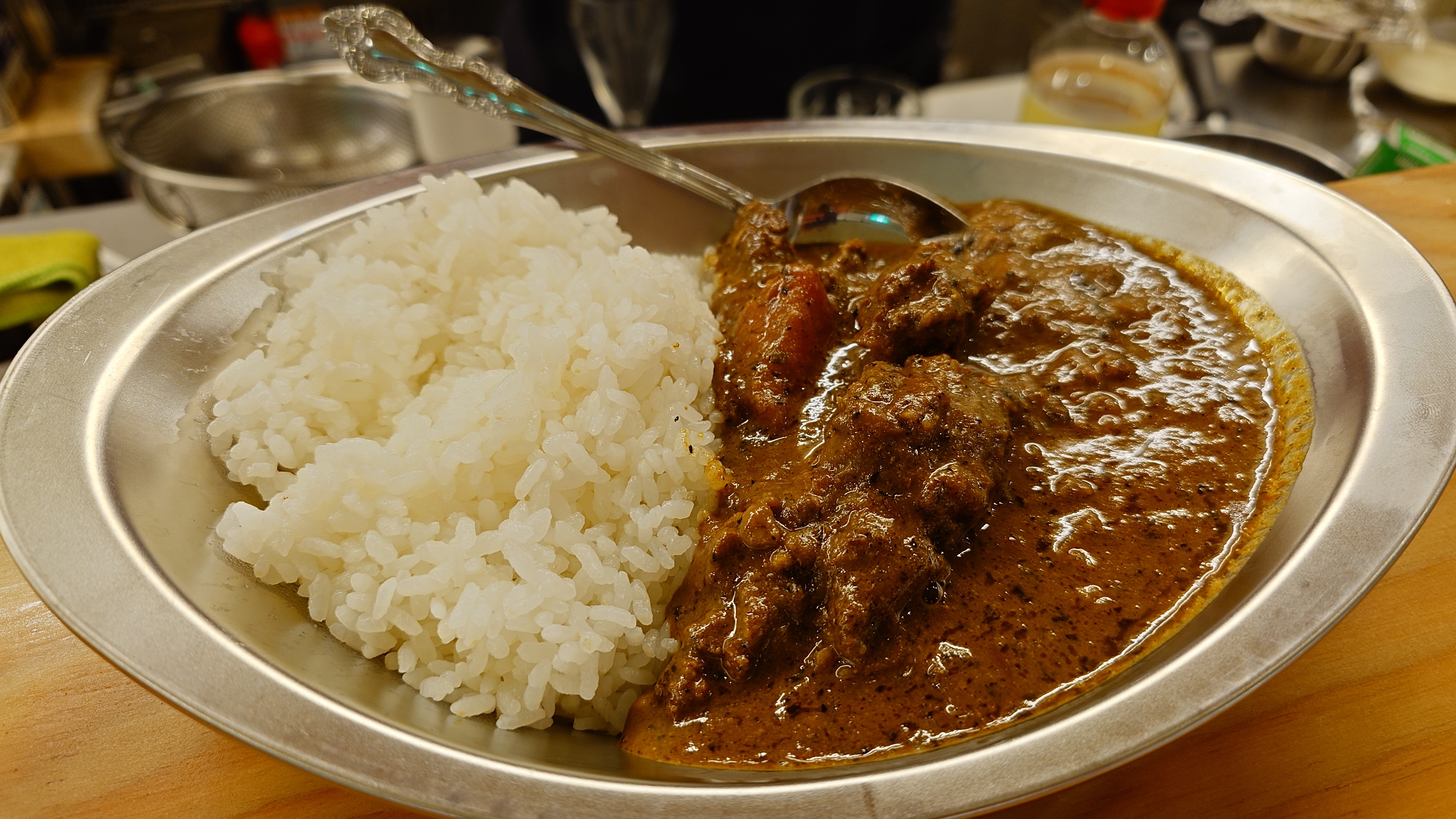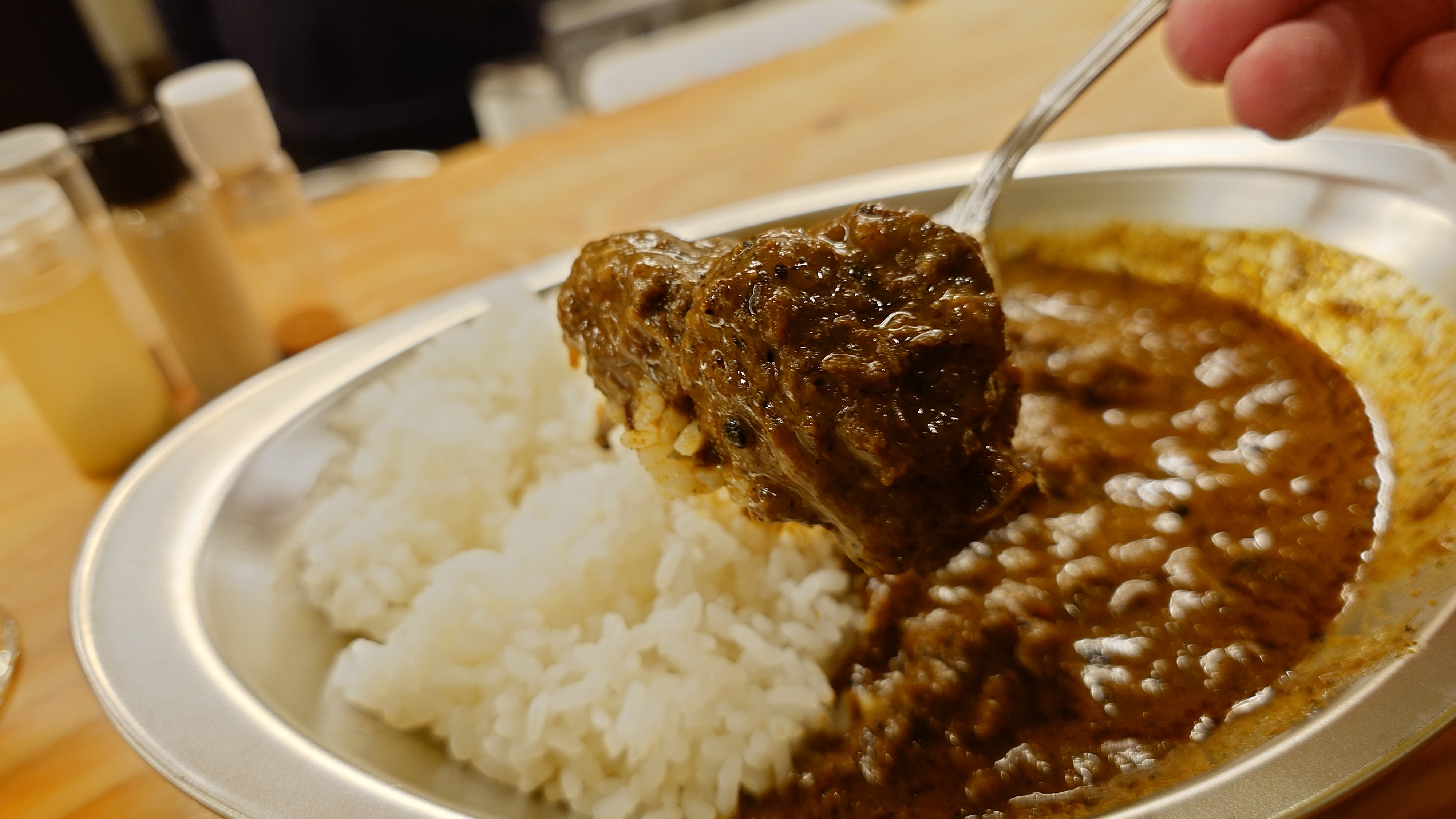 柔らかく煮込まれてホロホロ。カレーのスパイスもジワジワやってきます。そこに、熊脂をカンカンに熱してかけるとジュワー。コクが増しますが、でもアッサリ。