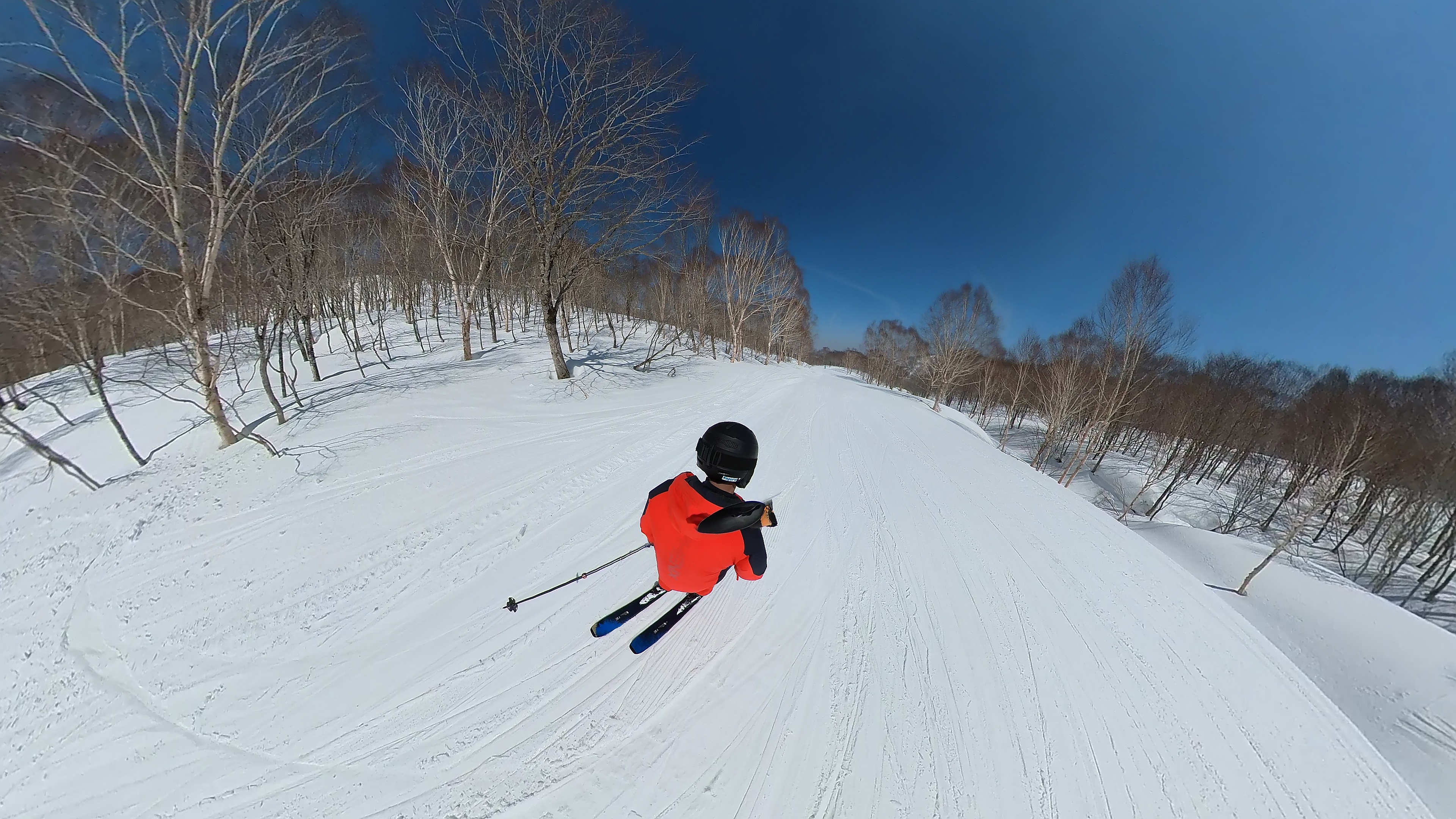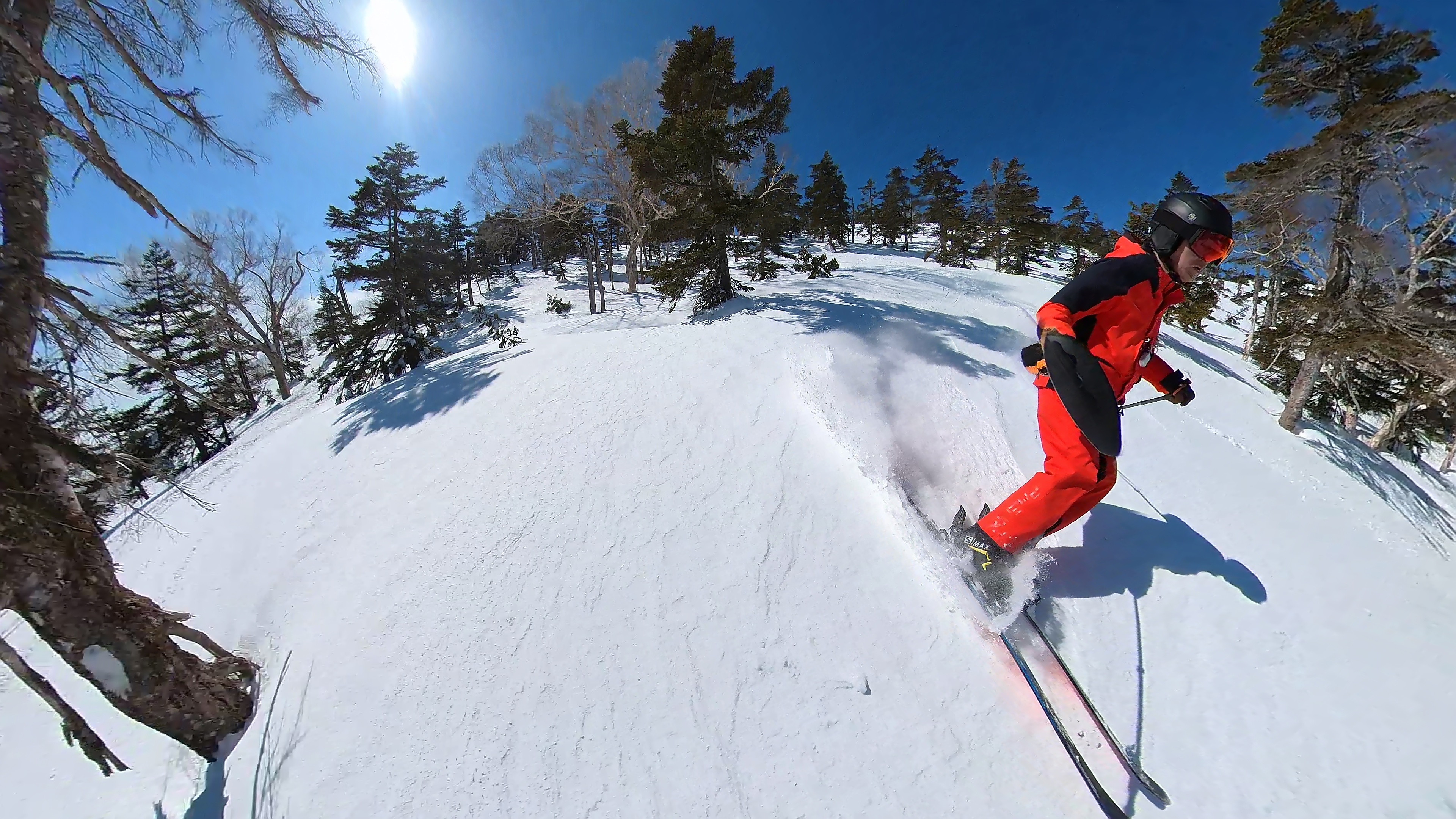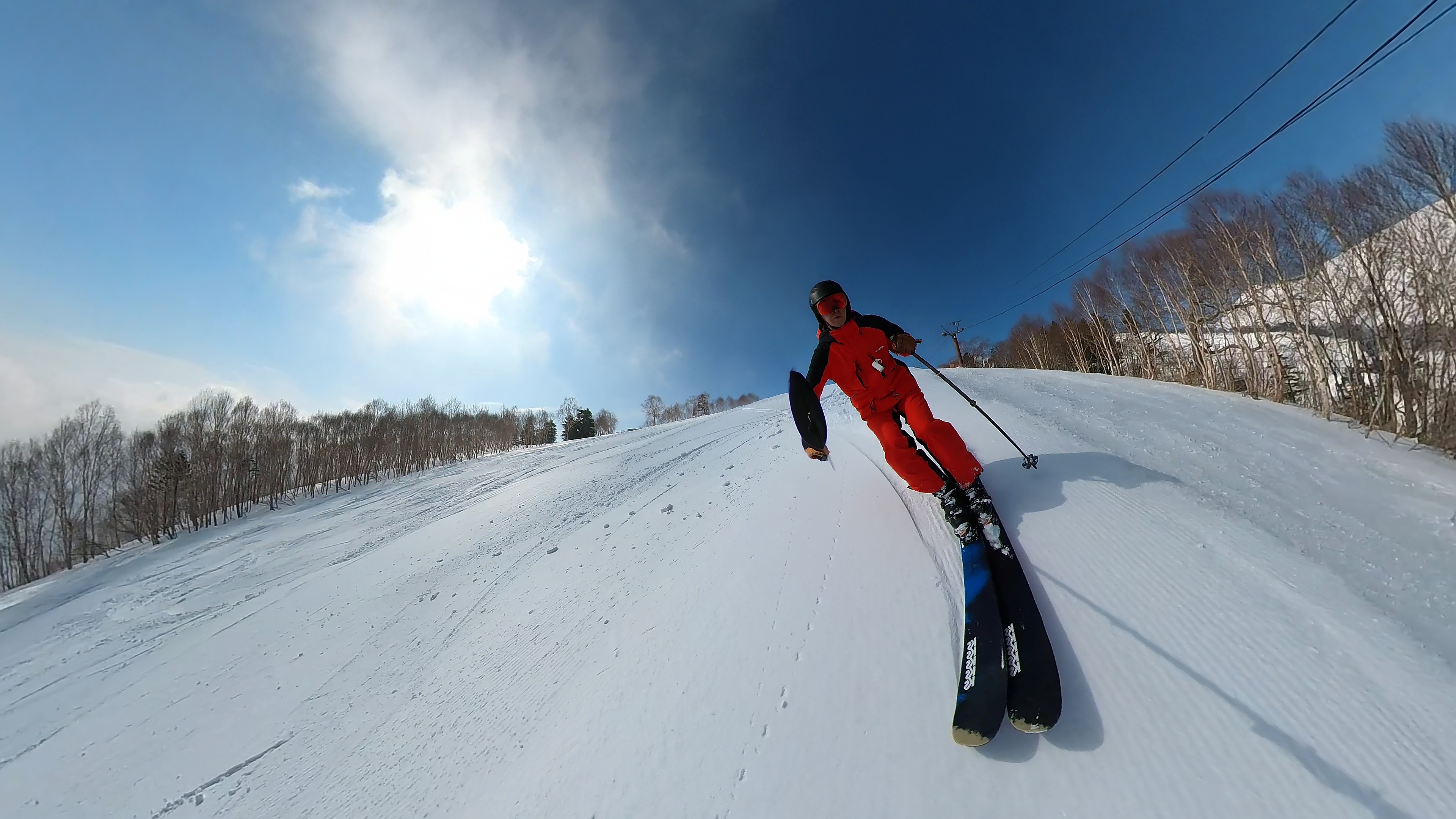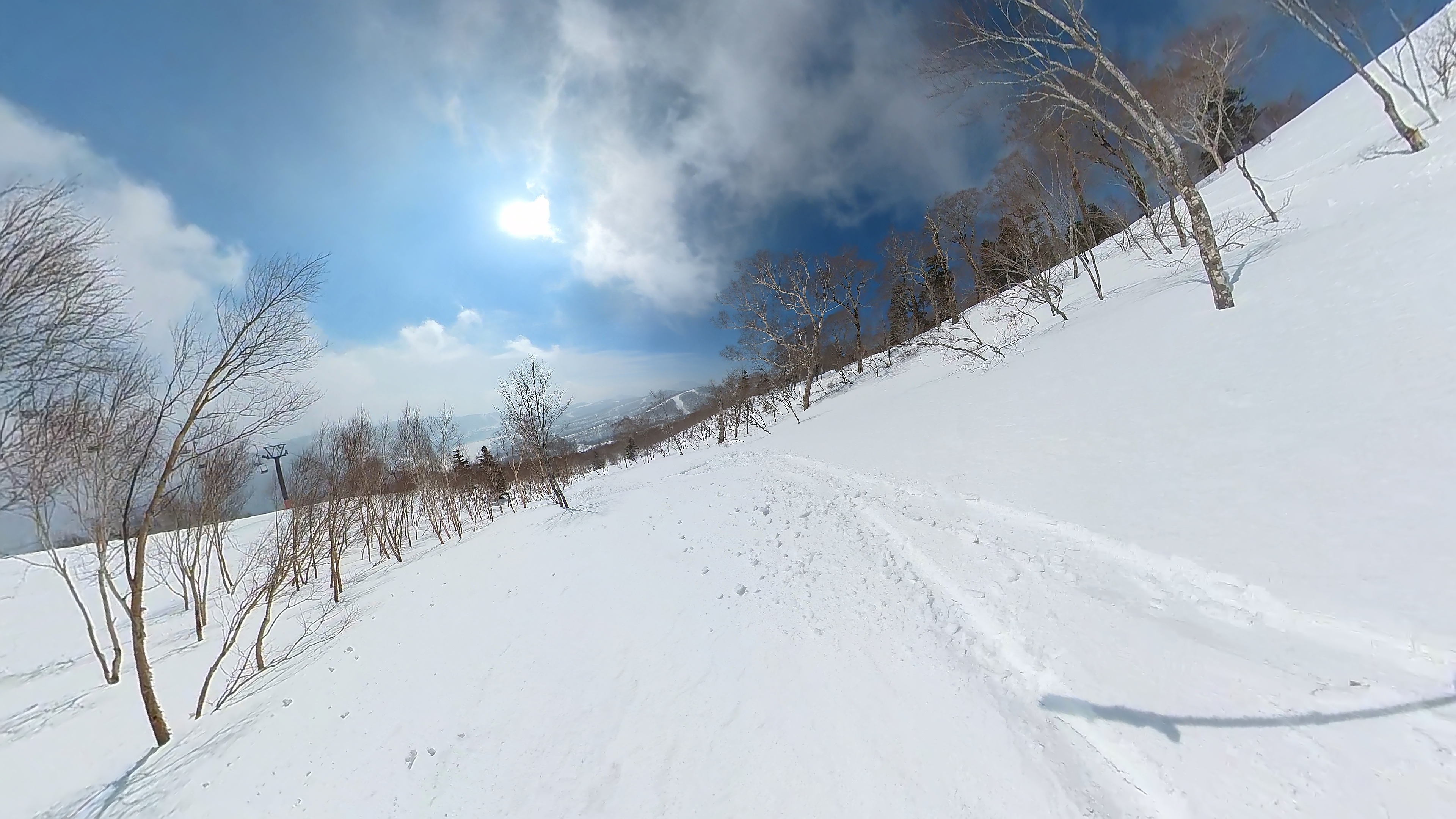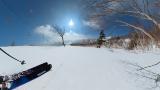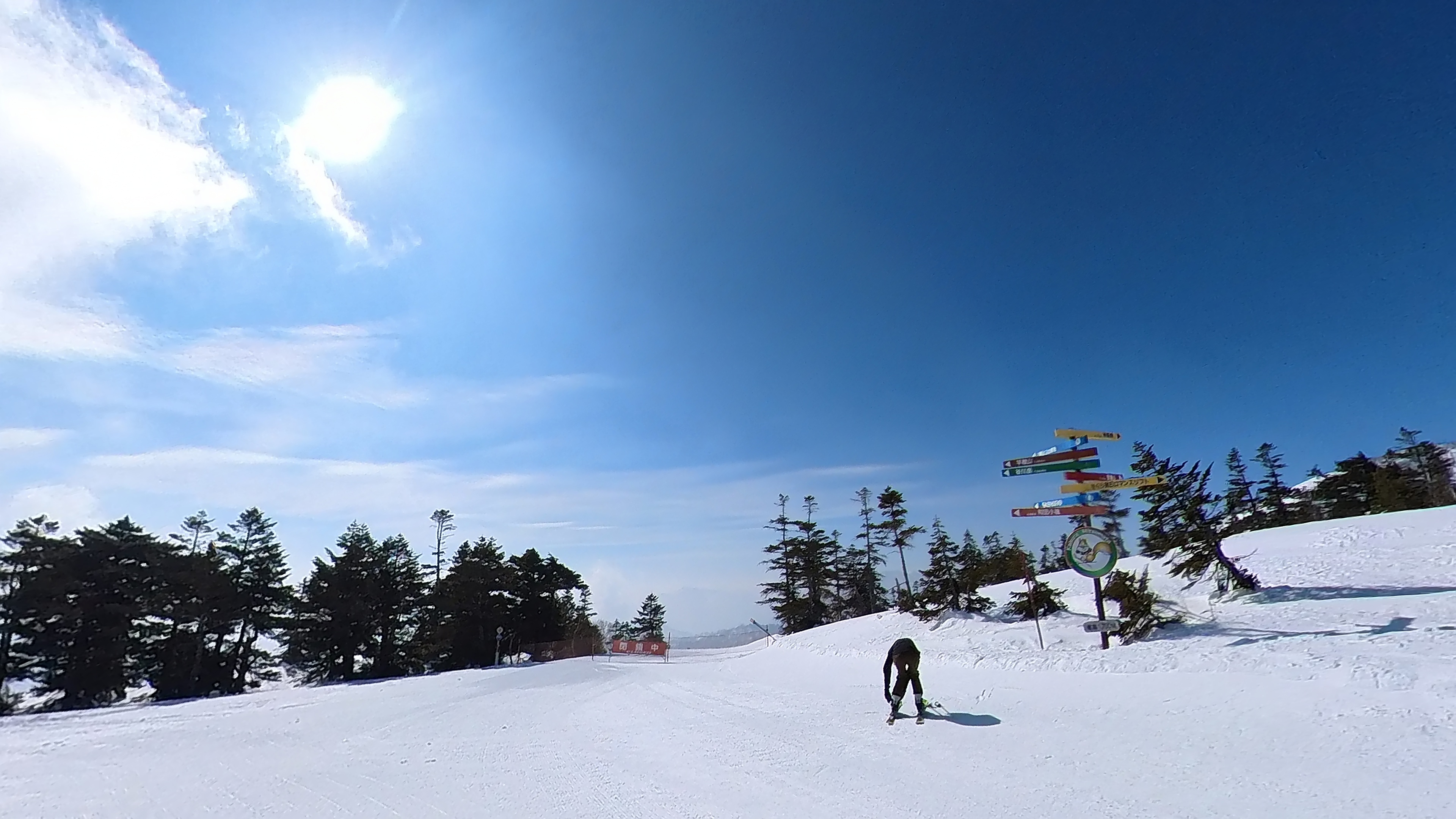 林の中はまだ昨日の降雪は残ってます。人も少ないし。ただ、だんだん気温が上がると回せなくなるかと。2本目でプラス1℃。