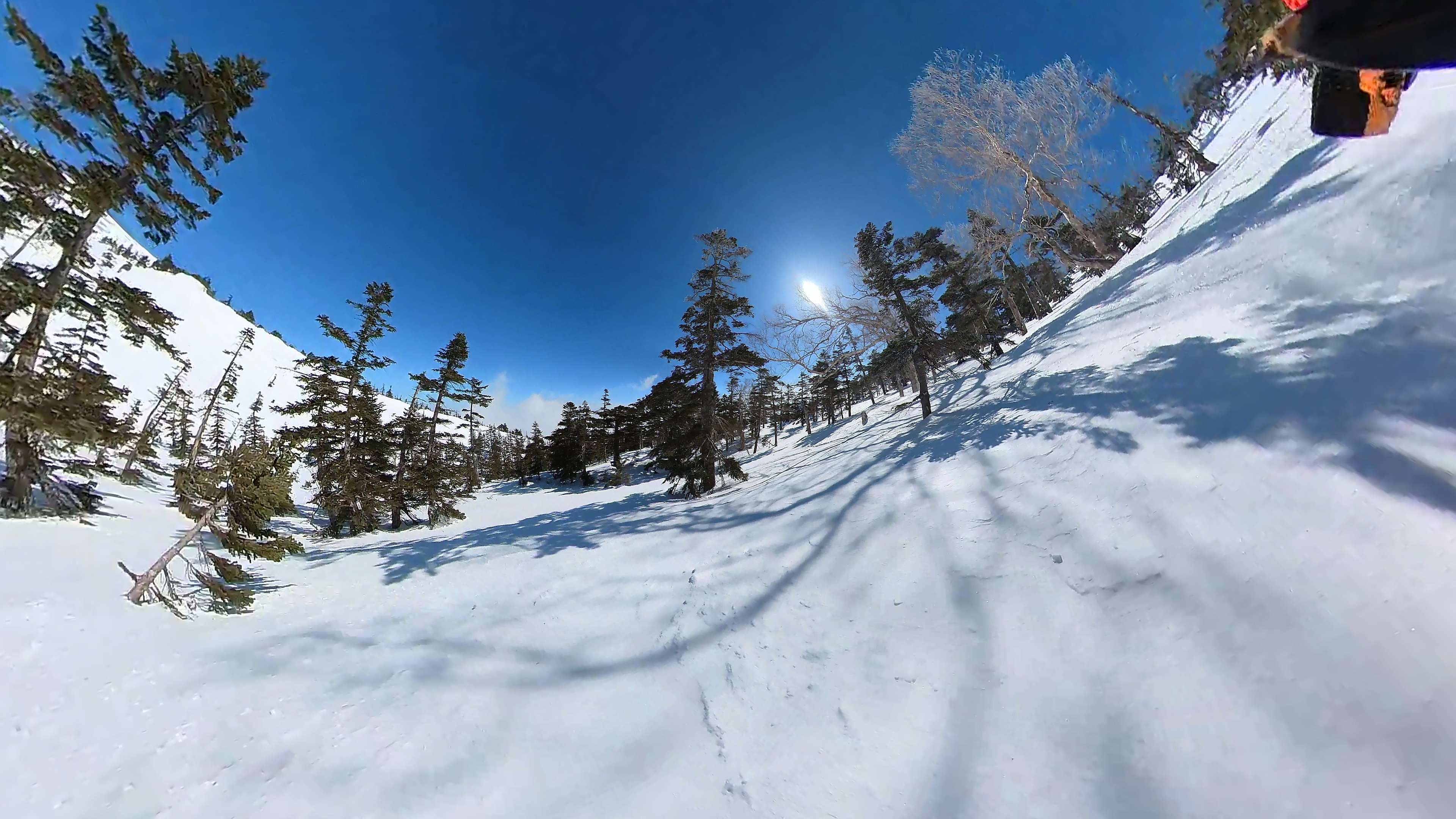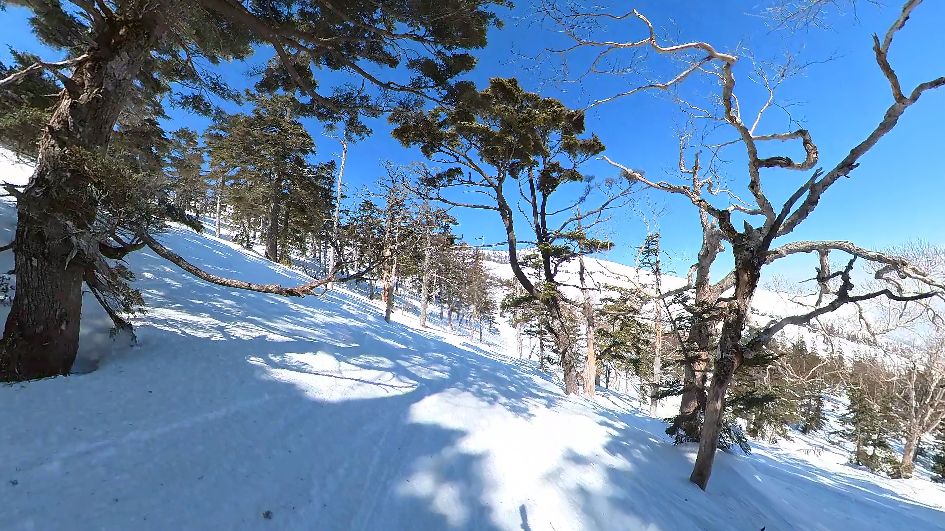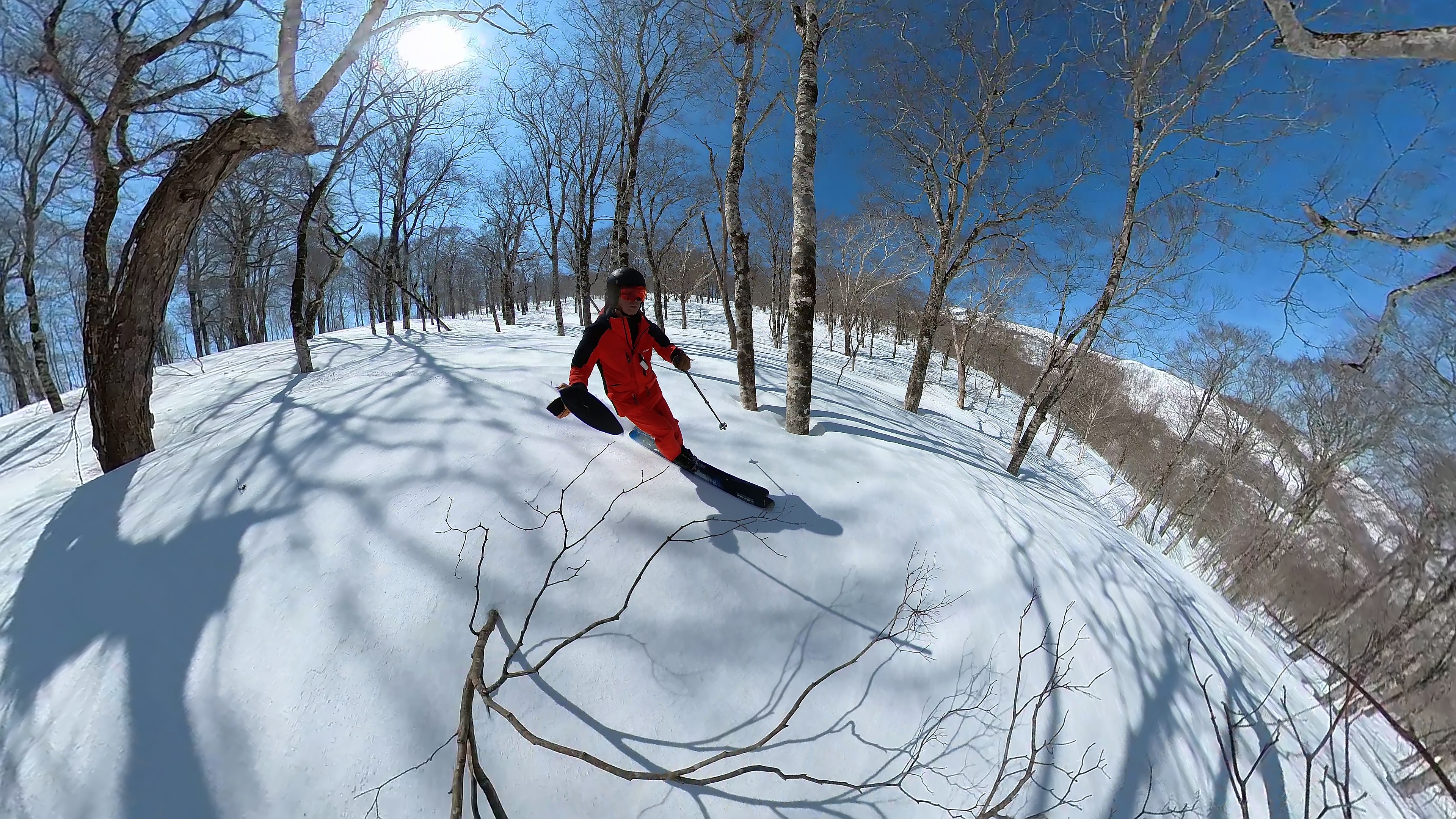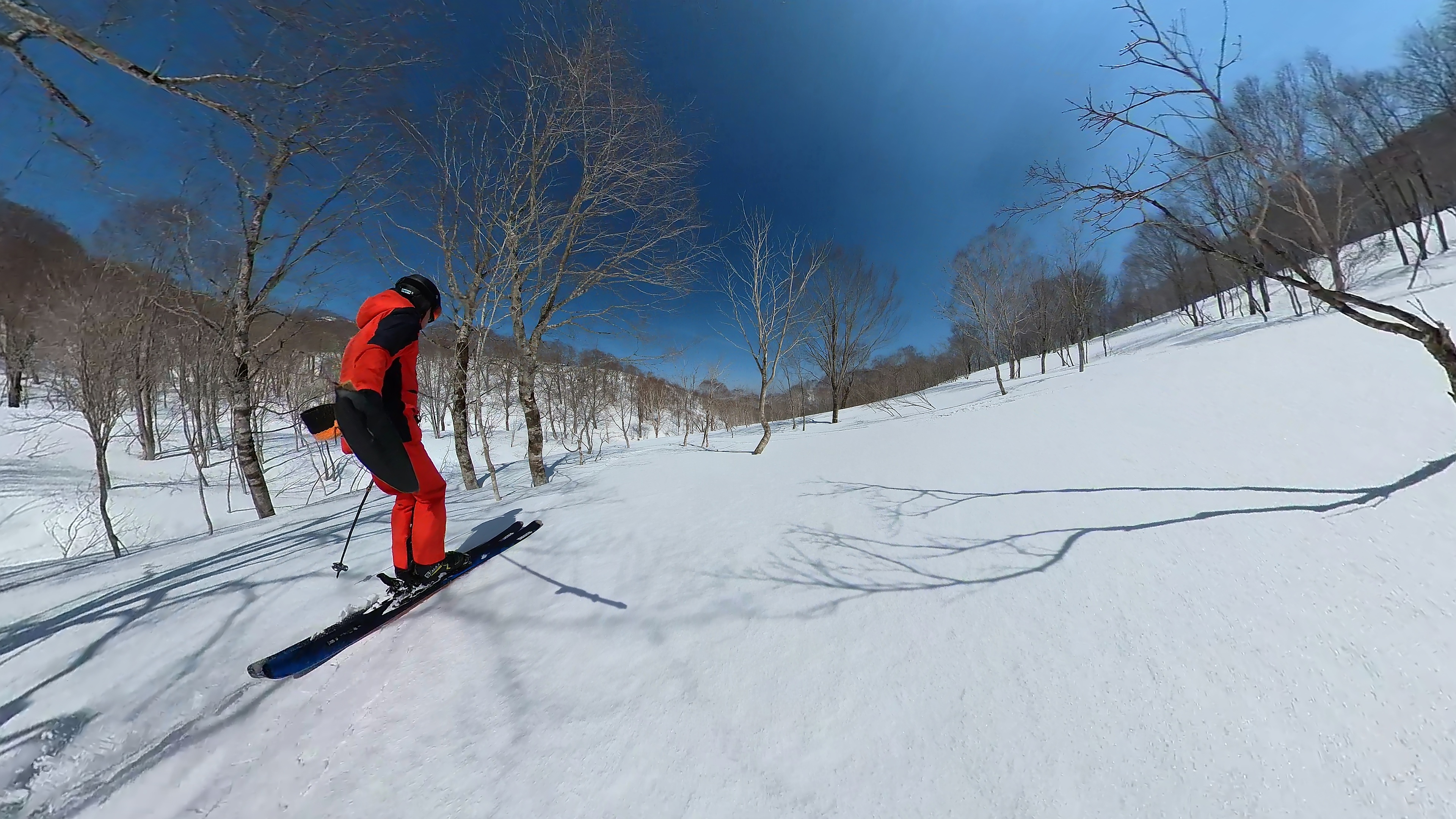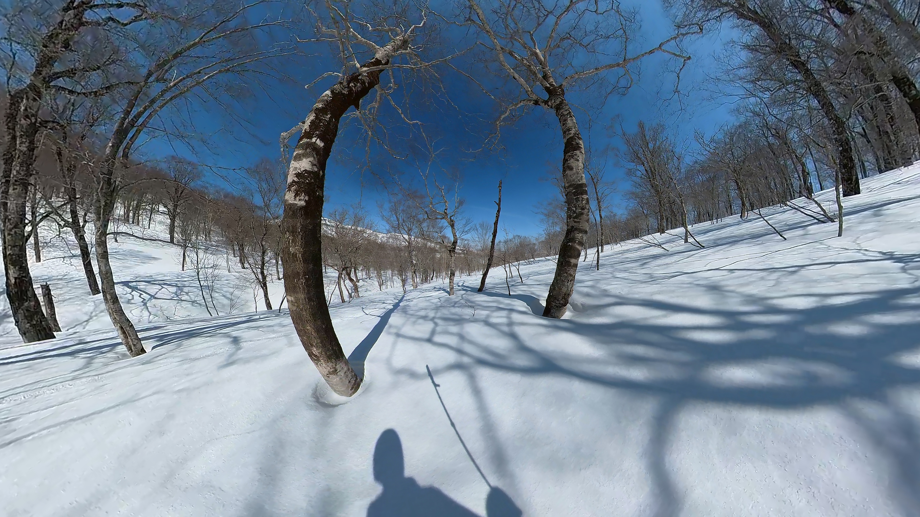 林の中はまだ昨日の降雪は残ってます。人も少ないし。ただ、だんだん気温が上がると回せなくなるかと。2本目でプラス1℃。