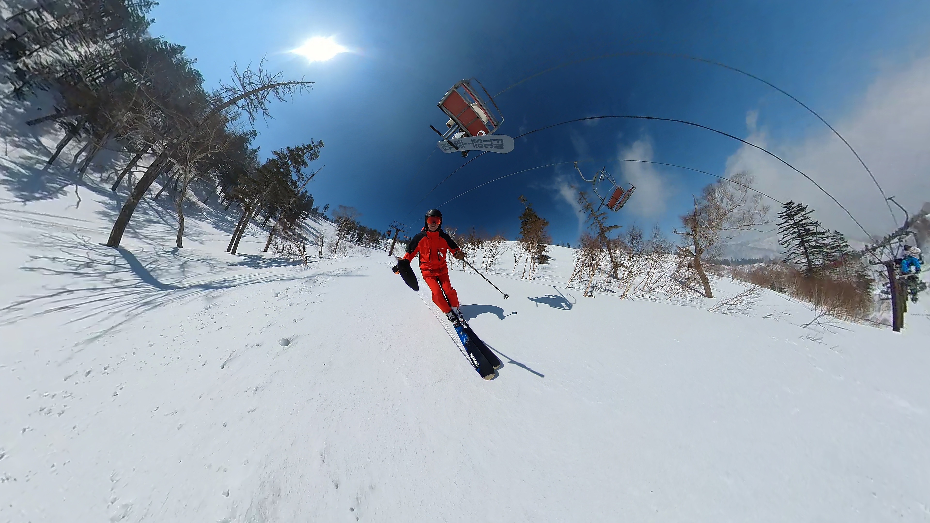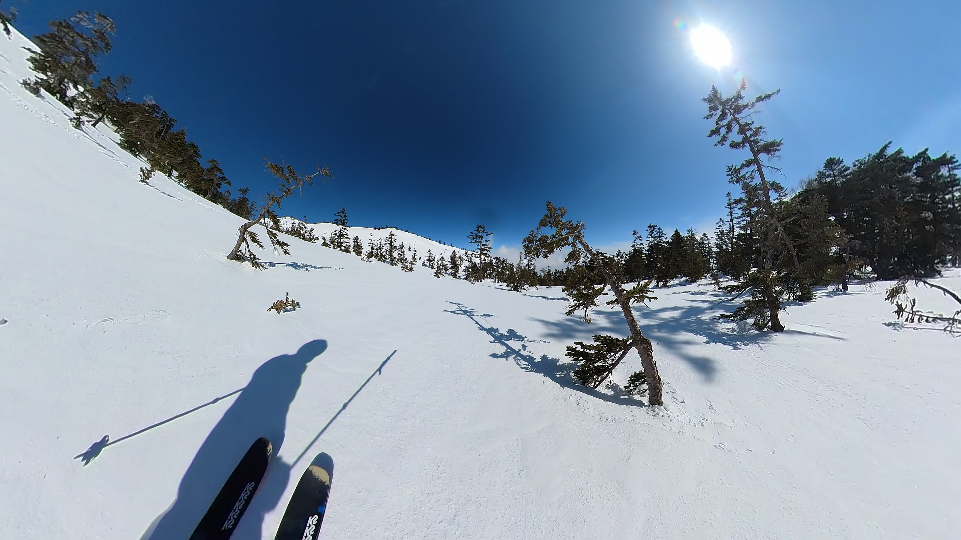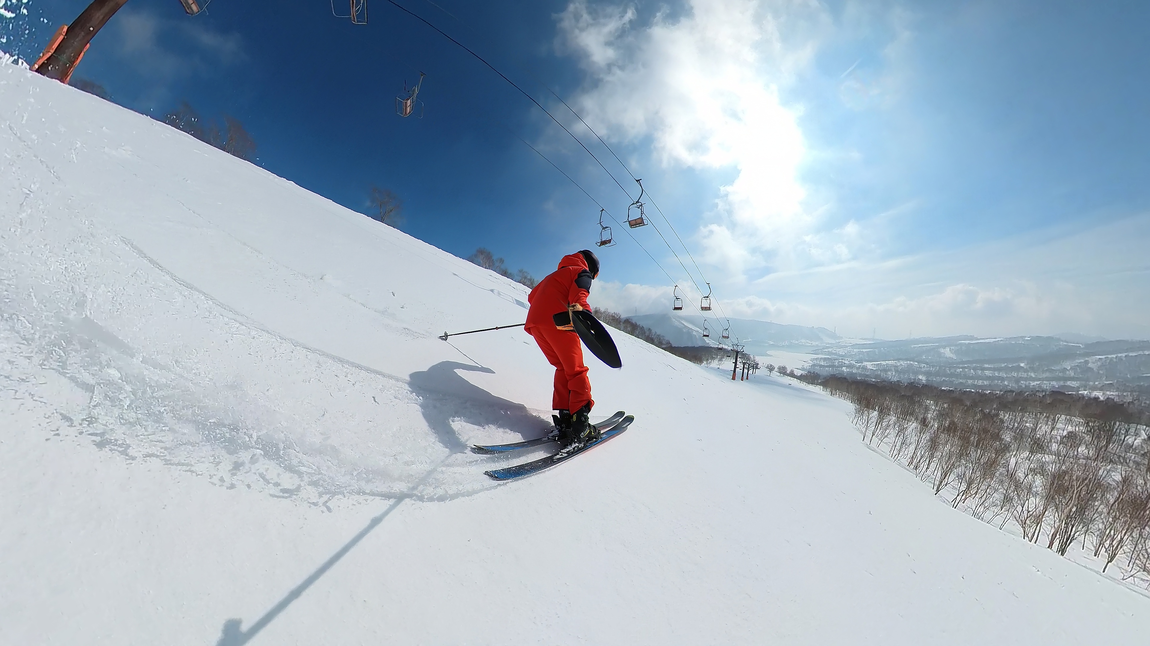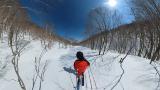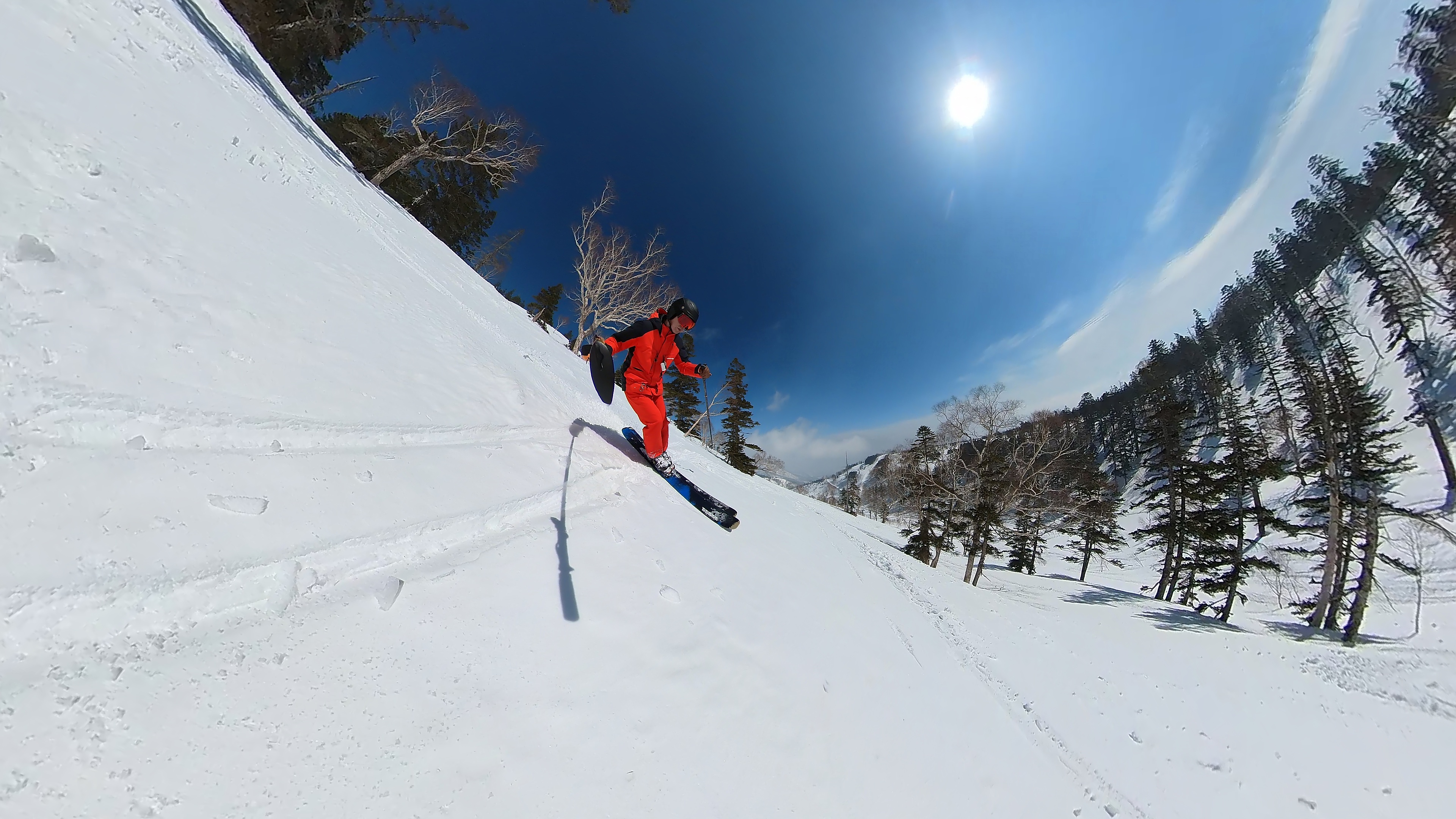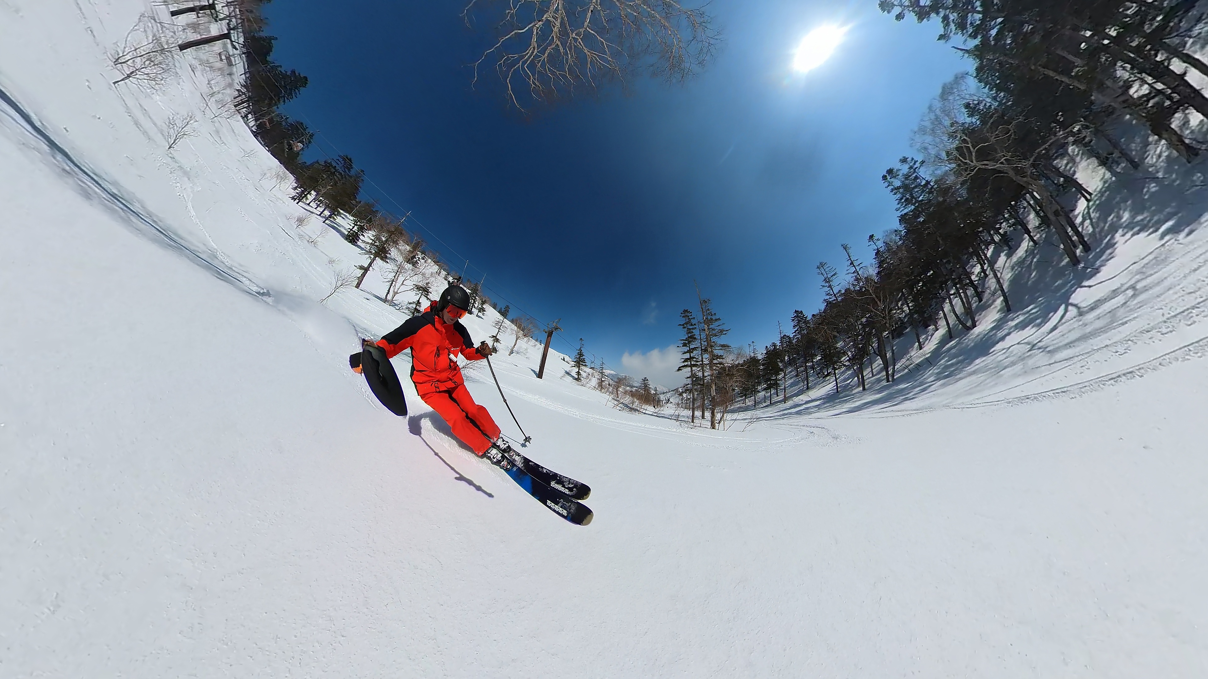 林の中はまだ昨日の降雪は残ってます。人も少ないし。ただ、だんだん気温が上がると回せなくなるかと。2本目でプラス1℃。