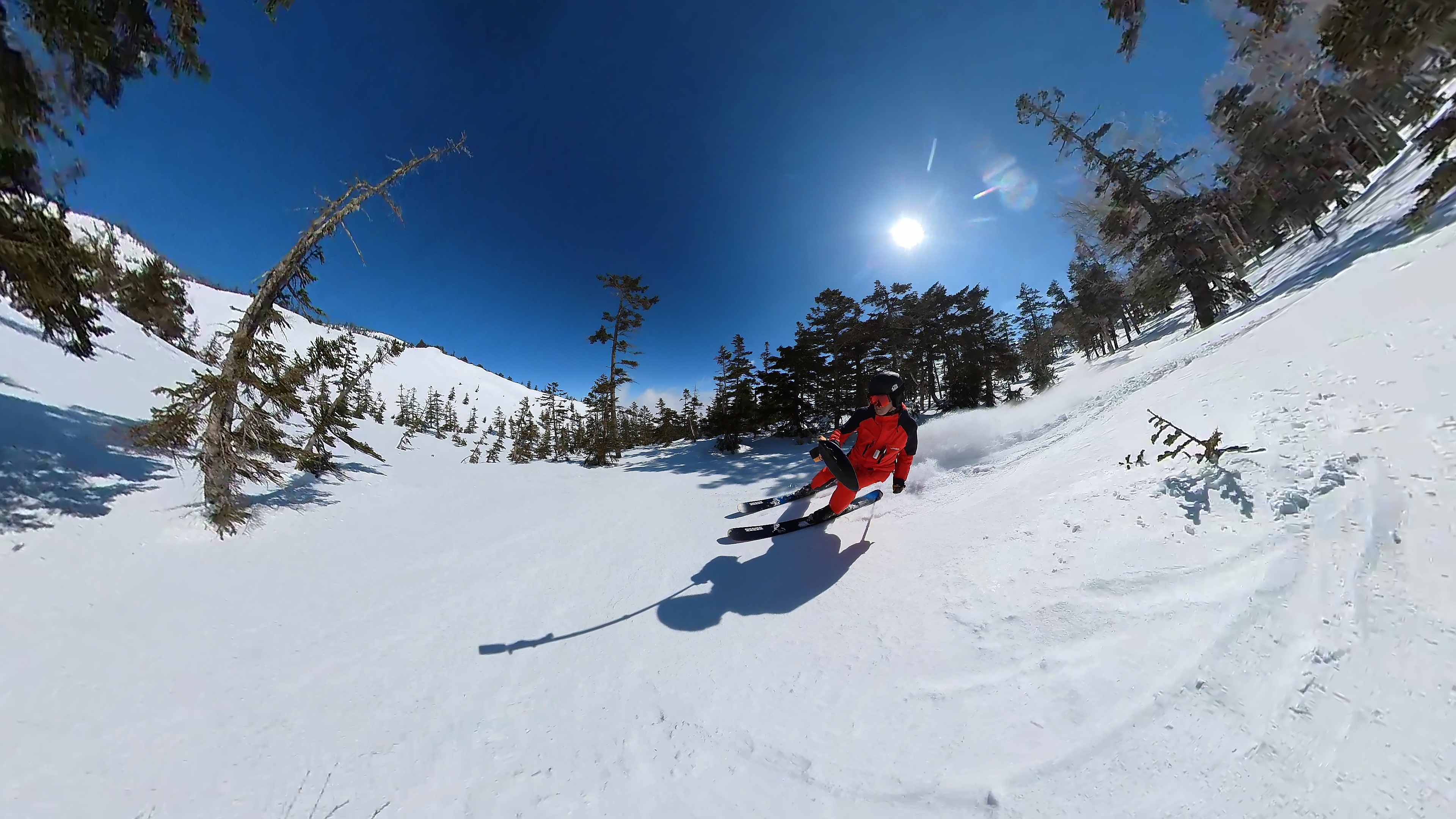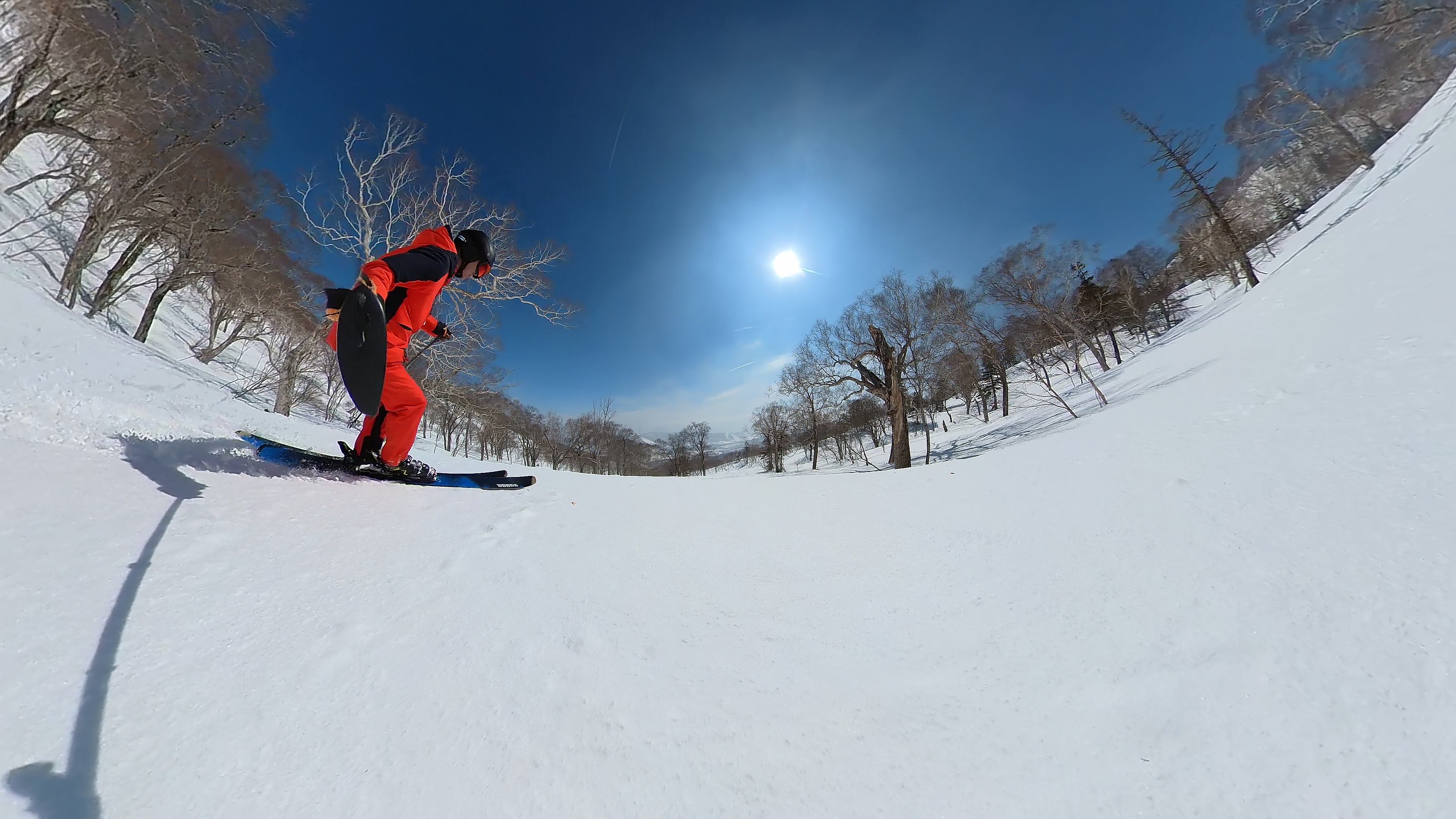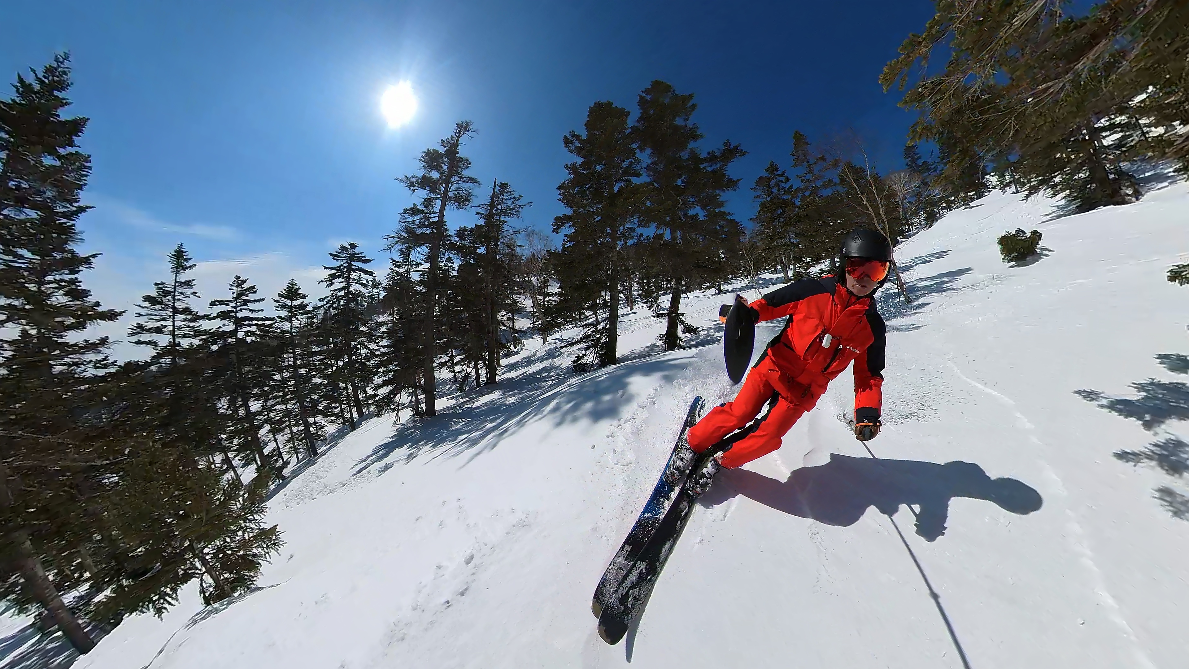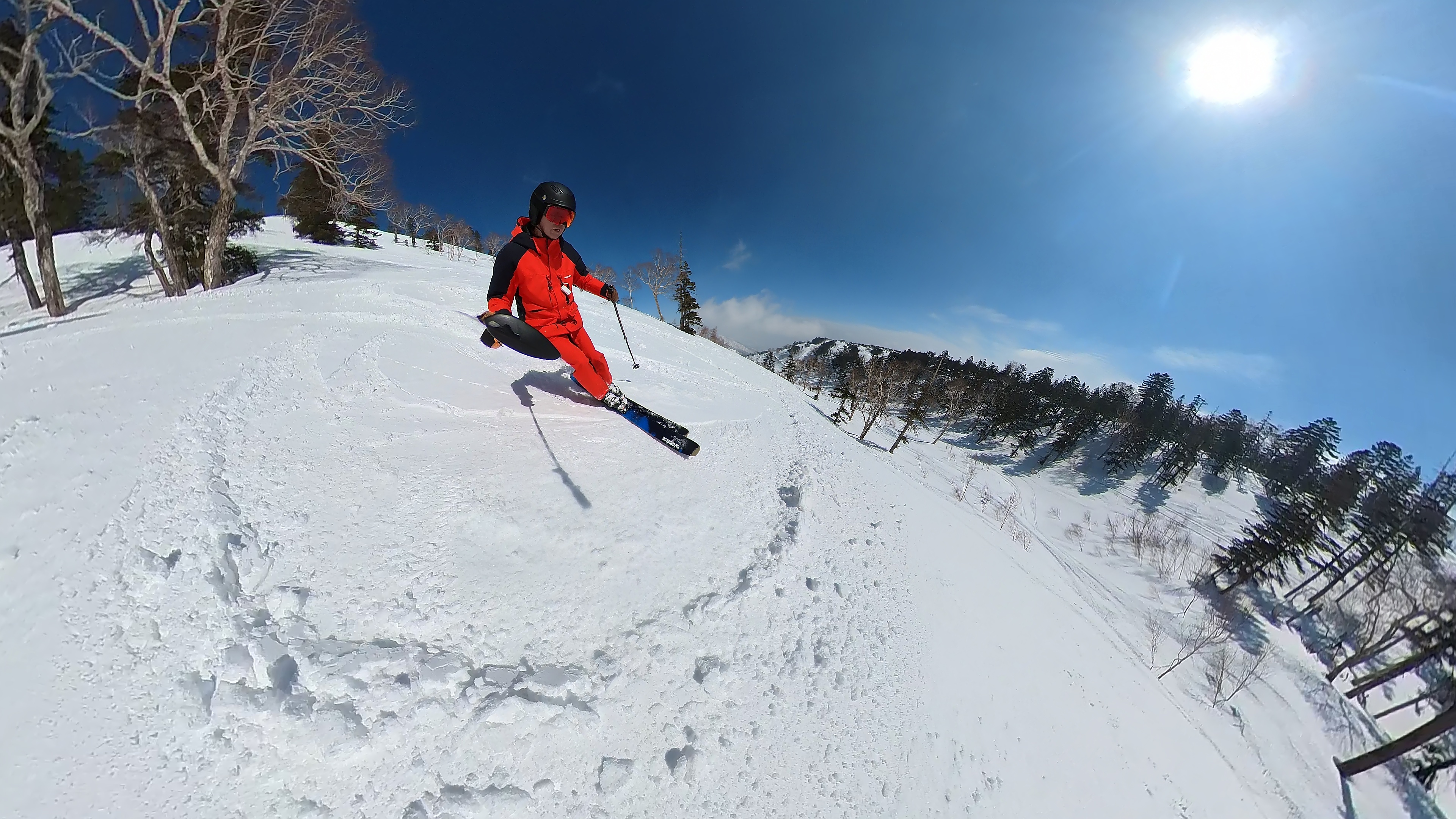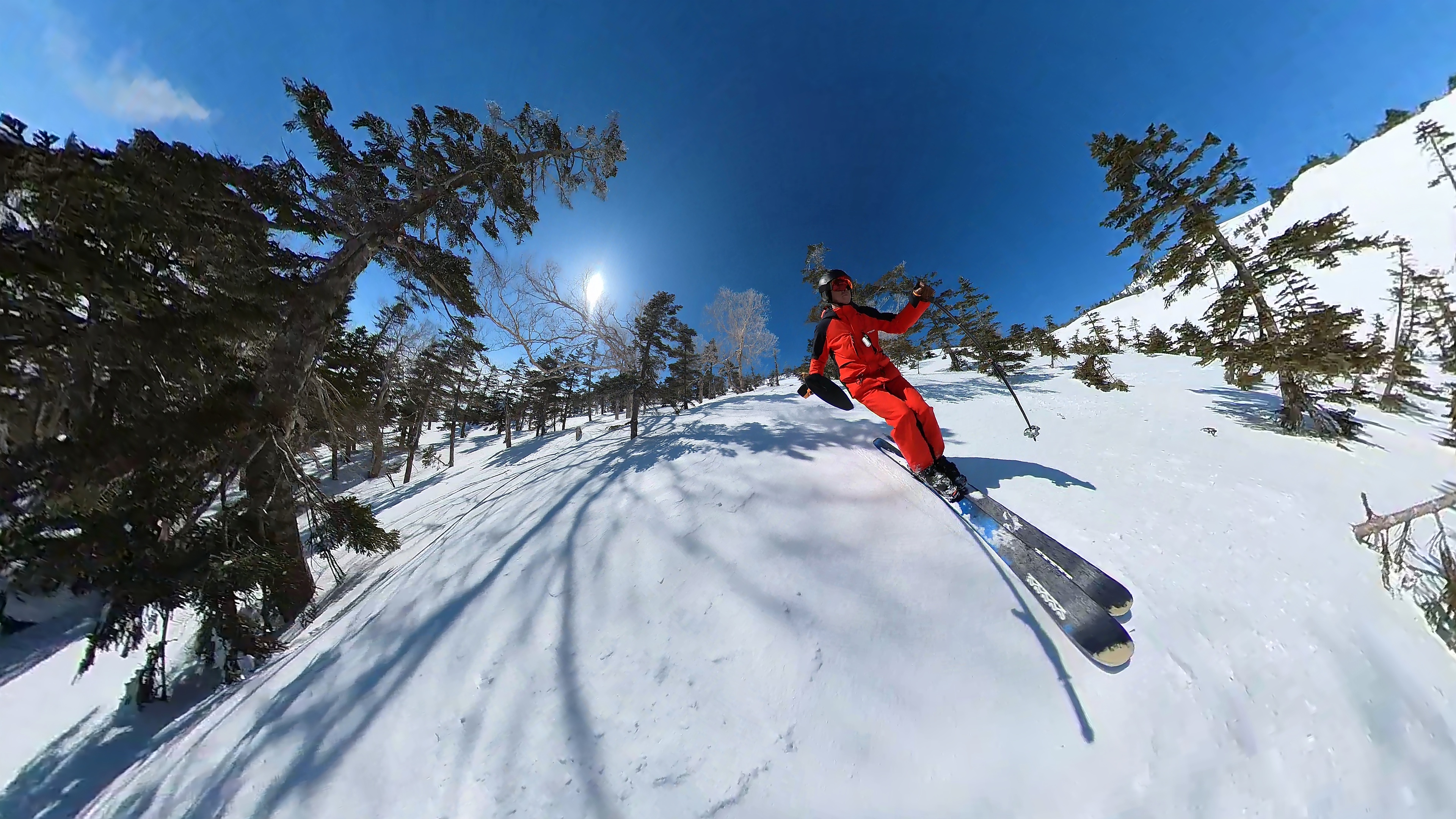 林の中はまだ昨日の降雪は残ってます。人も少ないし。ただ、だんだん気温が上がると回せなくなるかと。2本目でプラス1℃。
