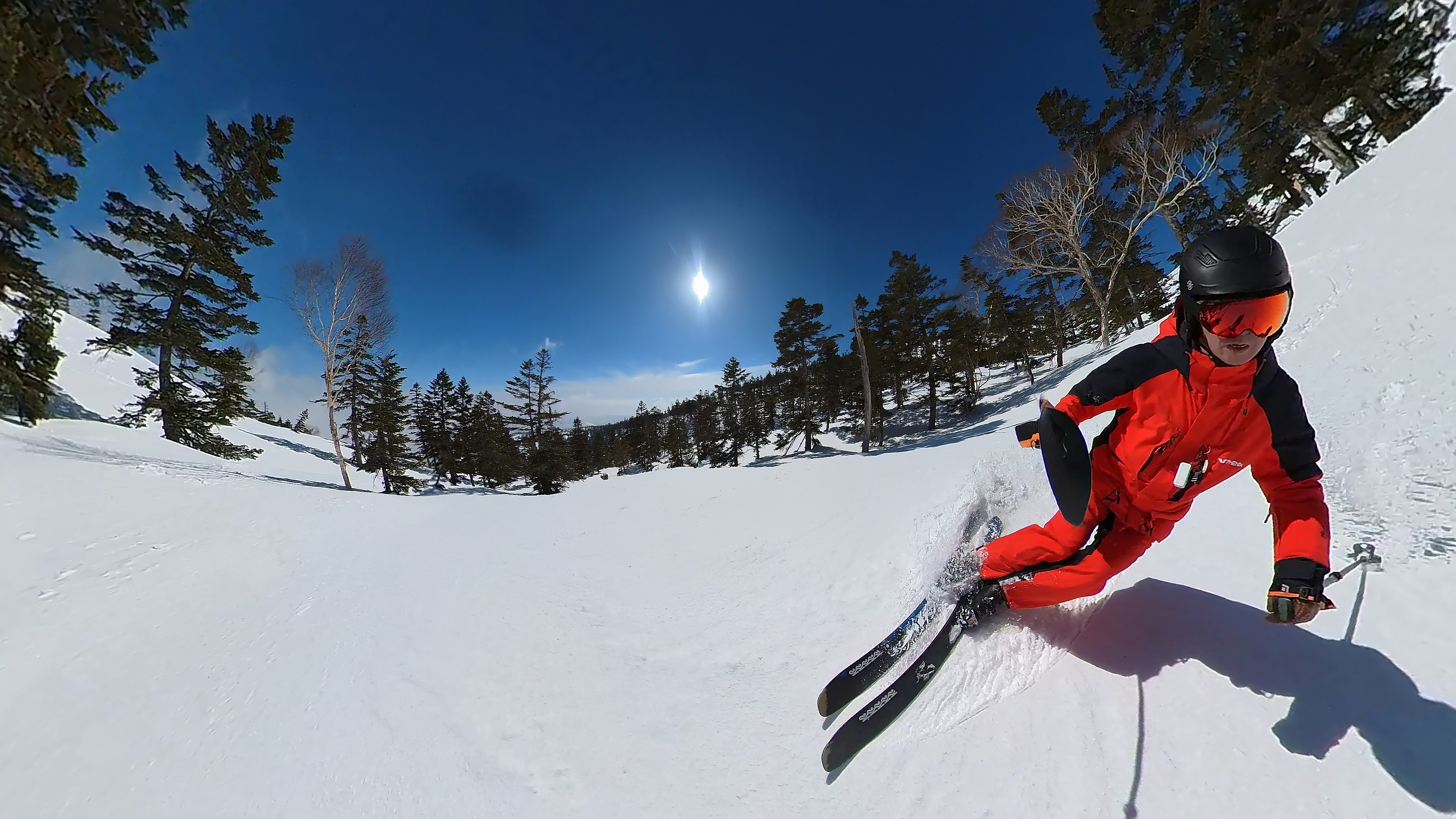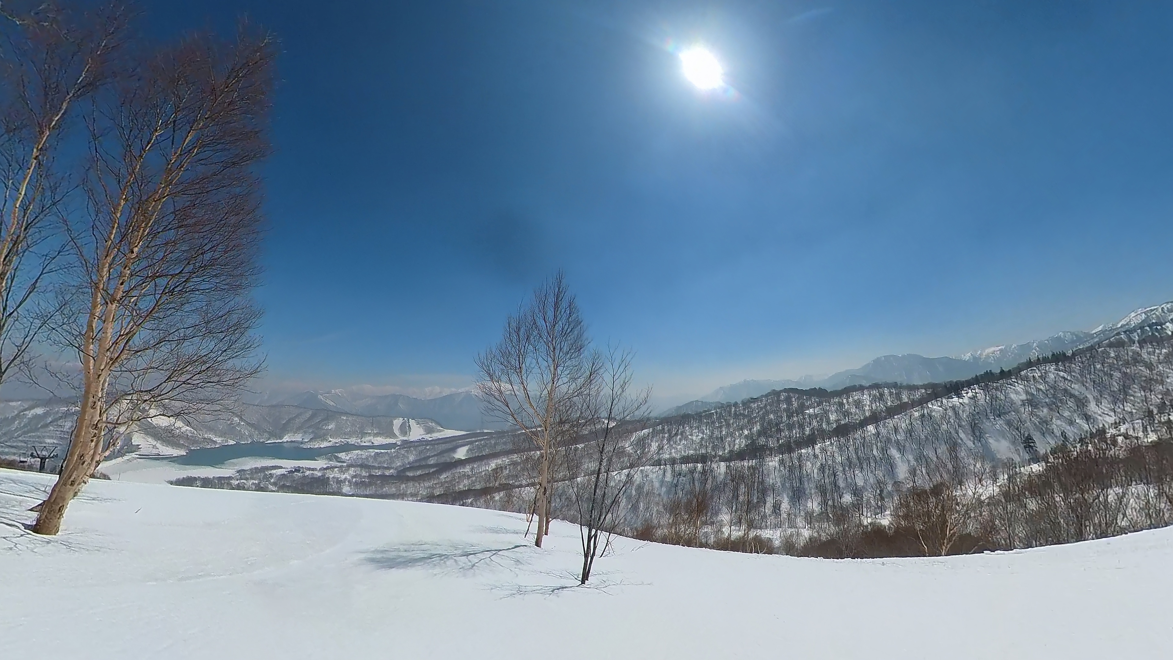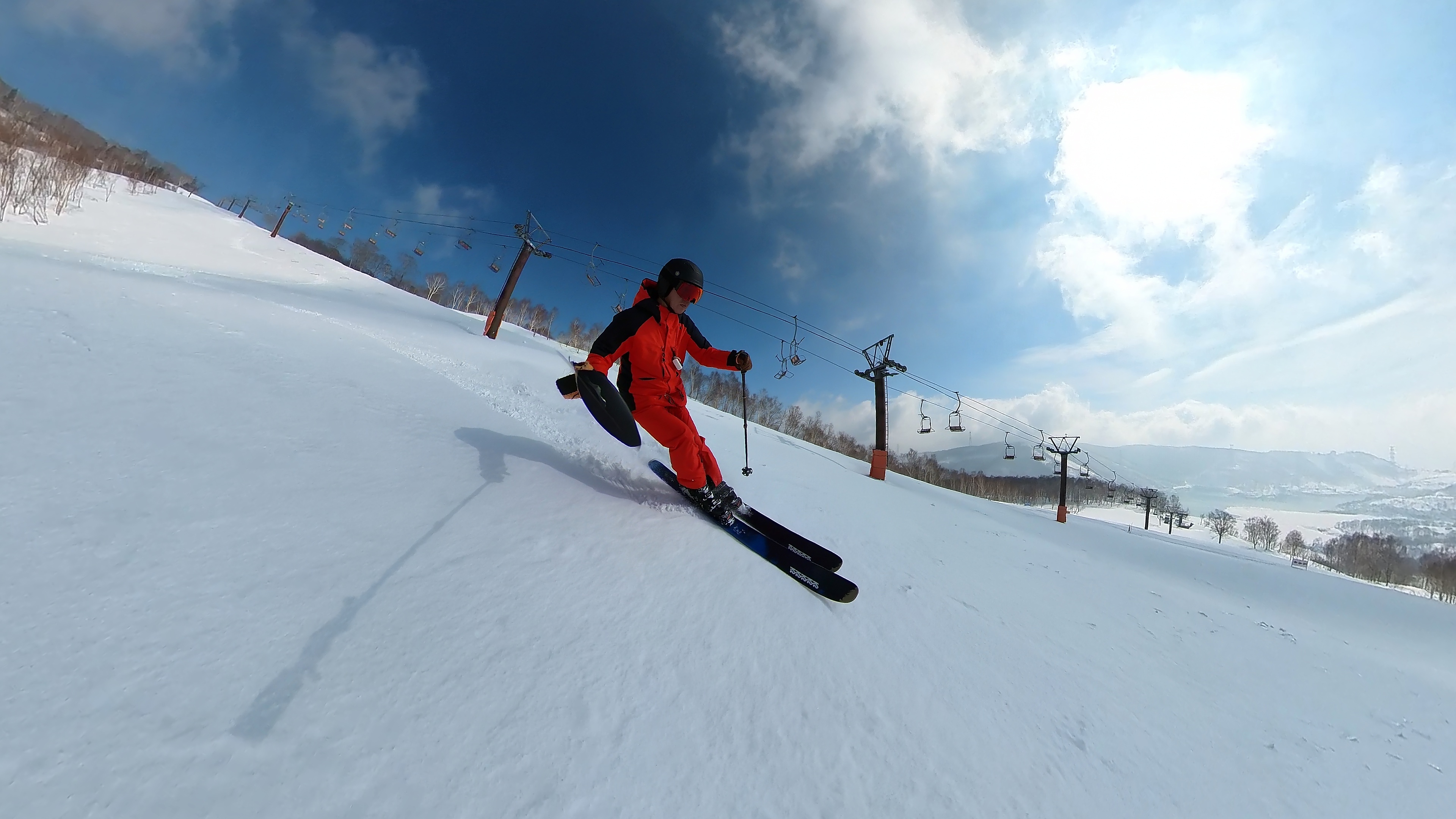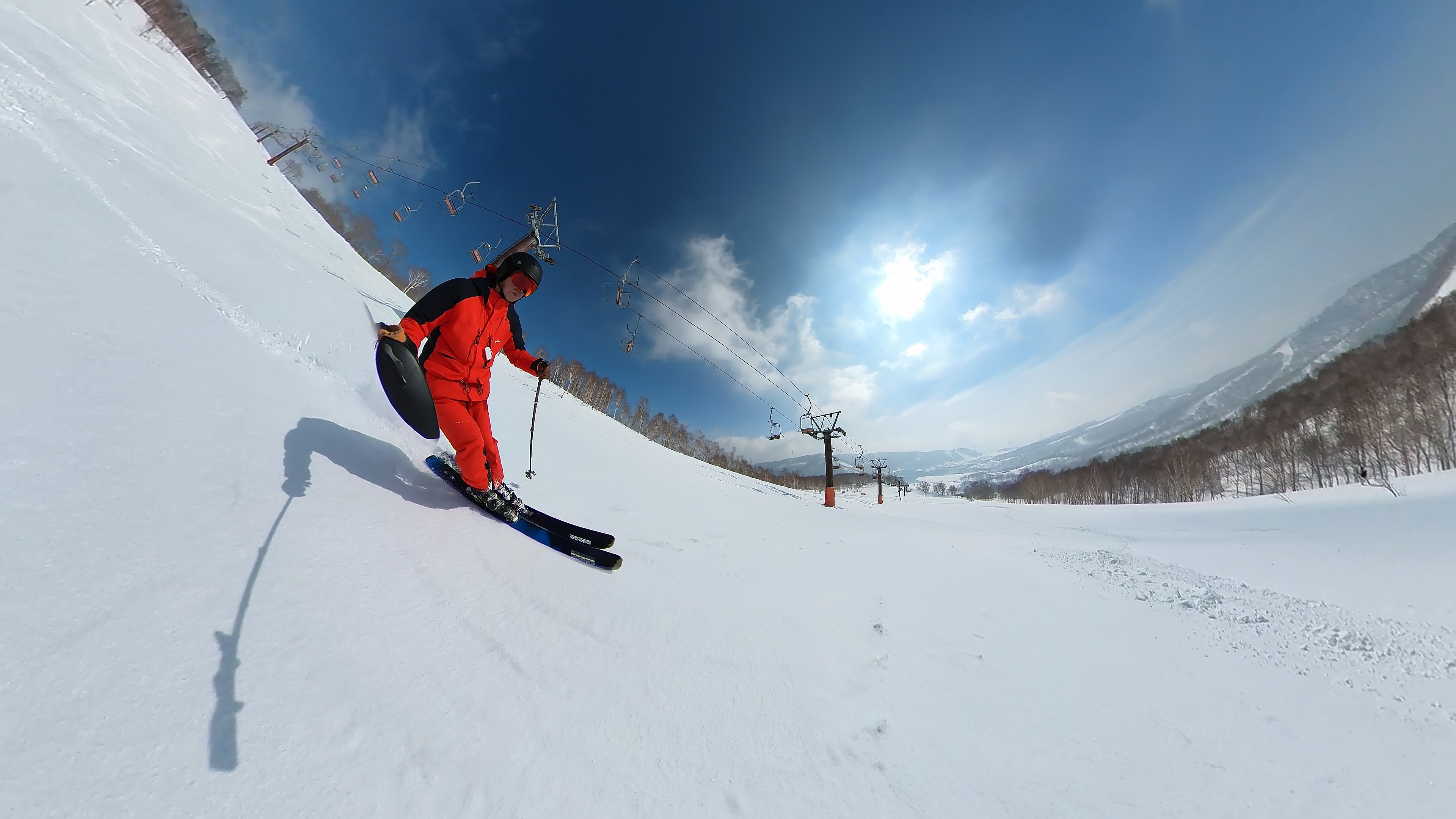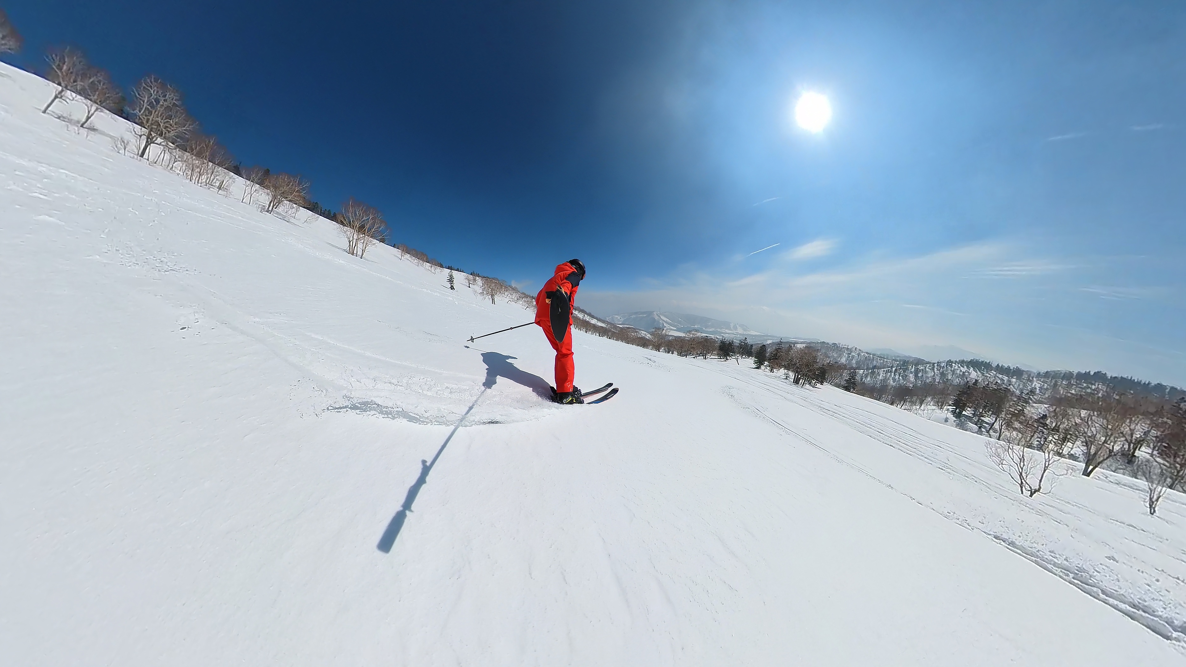 林の中はまだ昨日の降雪は残ってます。人も少ないし。ただ、だんだん気温が上がると回せなくなるかと。2本目でプラス1℃。