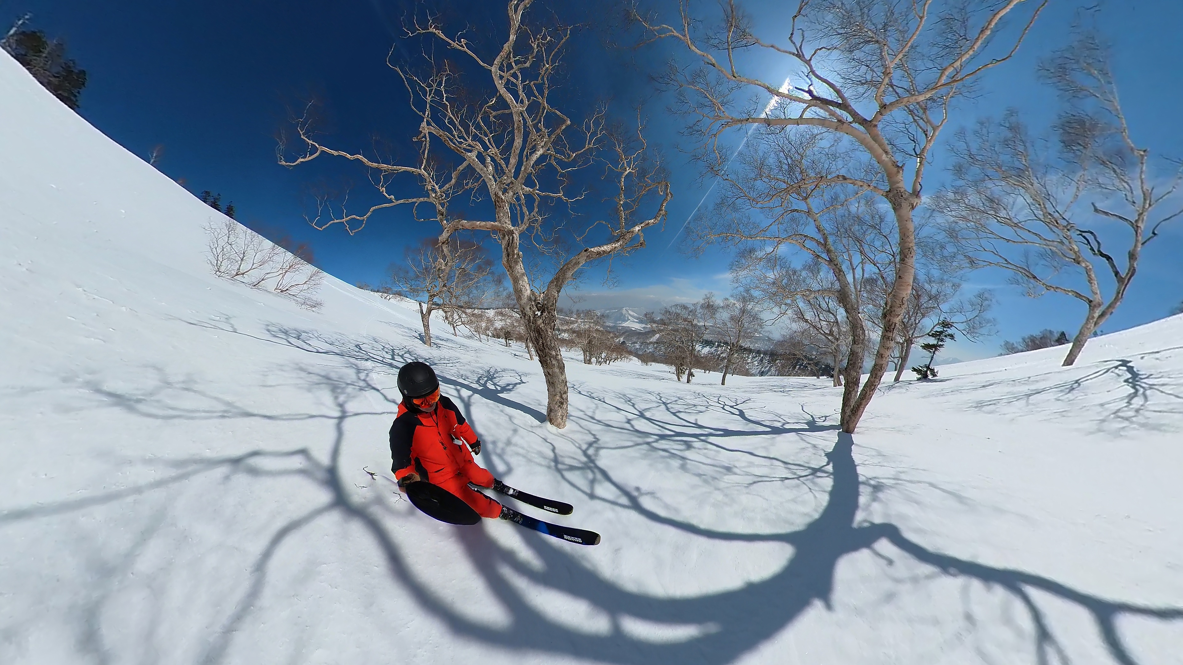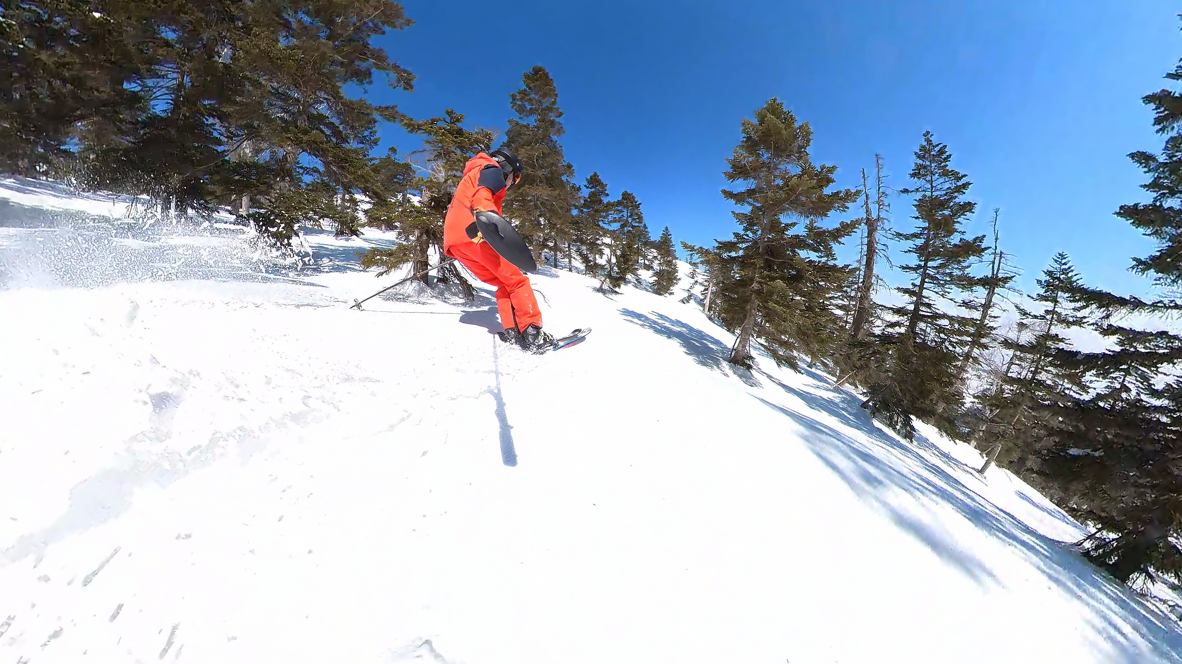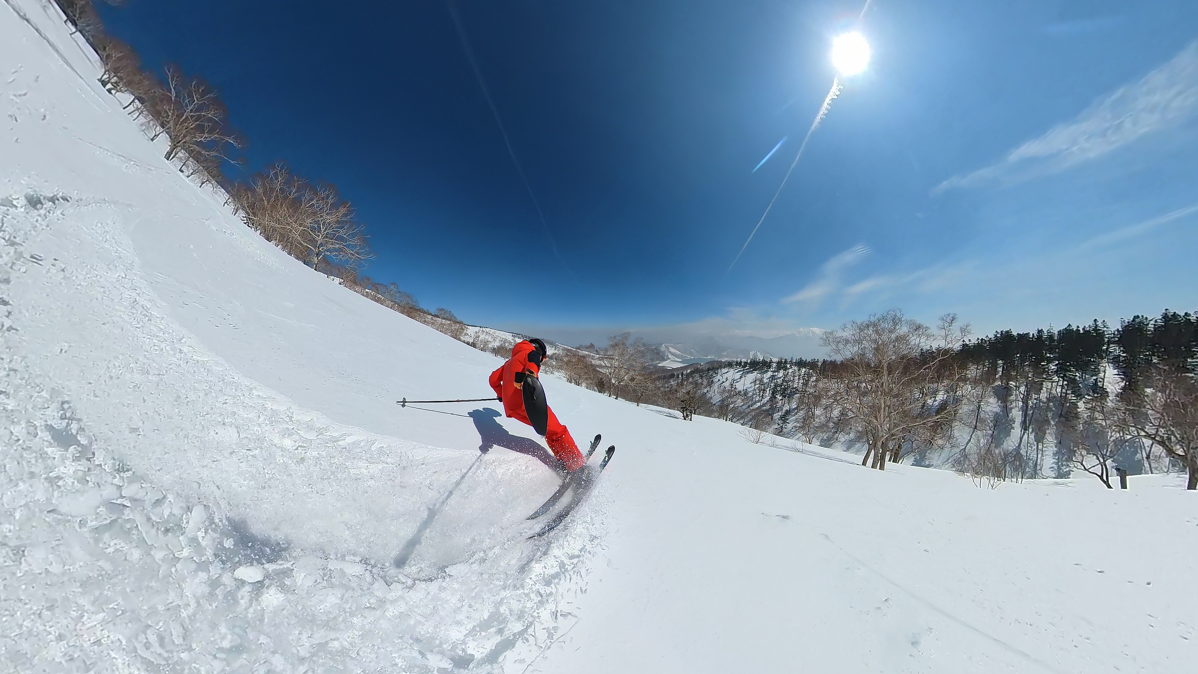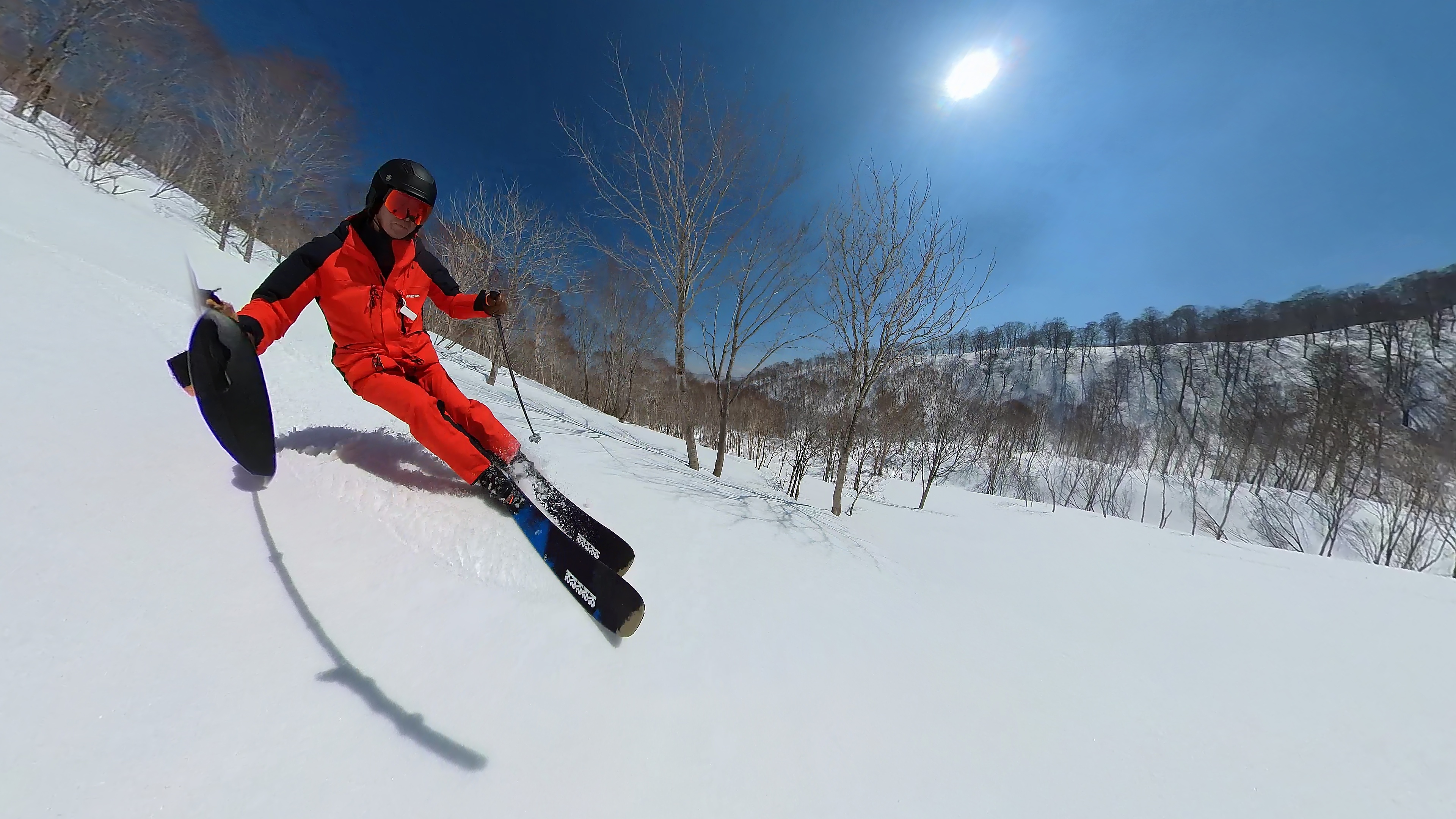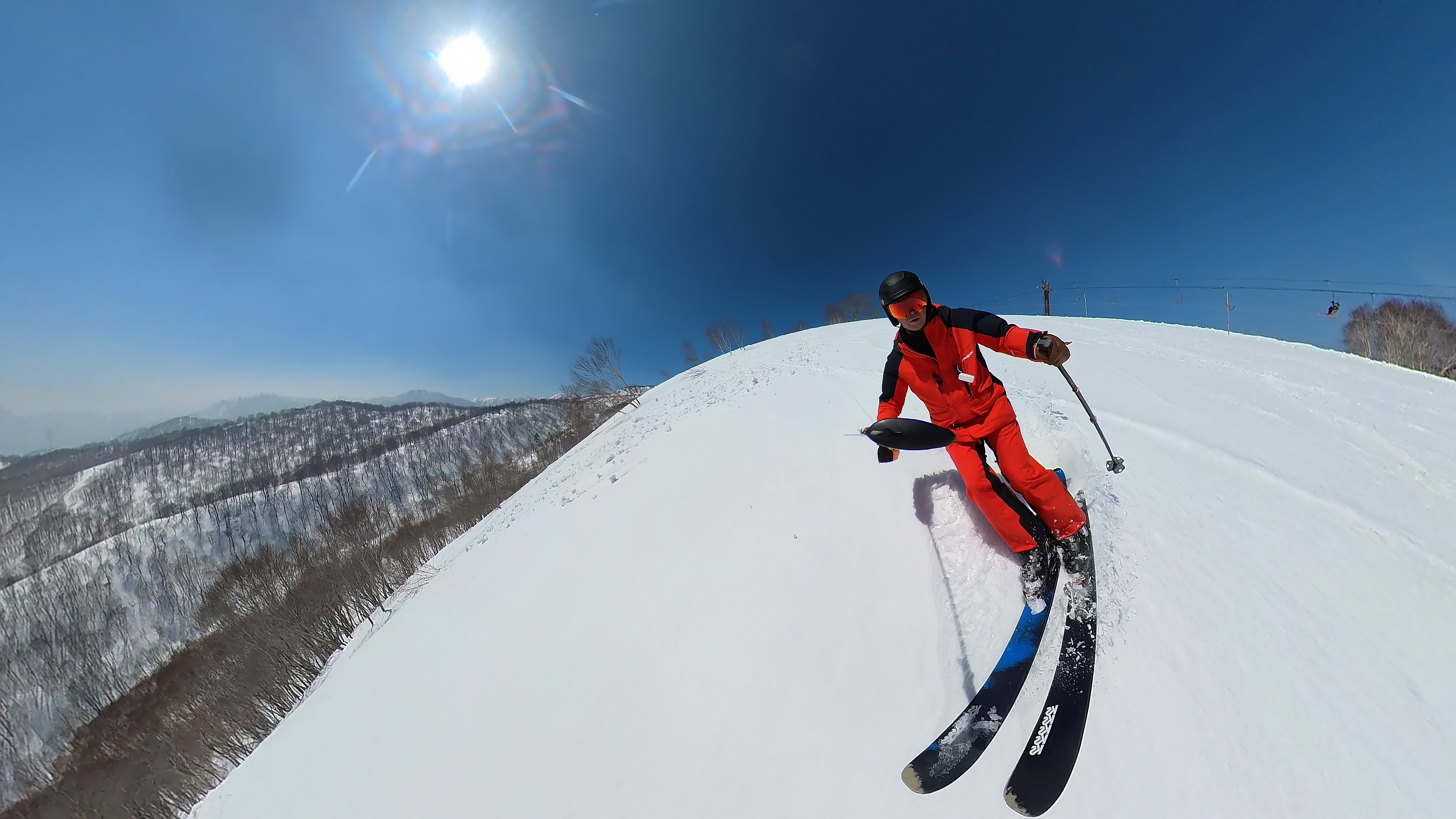 林の中はまだ昨日の降雪は残ってます。人も少ないし。ただ、だんだん気温が上がると回せなくなるかと。2本目でプラス1℃。